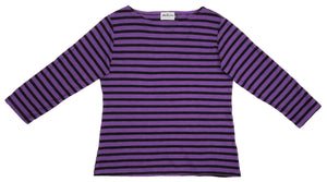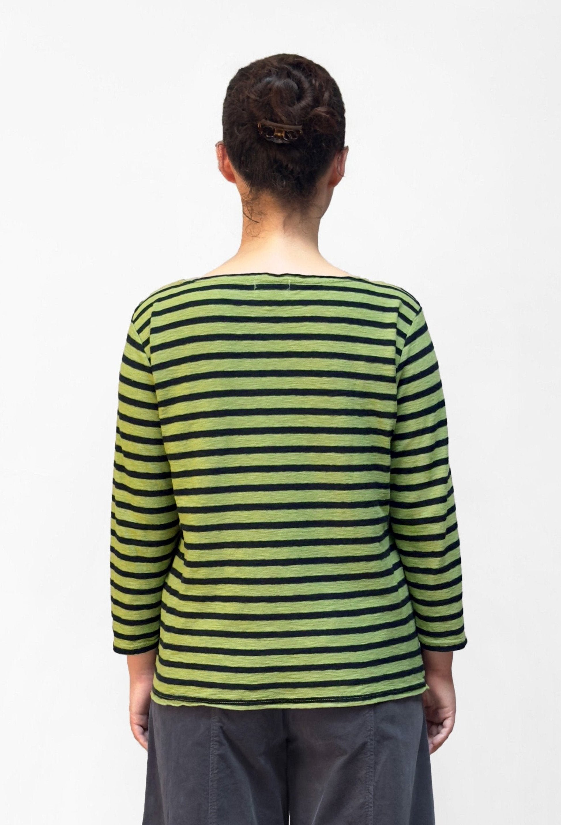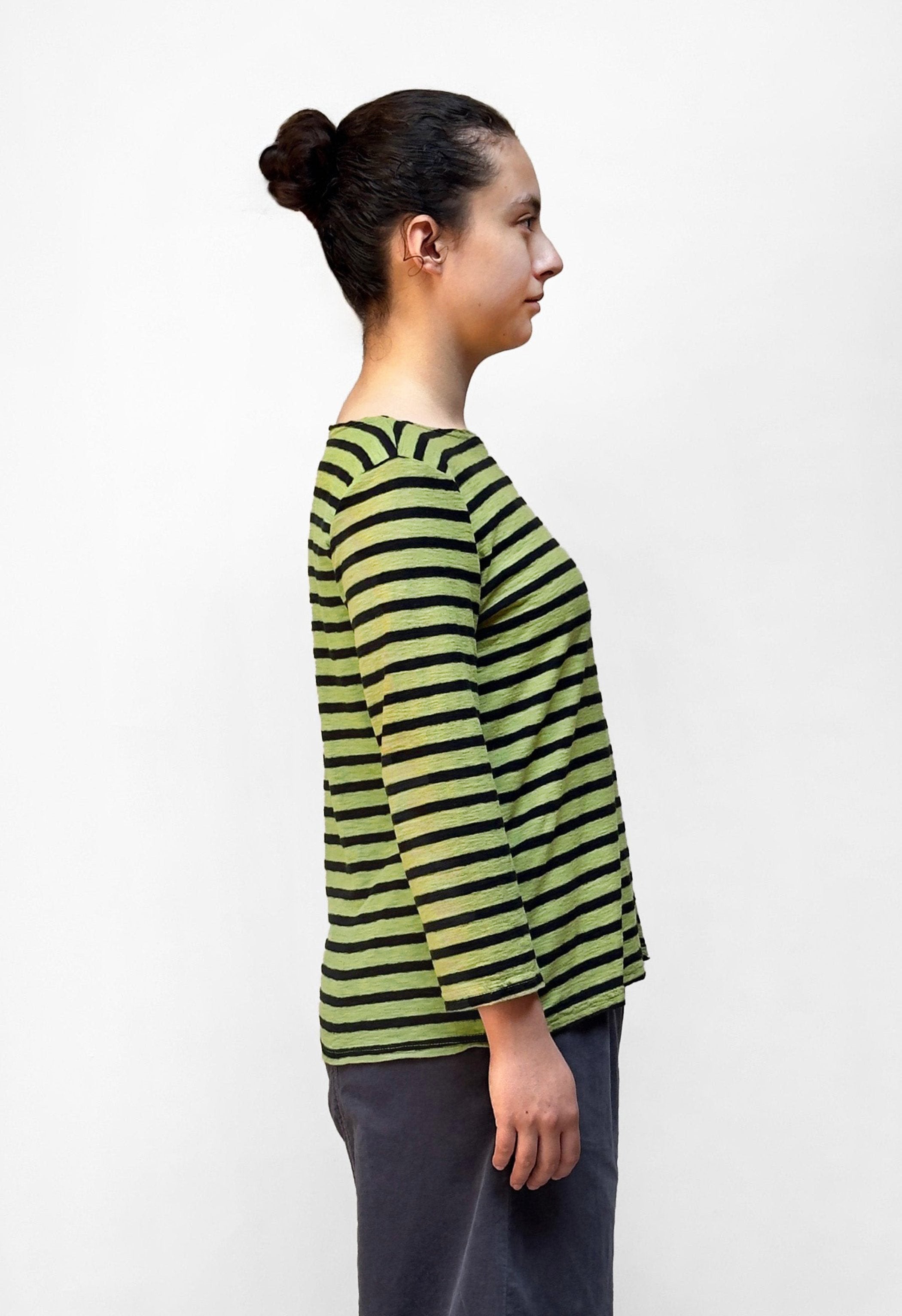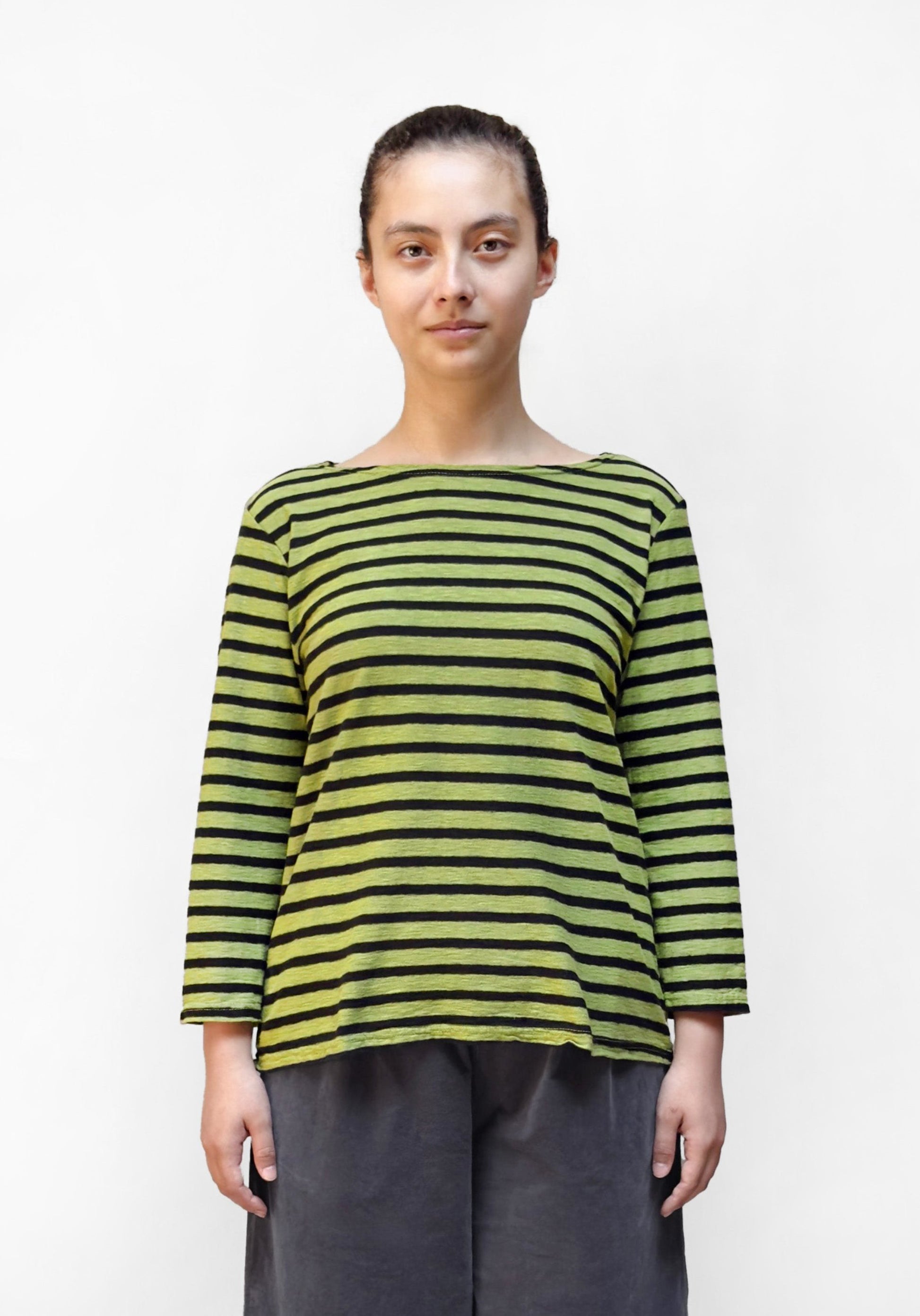 A straight-cut tee with a classic boatneck featuring black stripes. It has 3/4 sleeves and falls hip-length.