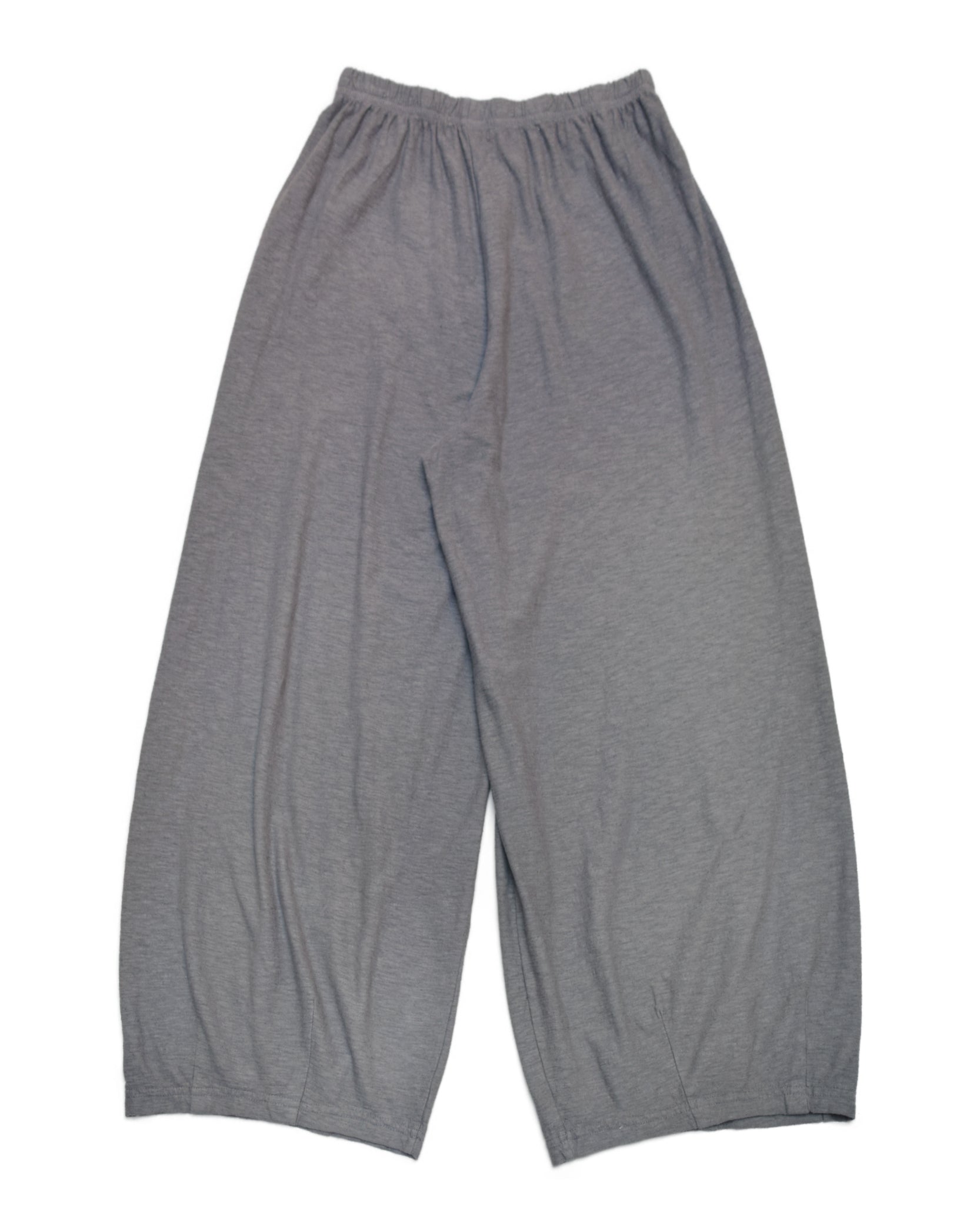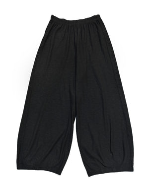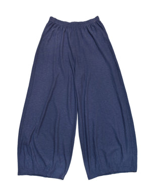 A relaxed, comfortable pant in a lightweight cotton-linen knit. It has an elastic waistband and the length is cropped just above the ankle. This fabric is refreshing in warm weather.