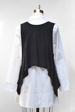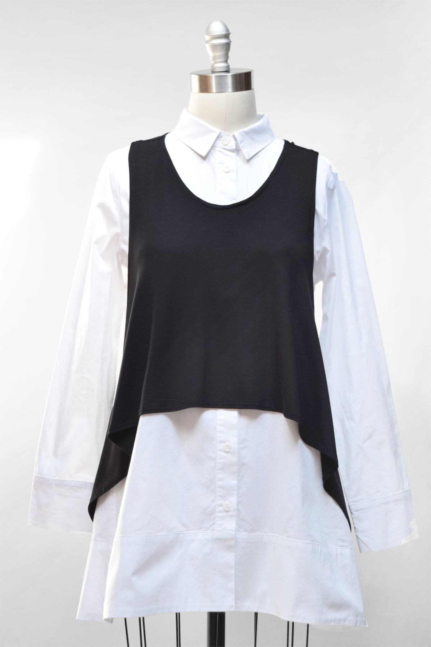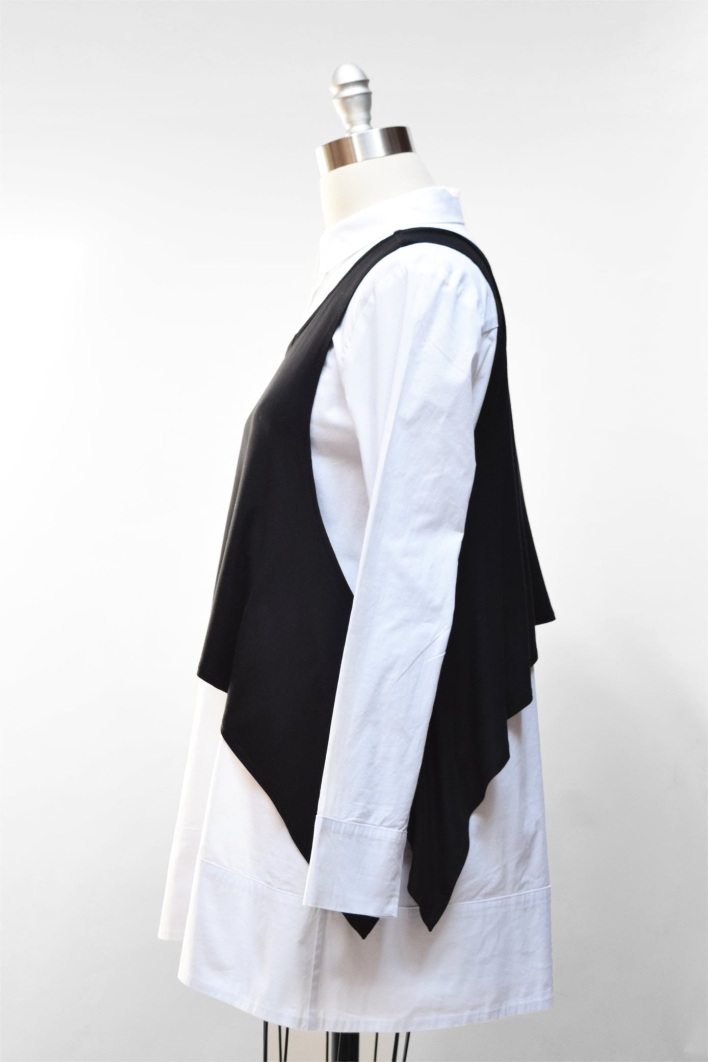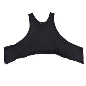A wide, open vest to layer with any outfit. It has long wings that fall and drape in a soft bamboo rayon knit. The size S is pictured and falls cropped, below the waist. Each size up is longer.