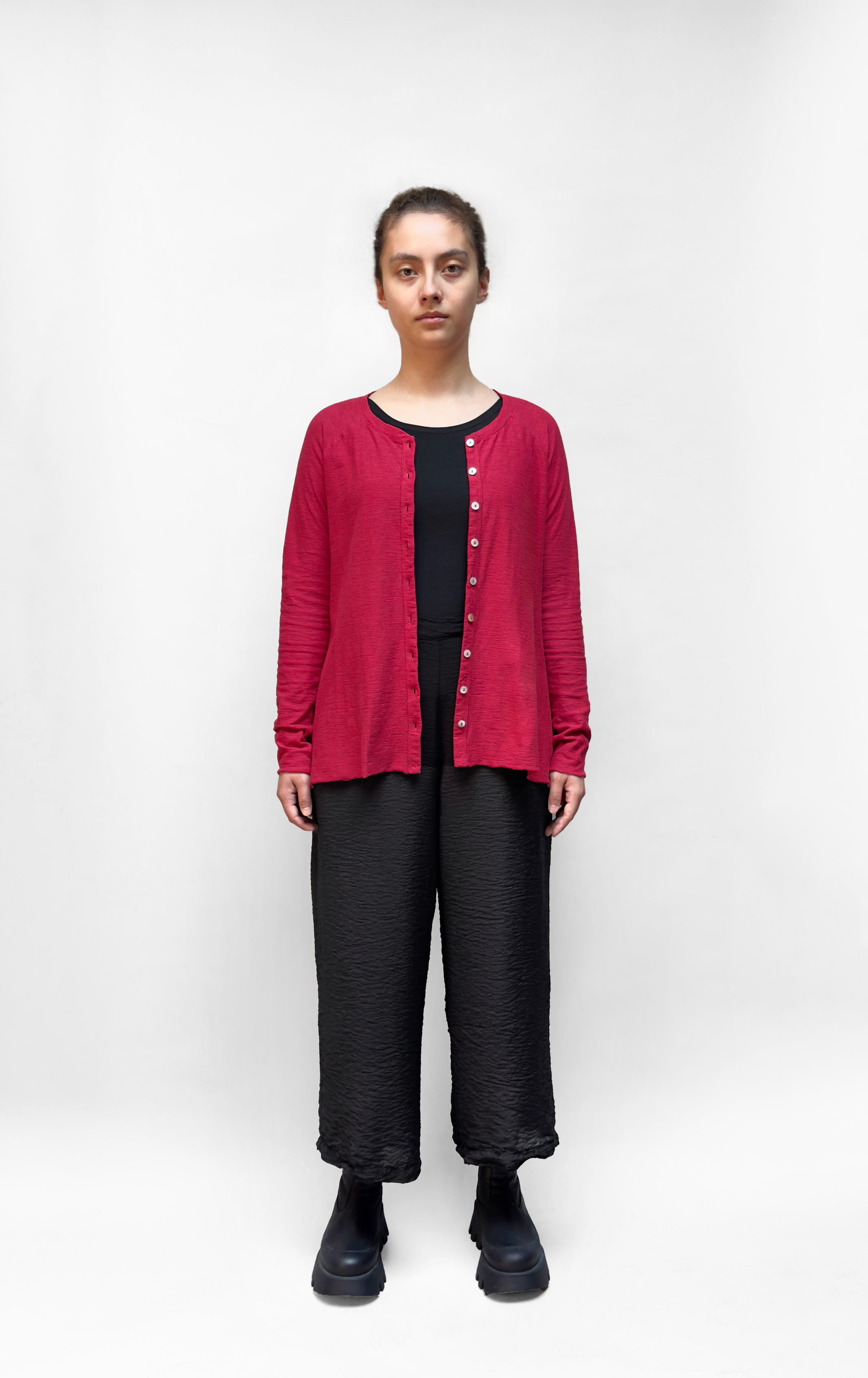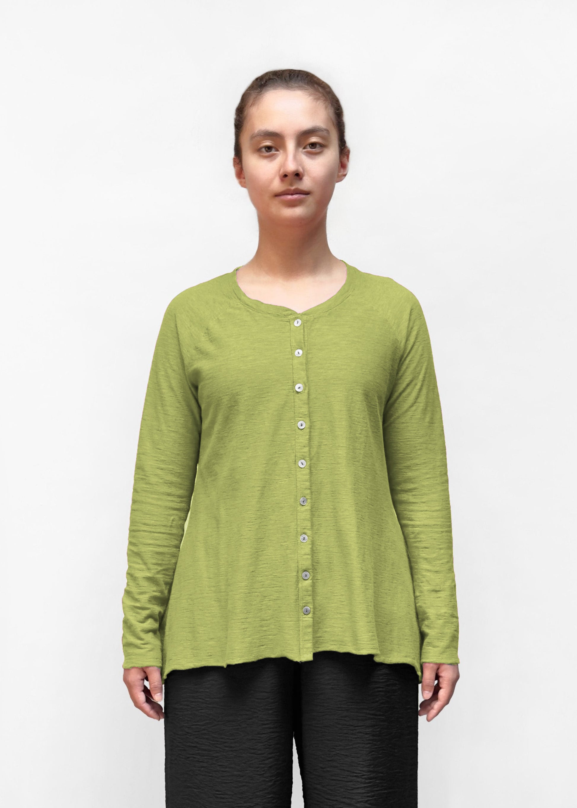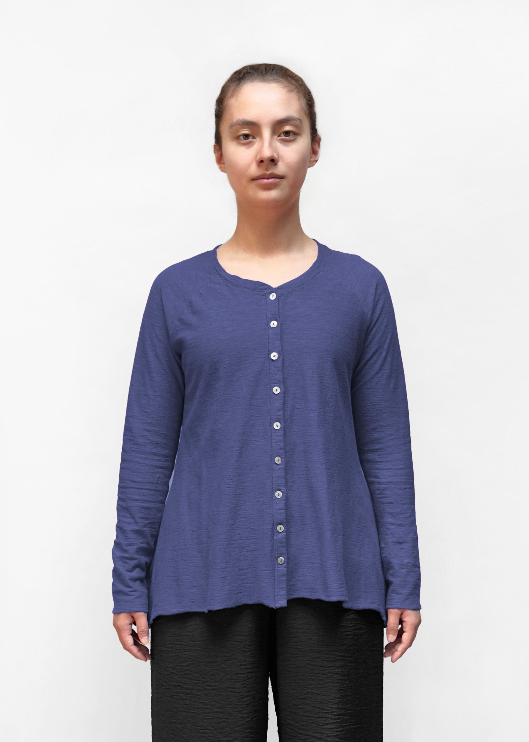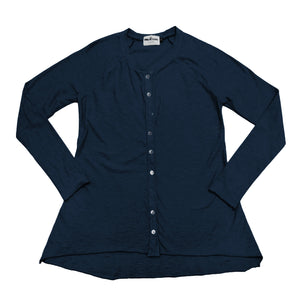 Our classic swing cardigan with a flared hem. It has fitted raglan sleeves and a high collar. The buttons are mother-of-pearl.