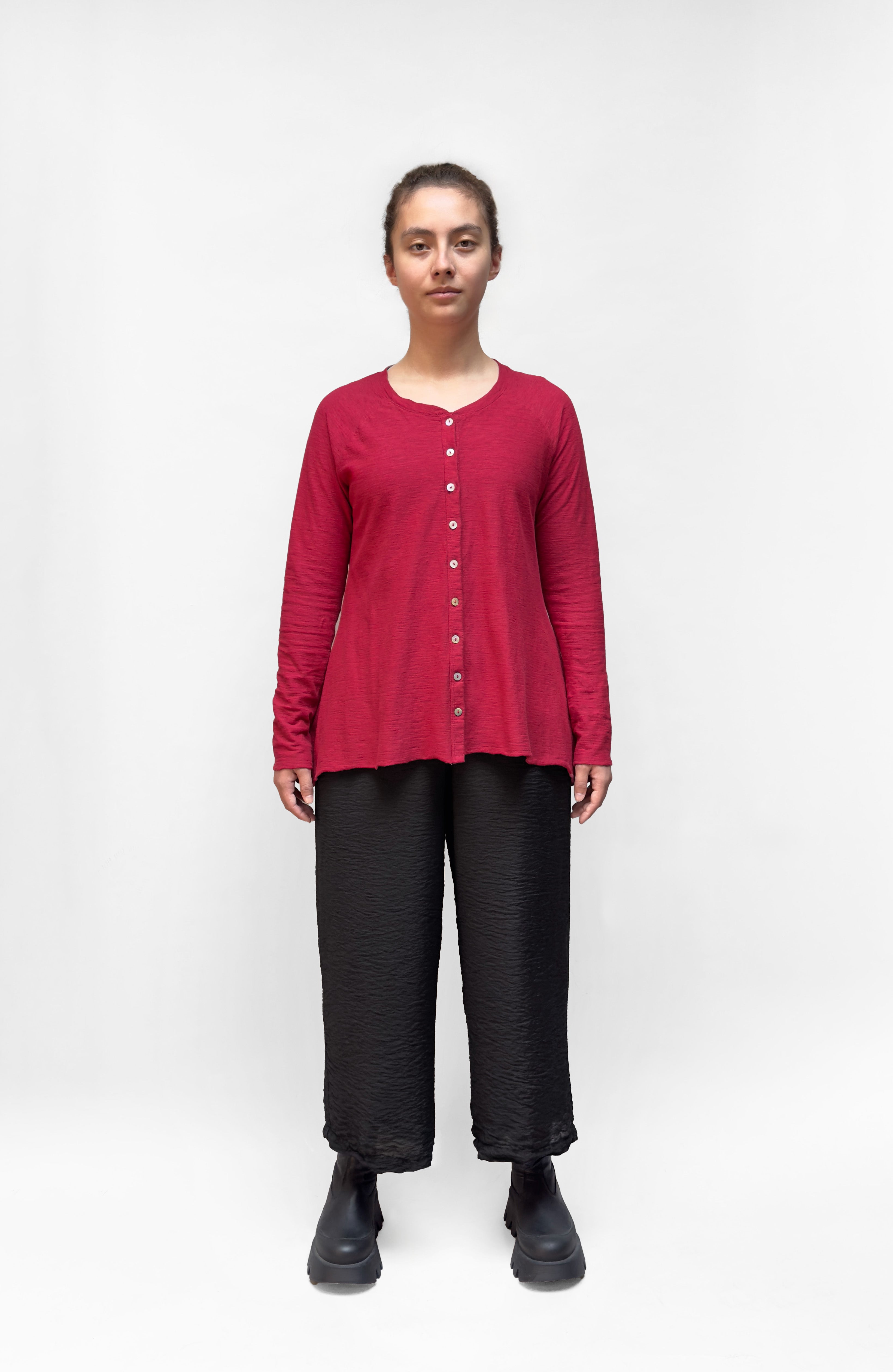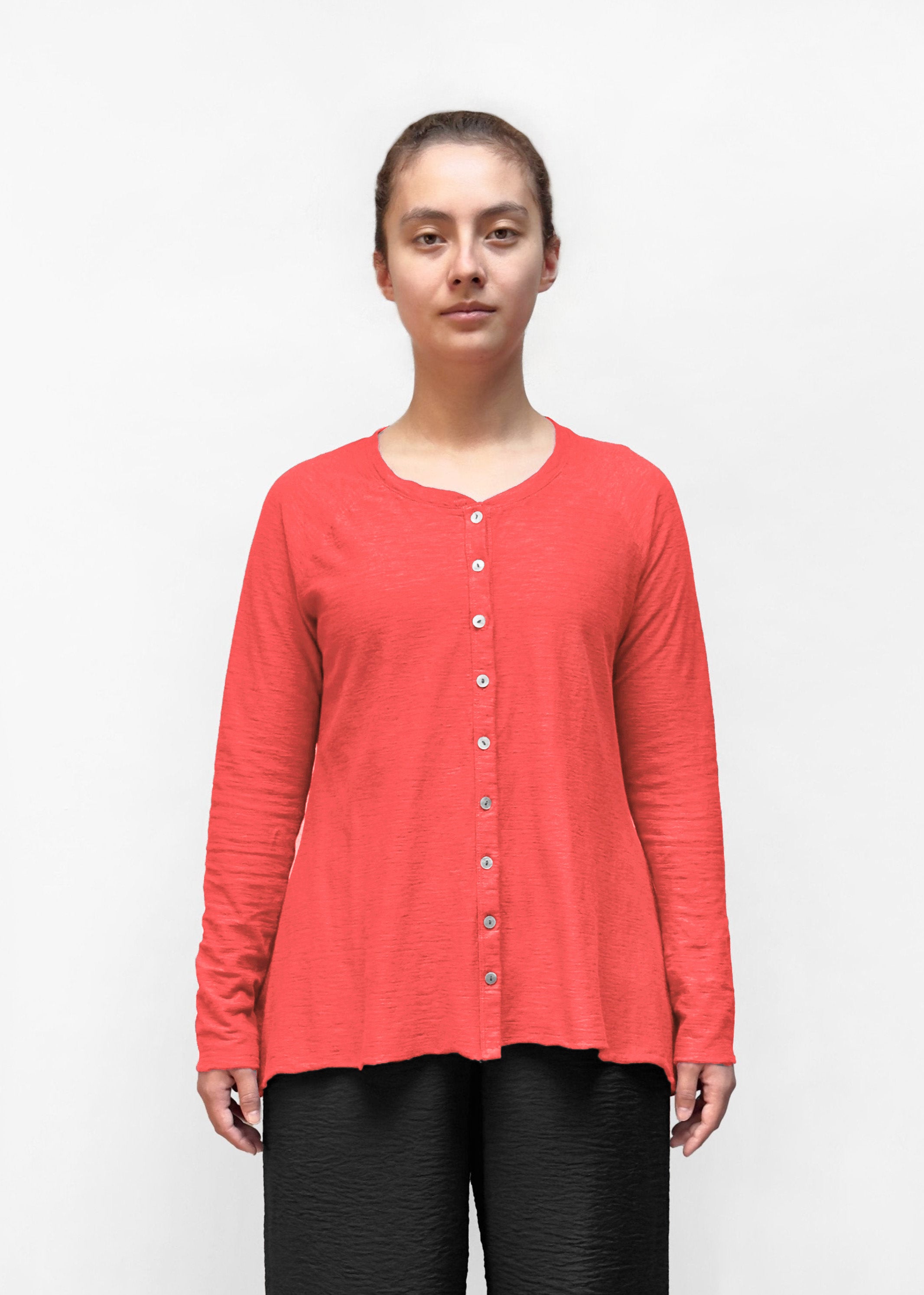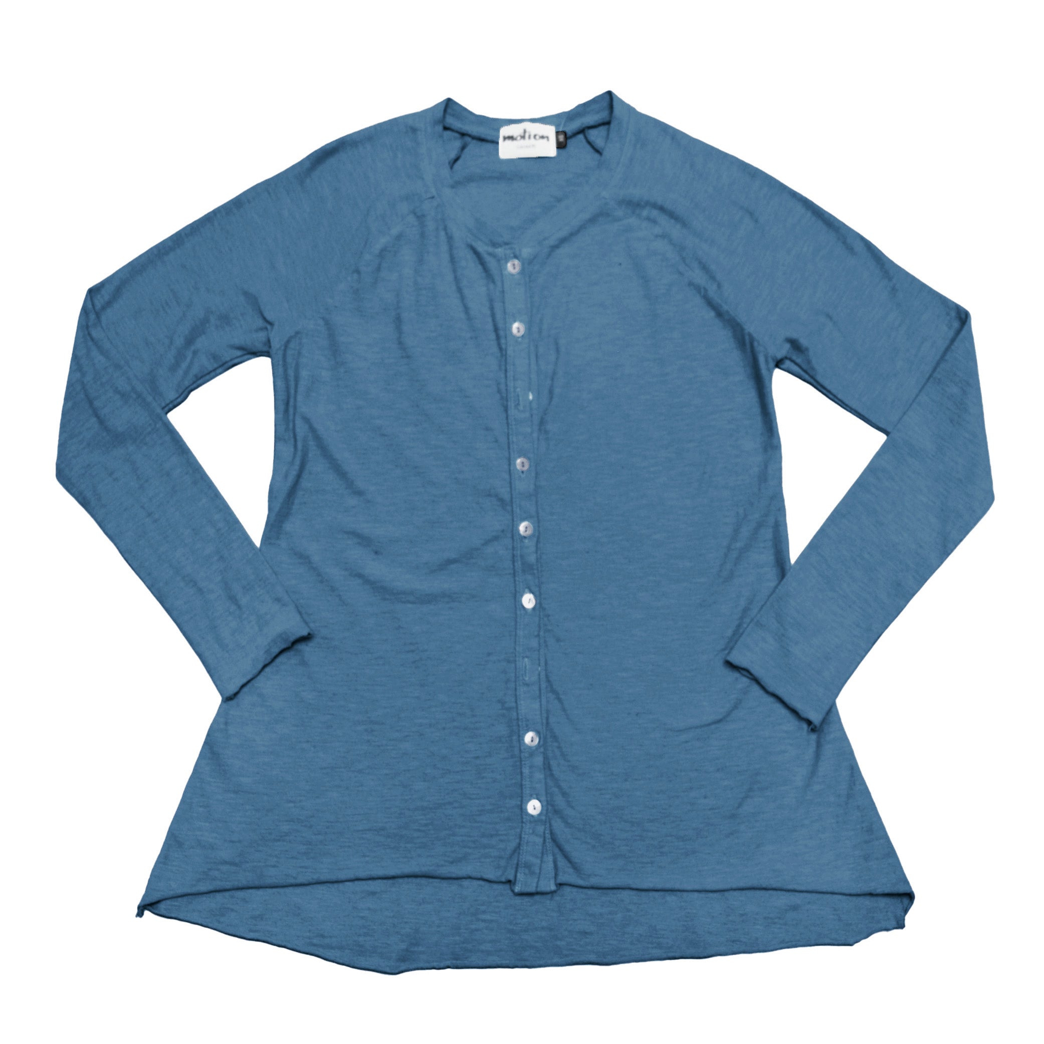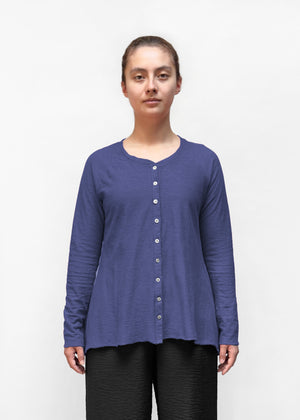 Our classic swing cardigan with a flared hem. It has fitted raglan sleeves and a high collar. The buttons are mother-of-pearl.