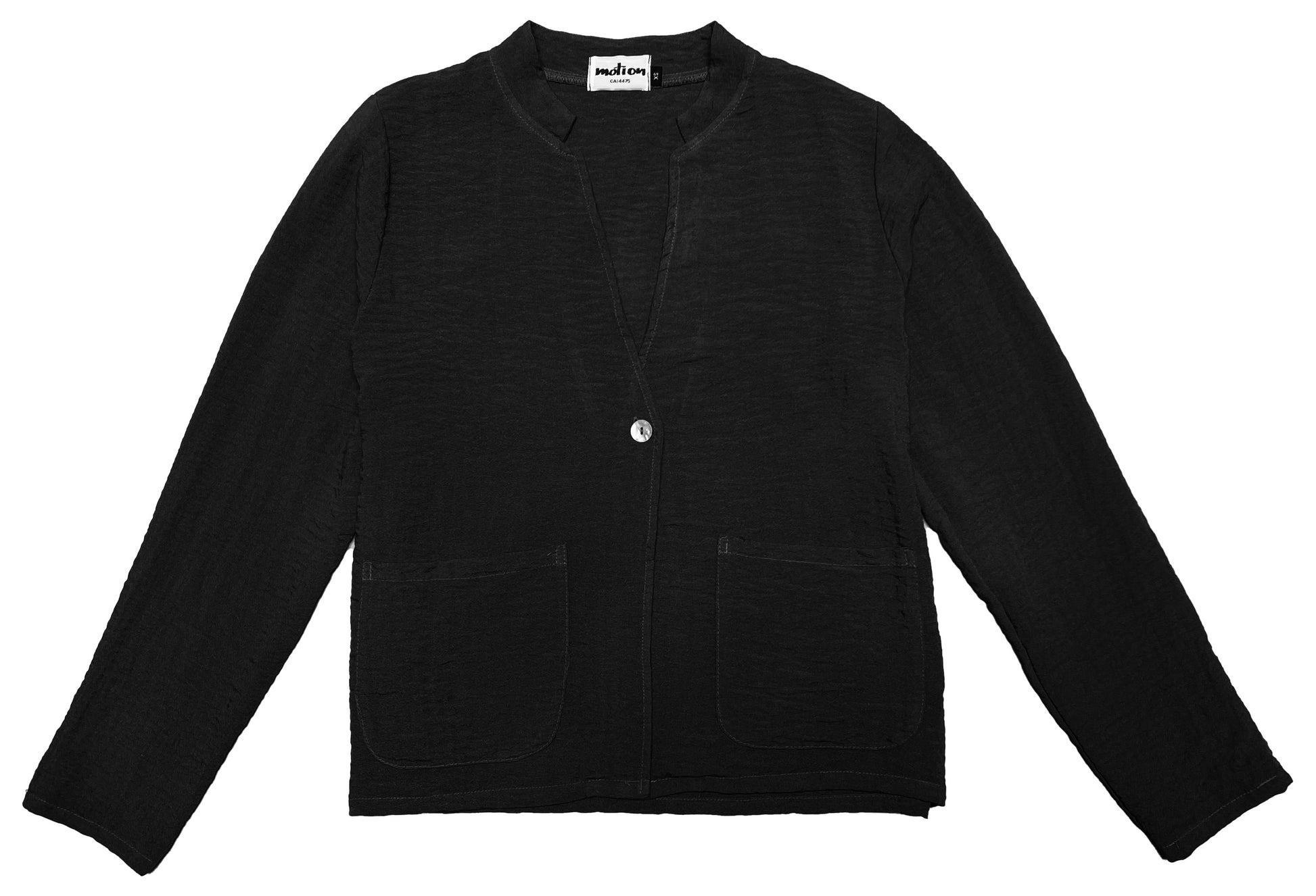 The MOTION one button jacket is the perfect blend of simplicity and style. With a one button closure, stand-up collar and two front pockets, this jacket is both comfortable and functional. It has long sleeves for extra coverage on breezy days. The classic look of this jacket is perfect for any occasion.