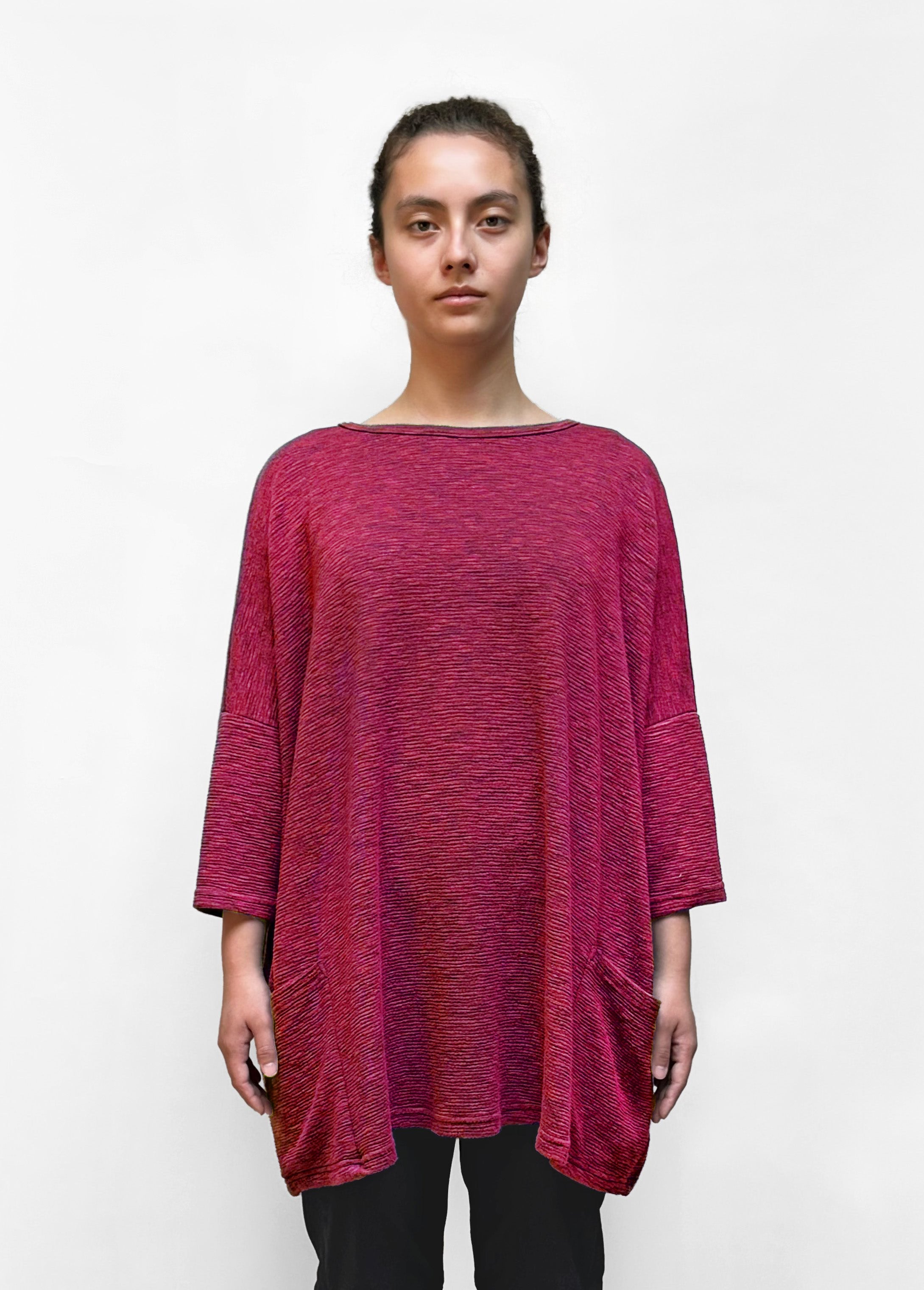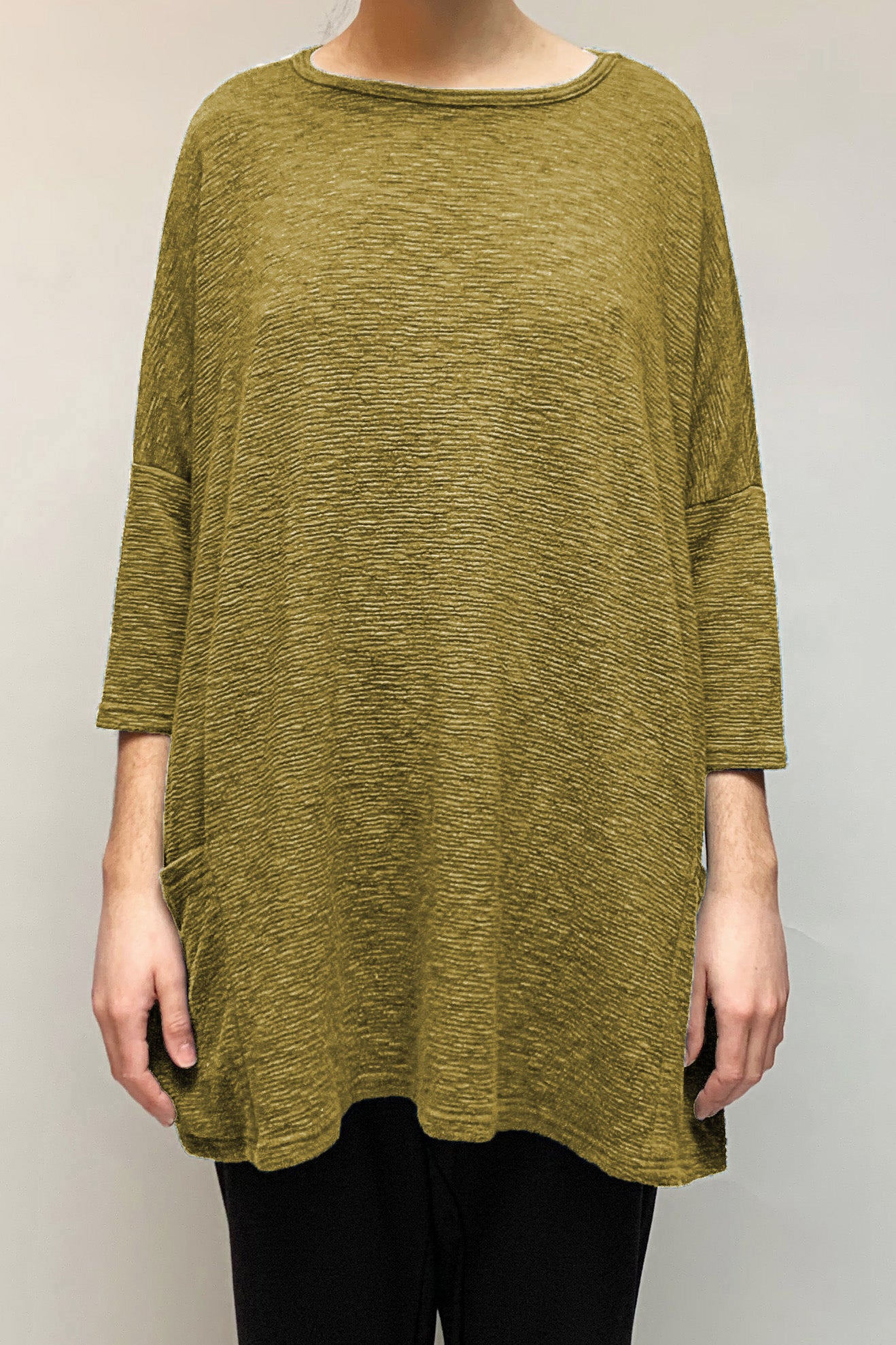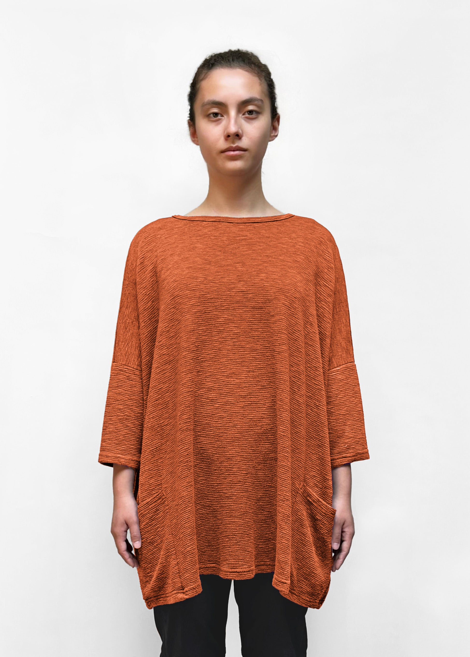 A relaxed, onesize top in comfortable textured knit. This top falls tunic-length with 3/4 sleeves. It has two front pockets and a round neckline.