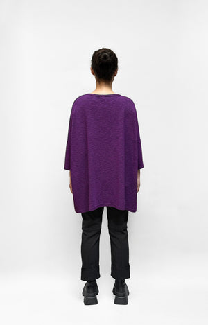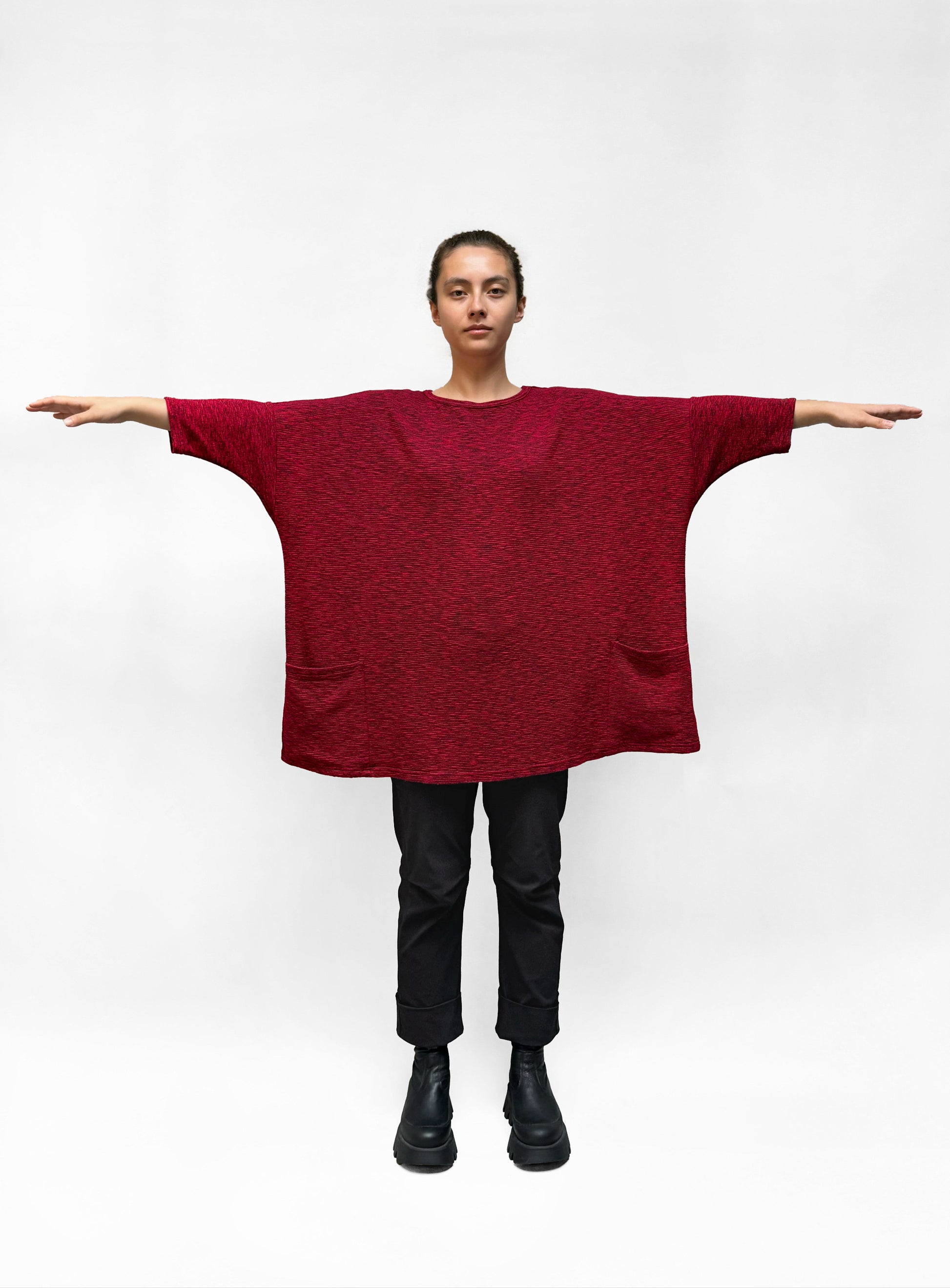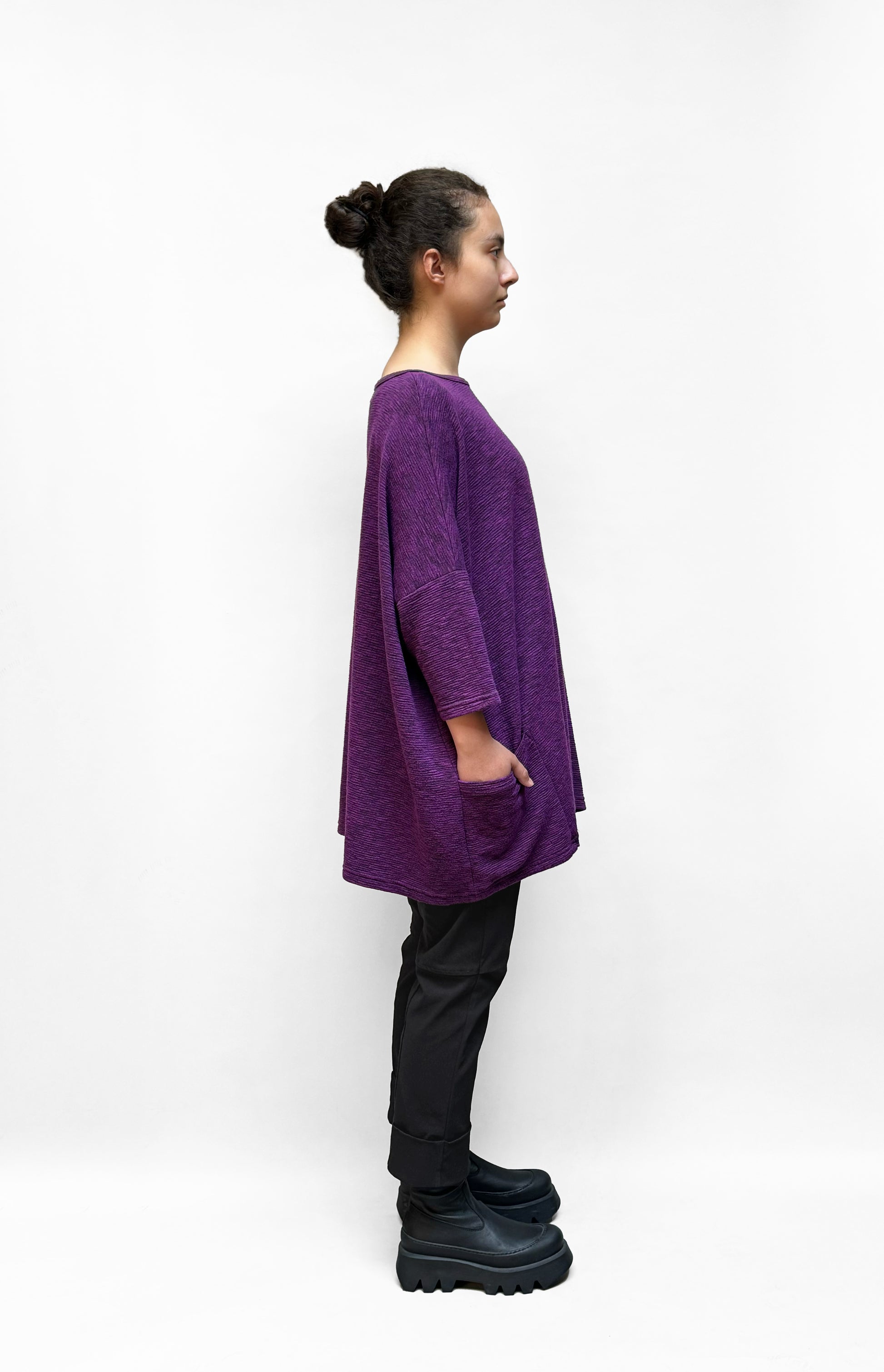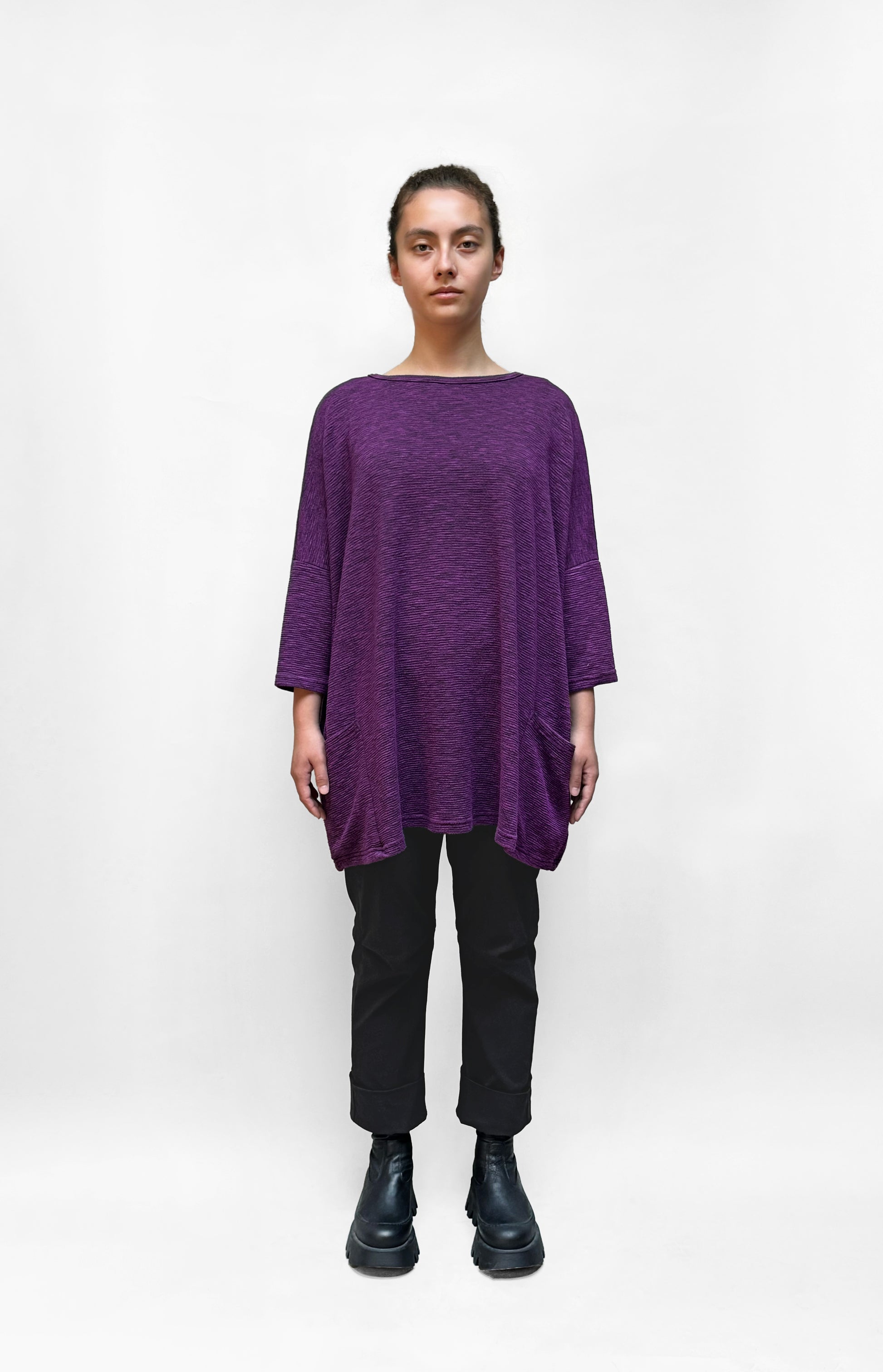 A relaxed, onesize top in comfortable textured knit. This top falls tunic-length with 3/4 sleeves. It has two front pockets and a round neckline.