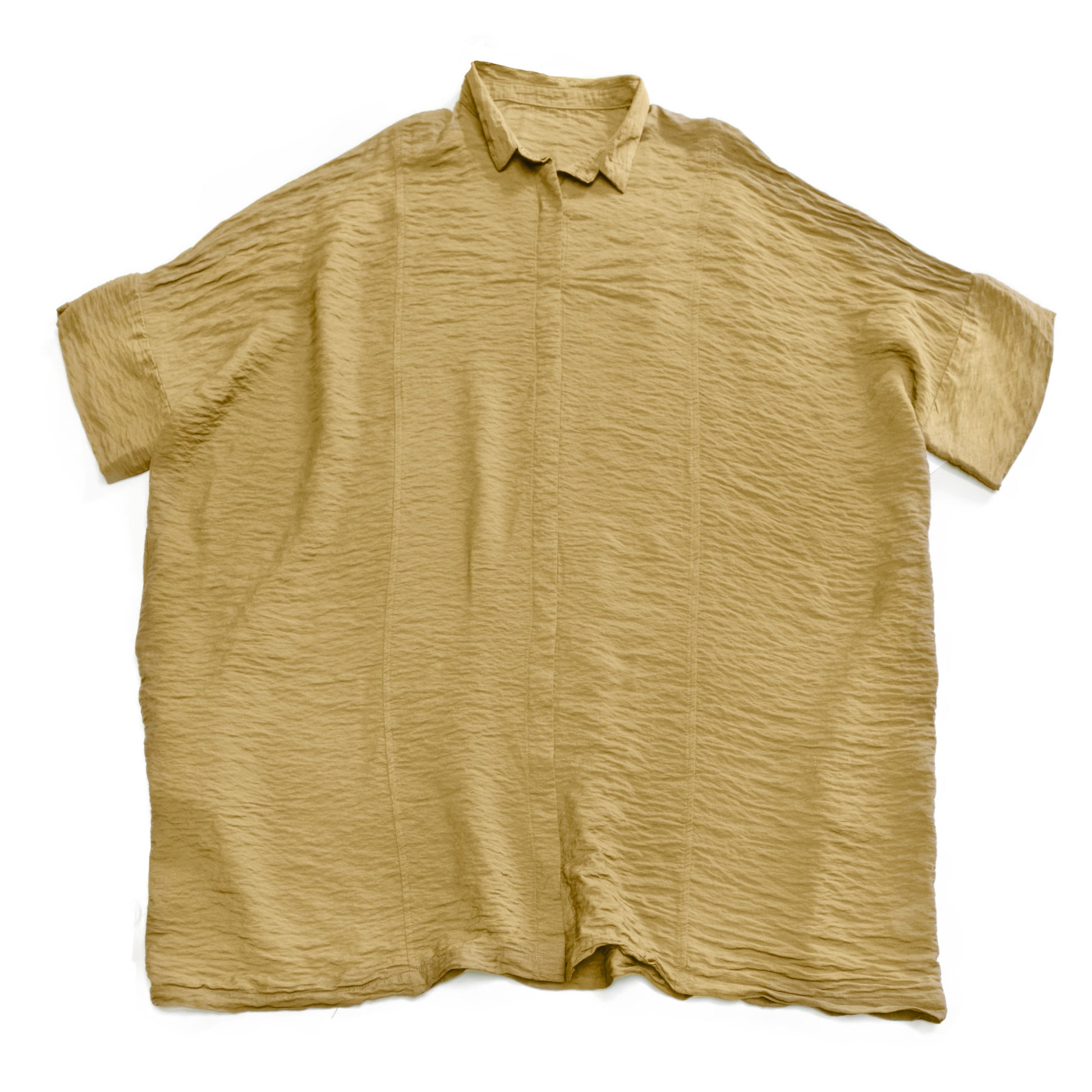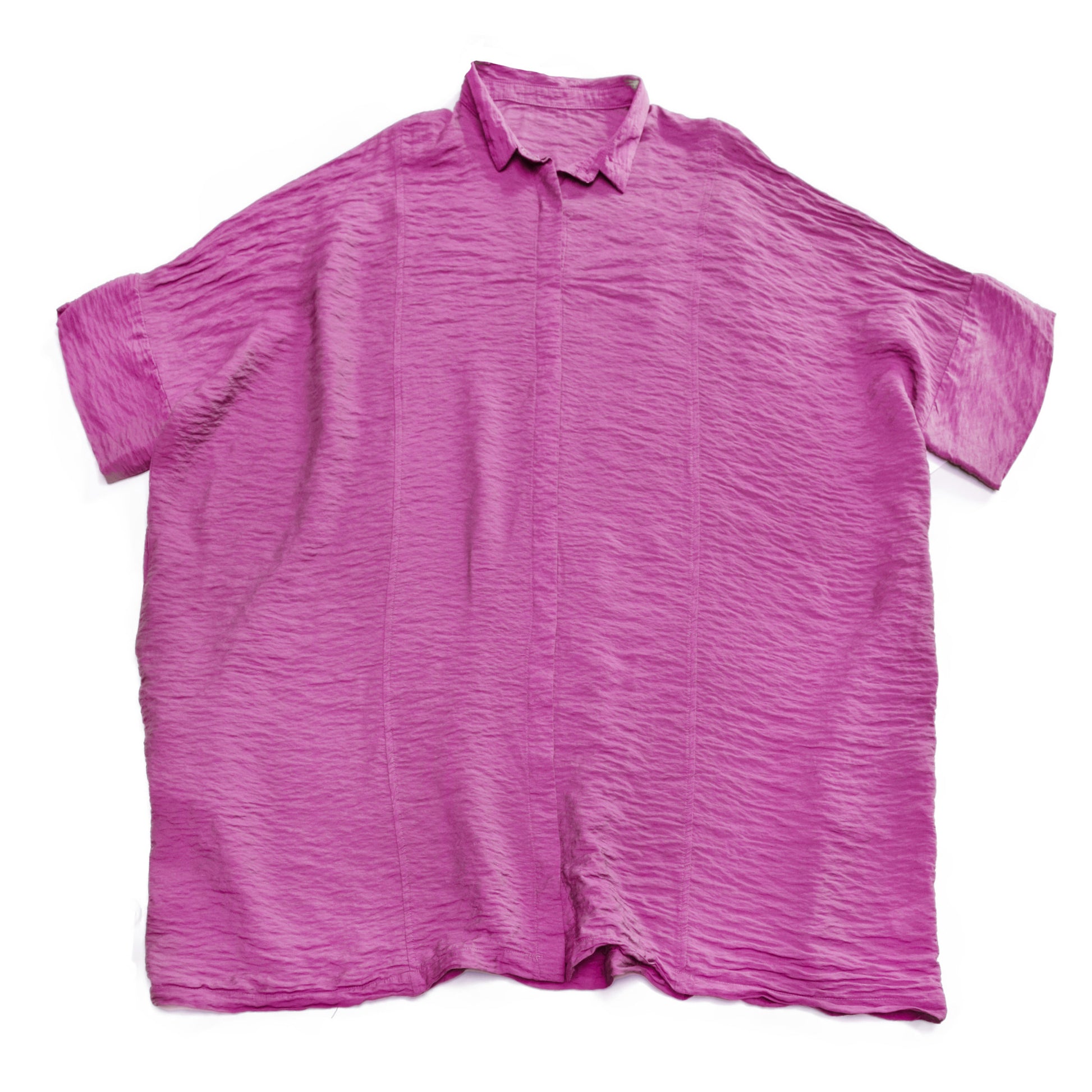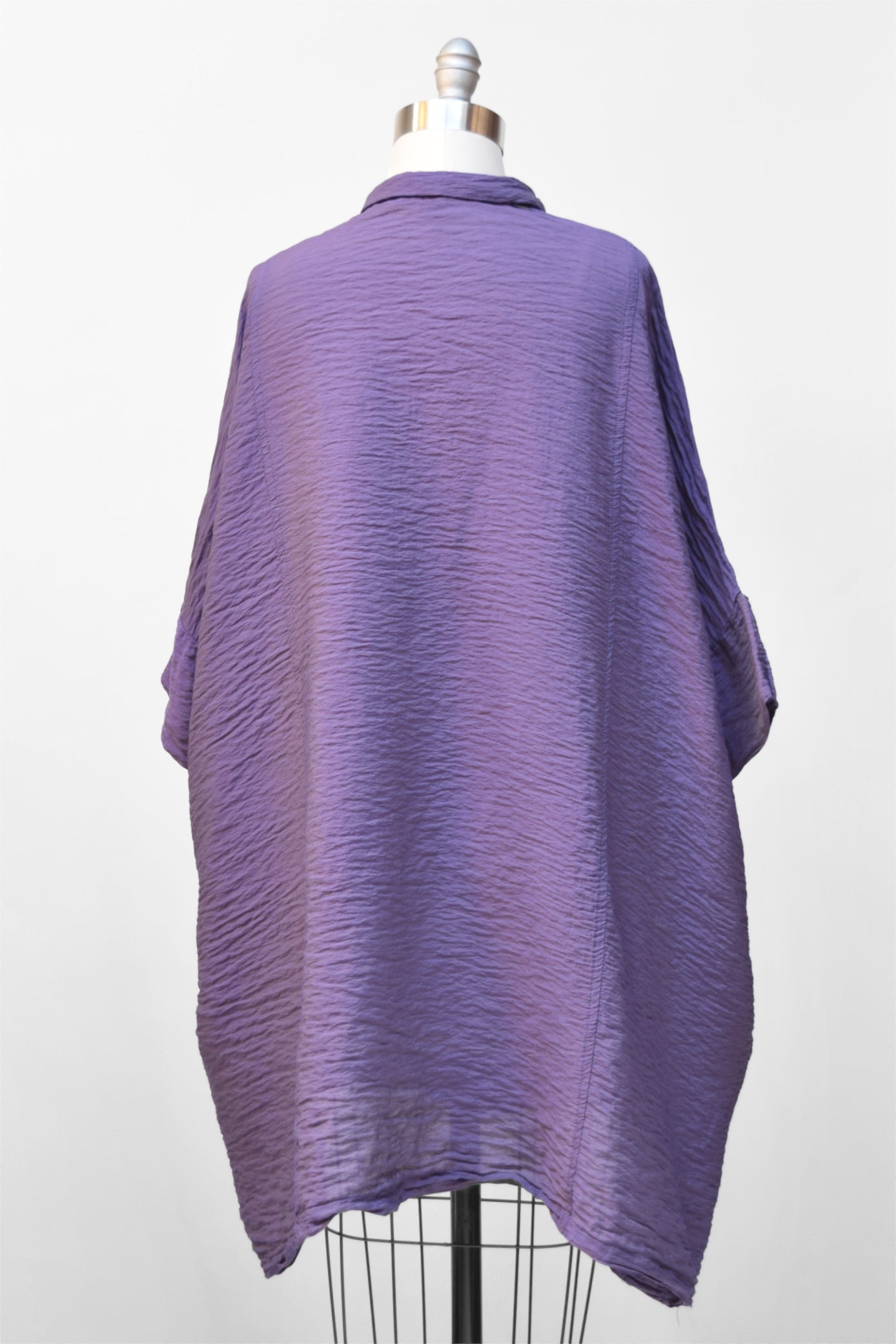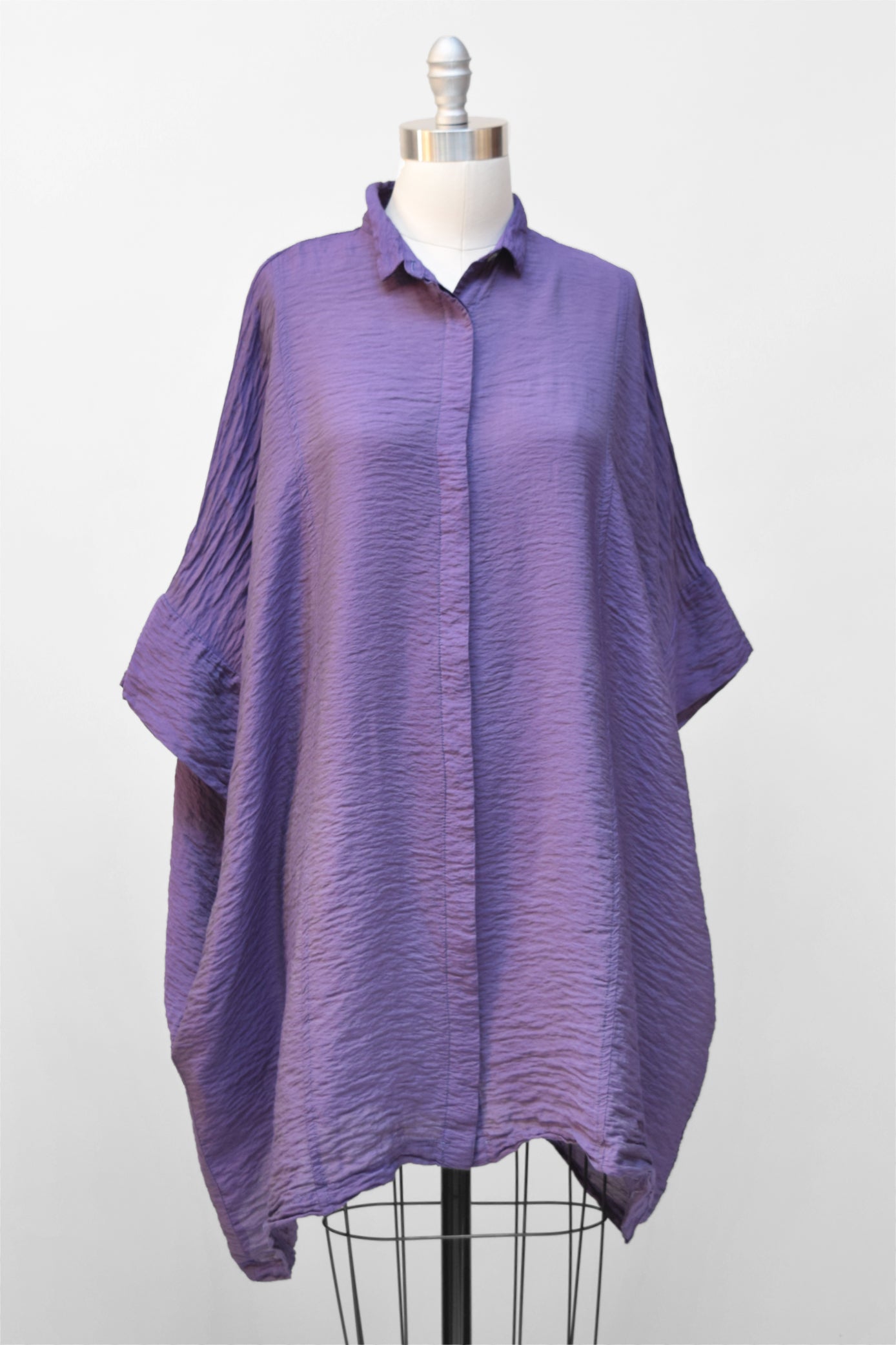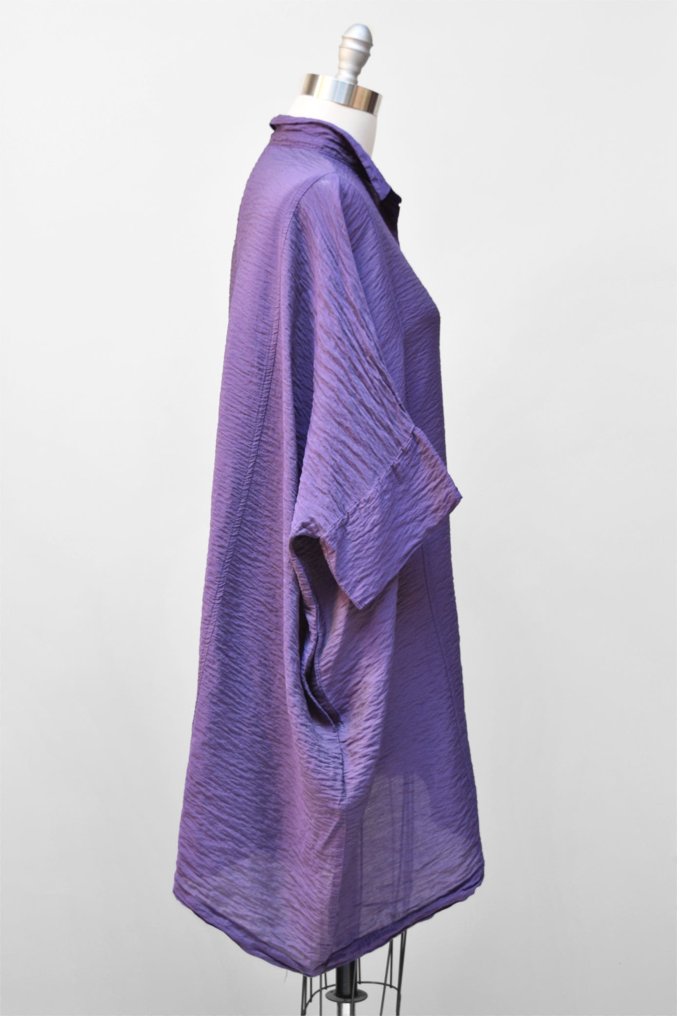 An oversized shirt dress in a lightweight parachute rayon. It has buttons down the front, side seam pockets, and a short collar. It falls just above the knee in length, and the sleeves fall 3/4 length.