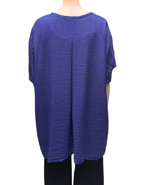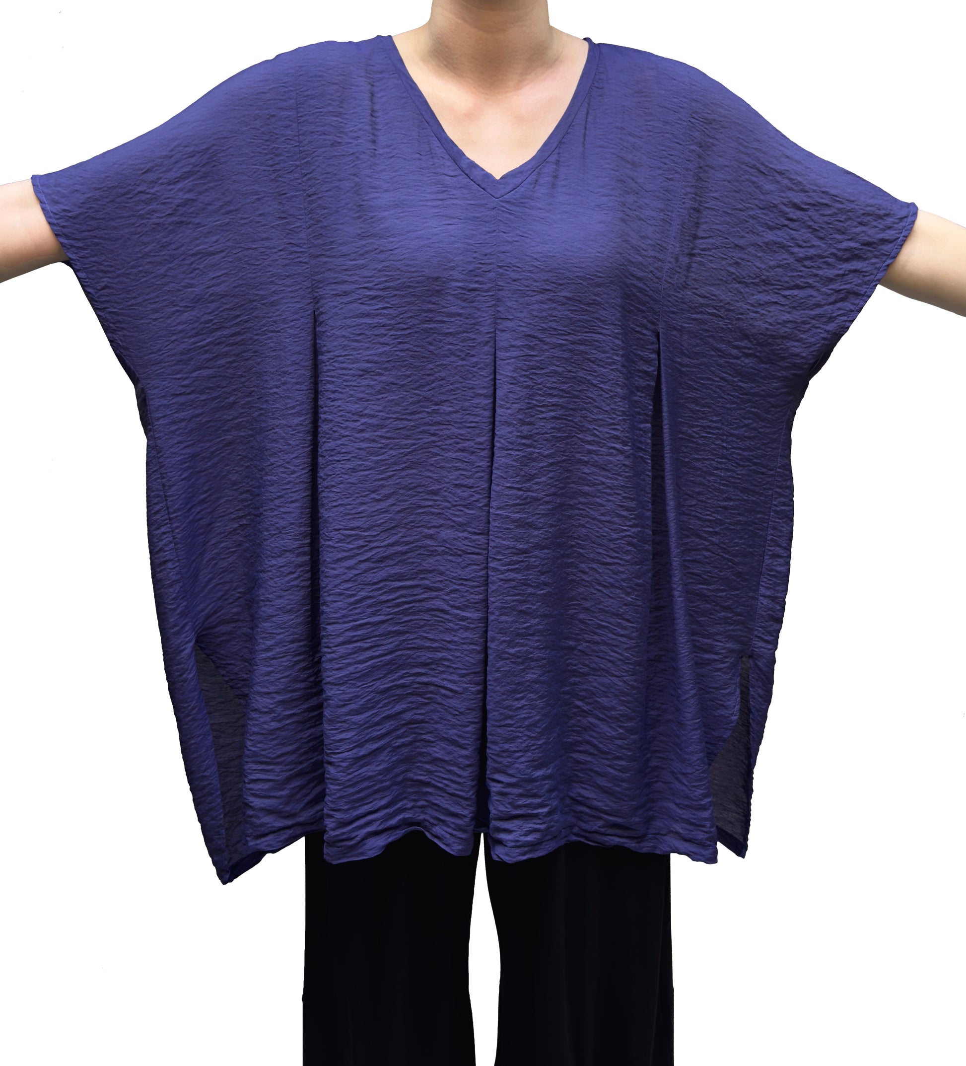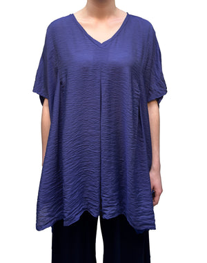 The perfect tunic for hot weather! This piece features 4 box pleats, 3 in front and 1 in the back, a relaxed cut, a slight A-line silhouette, and side slits. The back of the top falls slightly longer than the front. The V-neck adds a nice touch and features dropped shoulders and short cap sleeves. The parachute fabric is naturally crinkled and easy-care.
