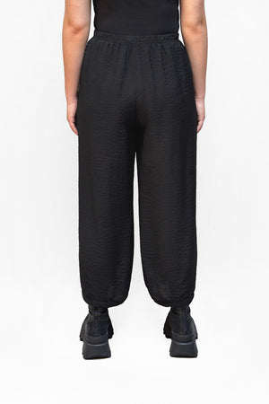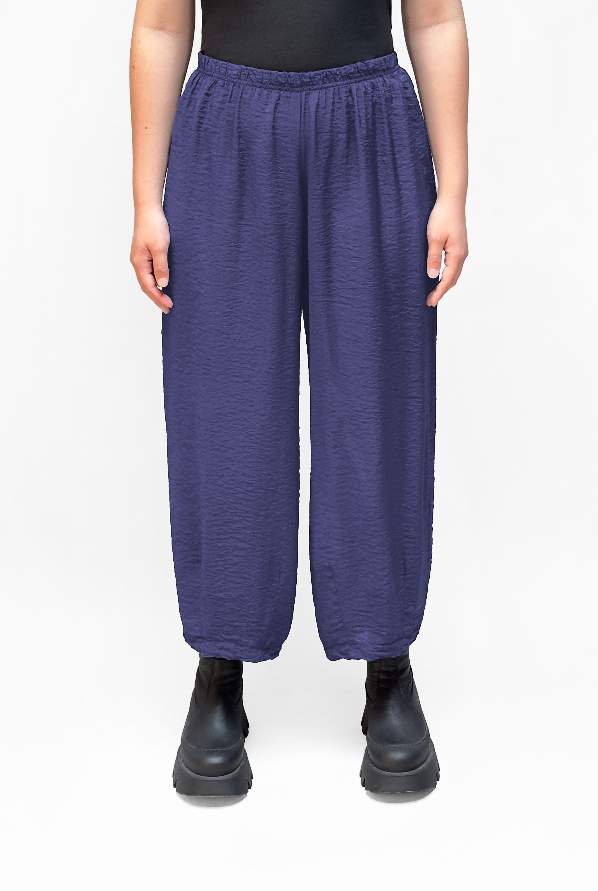 A relaxed, comfortable pant in a lightweight parachute rayon. It has an elastic waistband and the length is cropped just above the ankle. This fabric is refreshing in very hot weather.