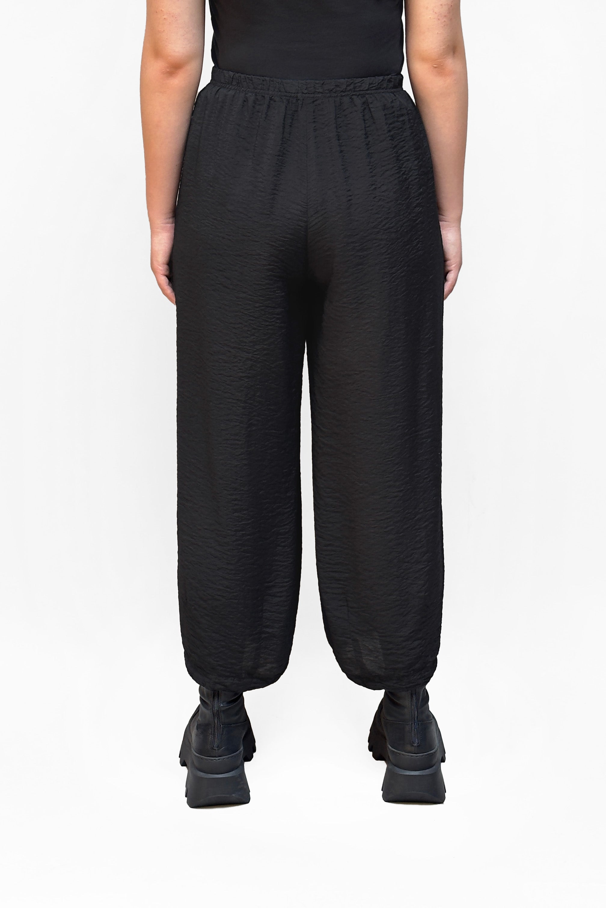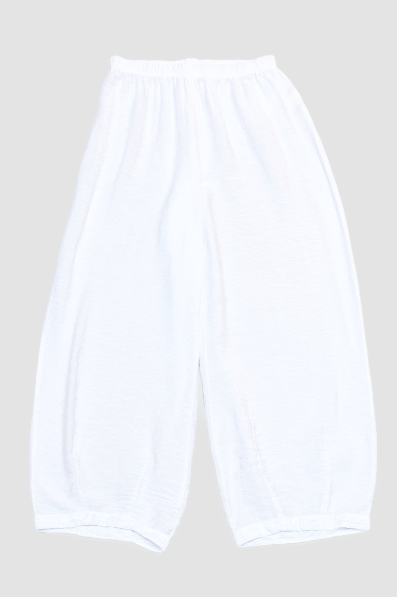 A relaxed, comfortable pant in a lightweight parachute rayon. It has an elastic waistband and the length is cropped just above the ankle. This fabric is refreshing in very hot weather.