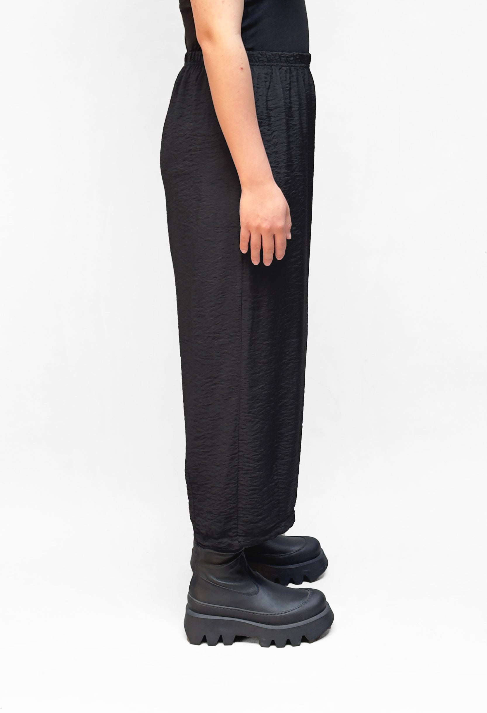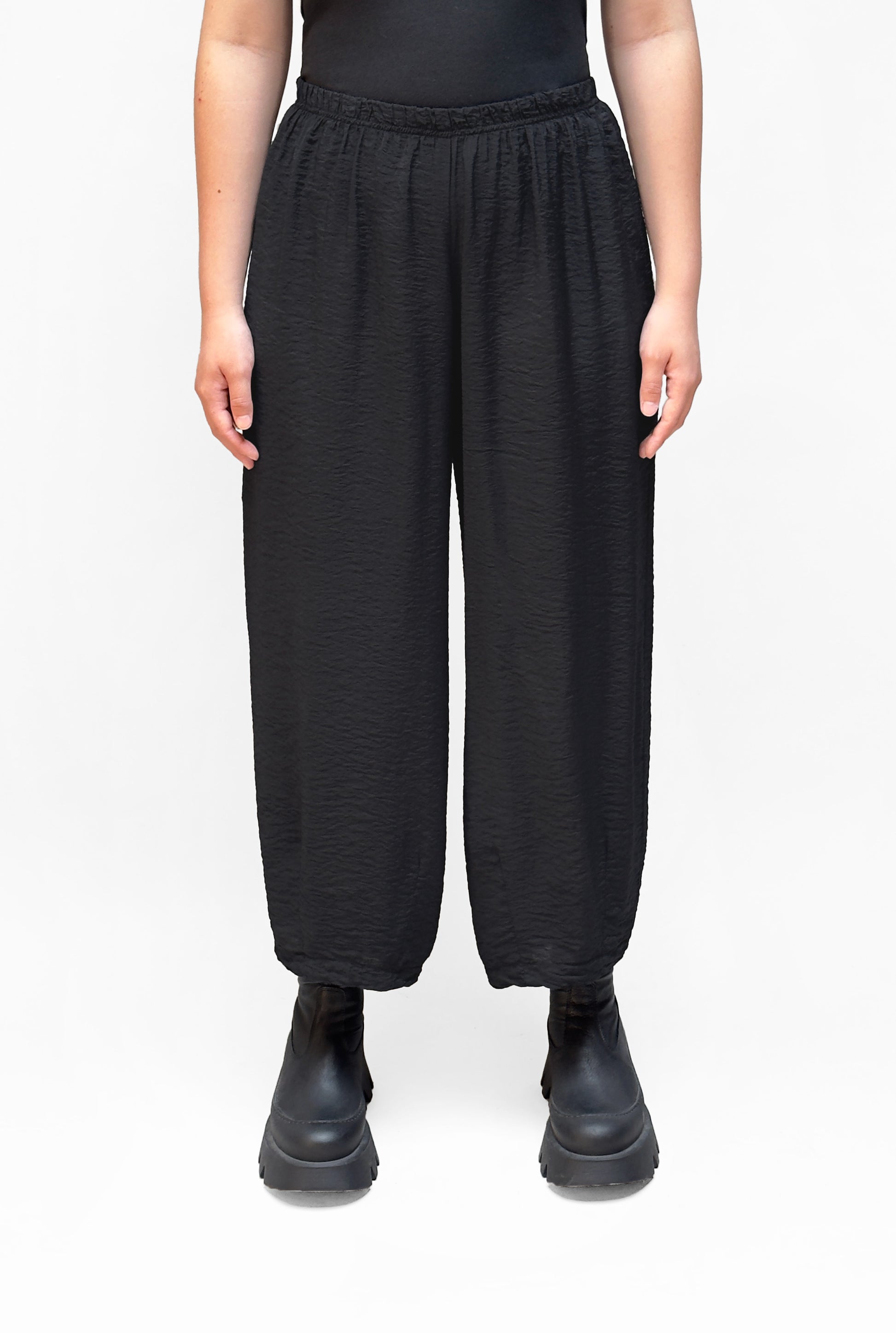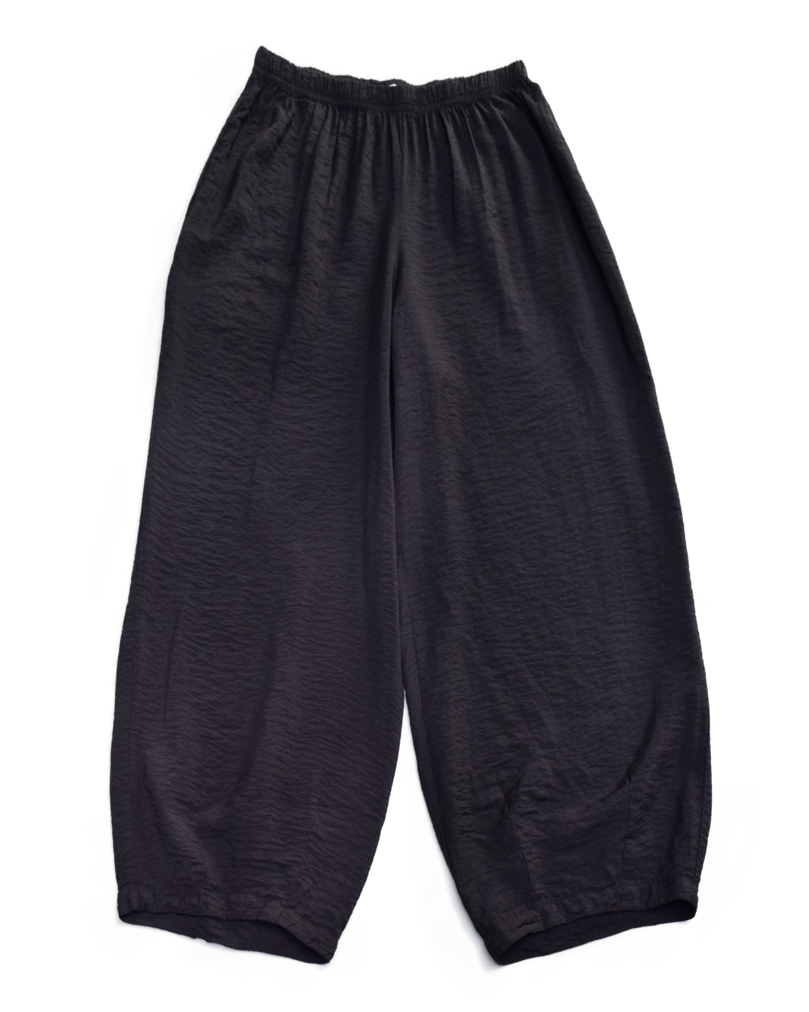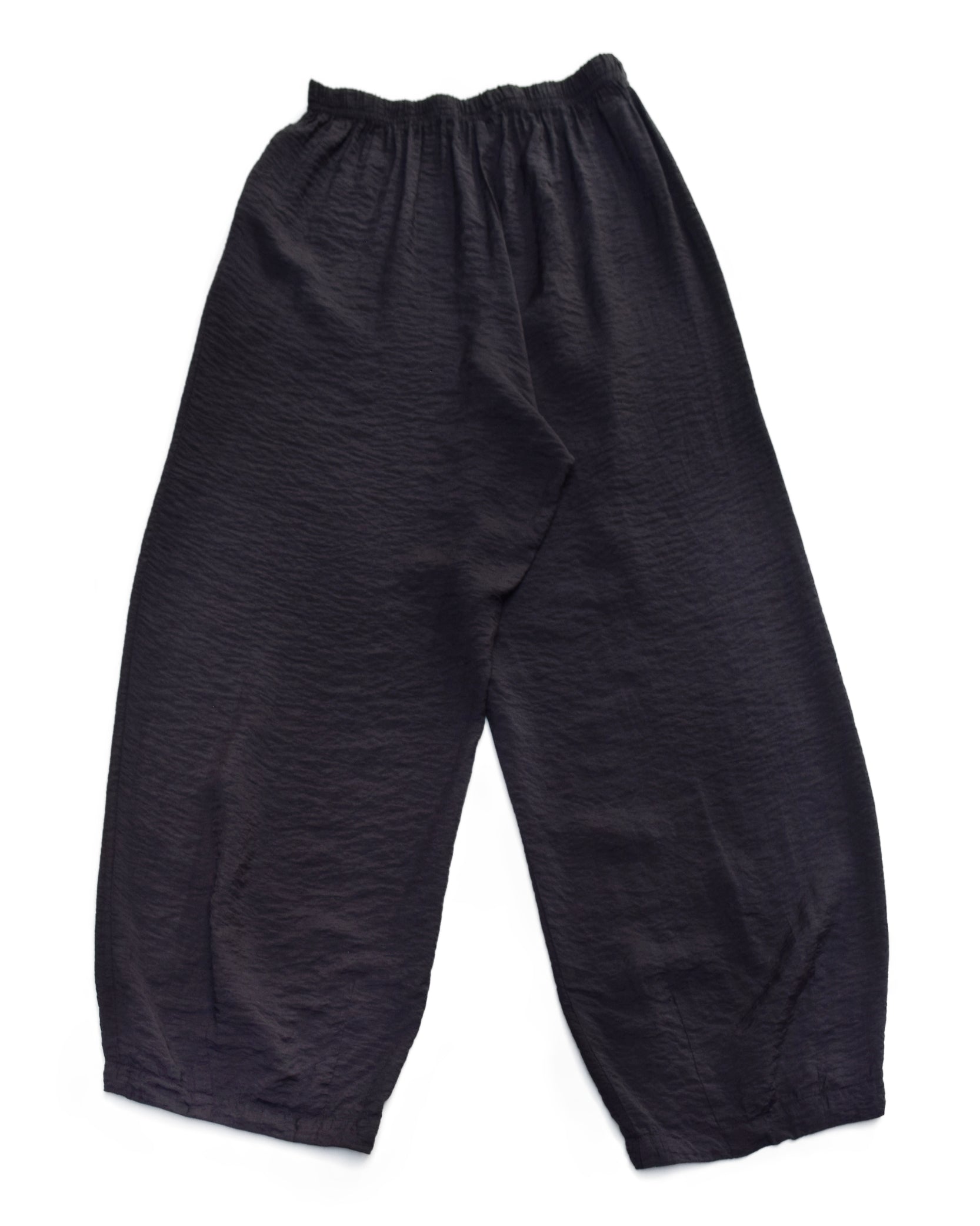 A relaxed, comfortable pant in a lightweight parachute rayon. It has an elastic waistband and the length is cropped just above the ankle. This fabric is refreshing in very hot weather.