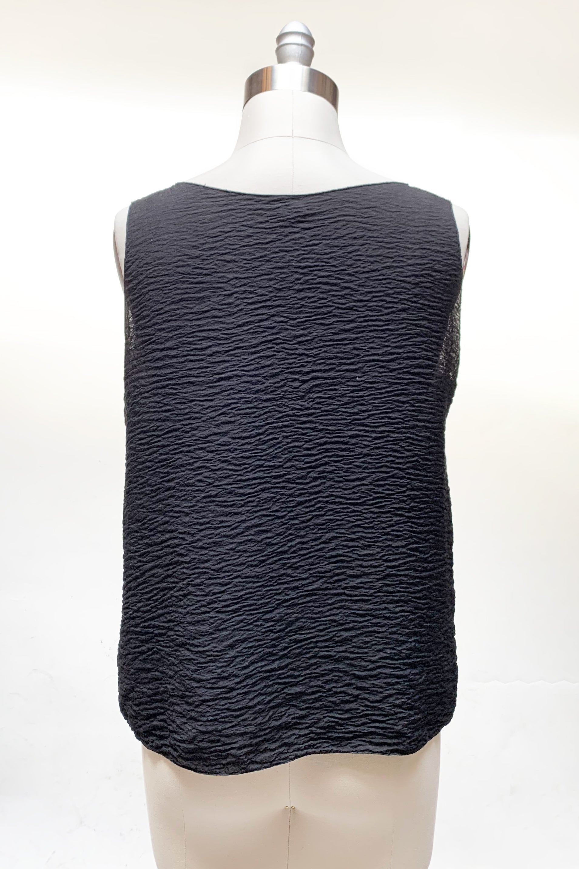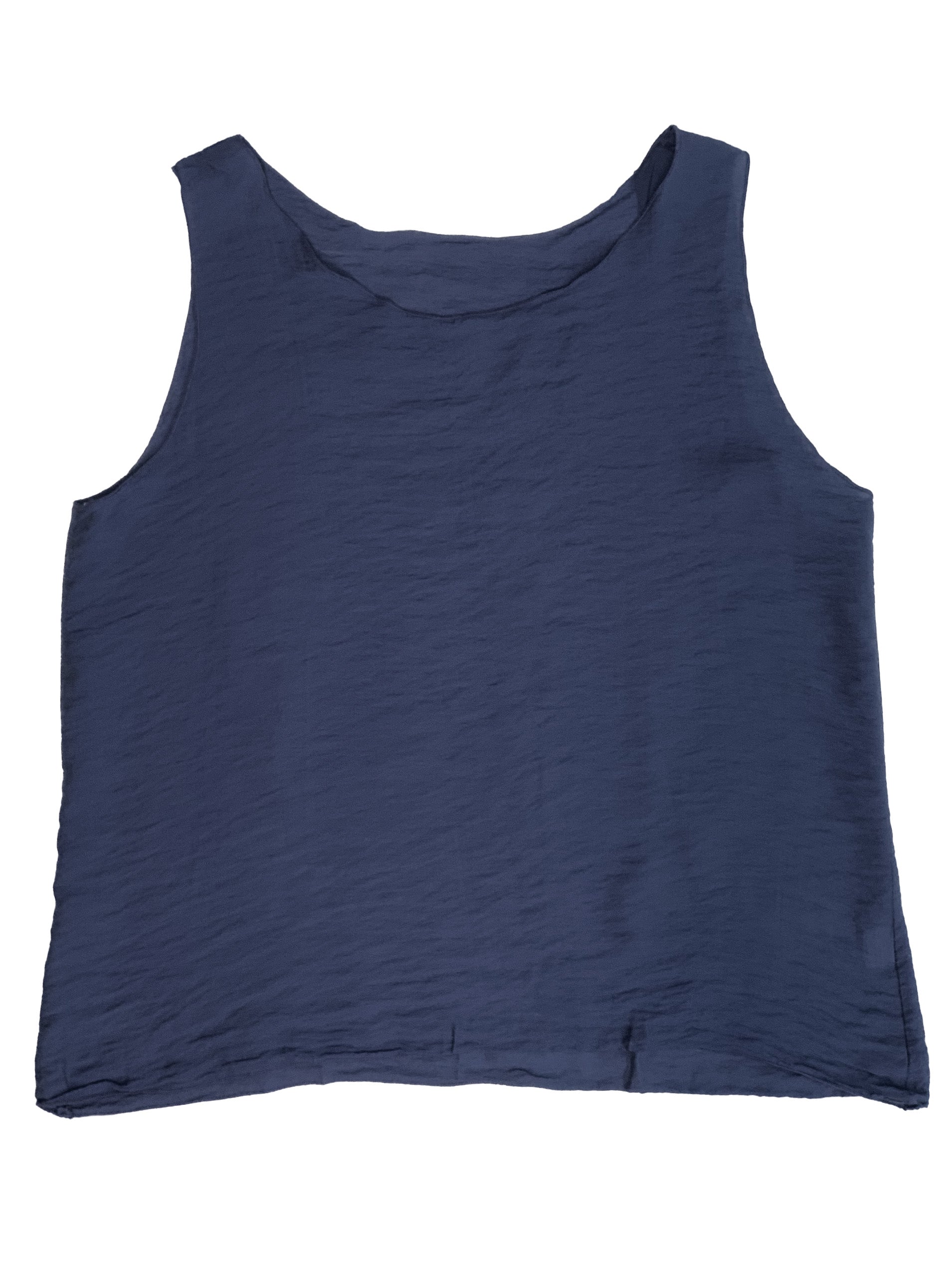 A super light layering tank. It is naturally crinkled and easy-care, with a round neckline. It falls to hip length and longer on the sides.