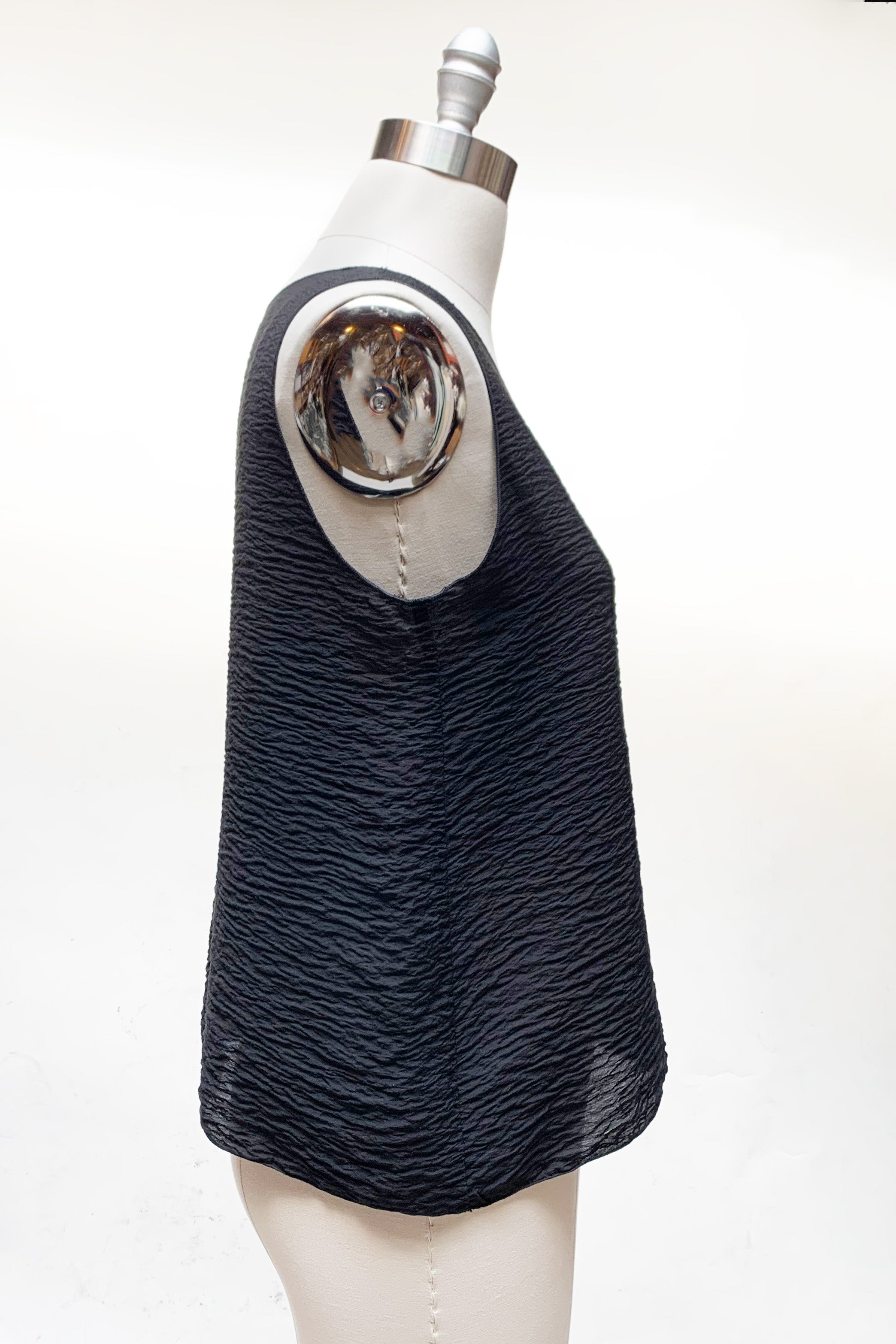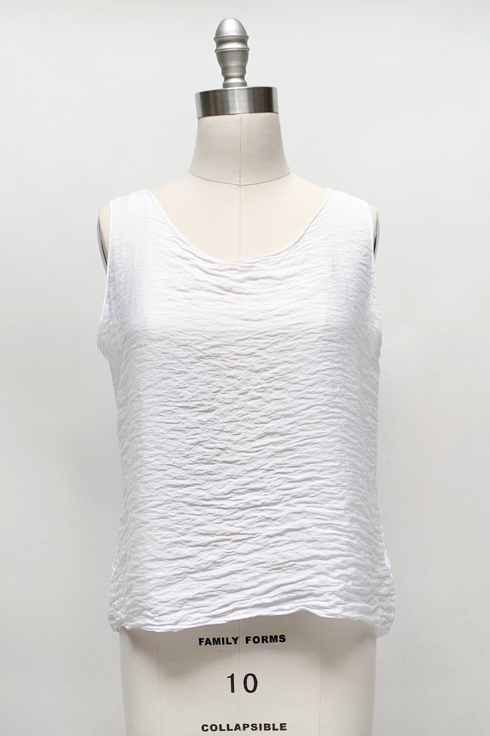 A super light layering tank. It is naturally crinkled and easy-care, with a round neckline. It falls to hip length and longer on the sides.
