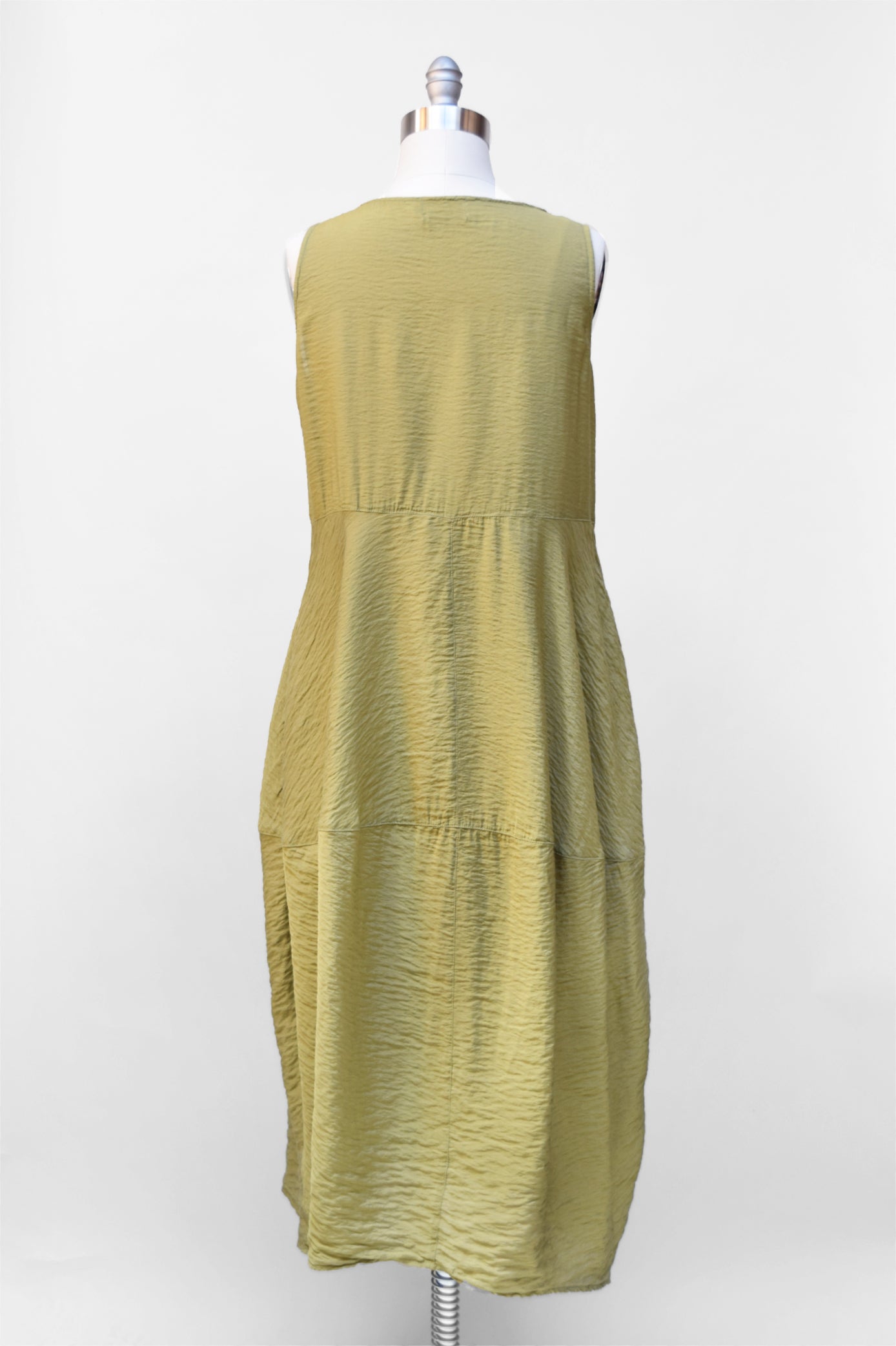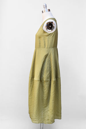 A lightweight, airy dress in a naturally textured parachute rayon. It has a high, round neckline and side seam pockets. The skirt has a soft bubble at the knee.