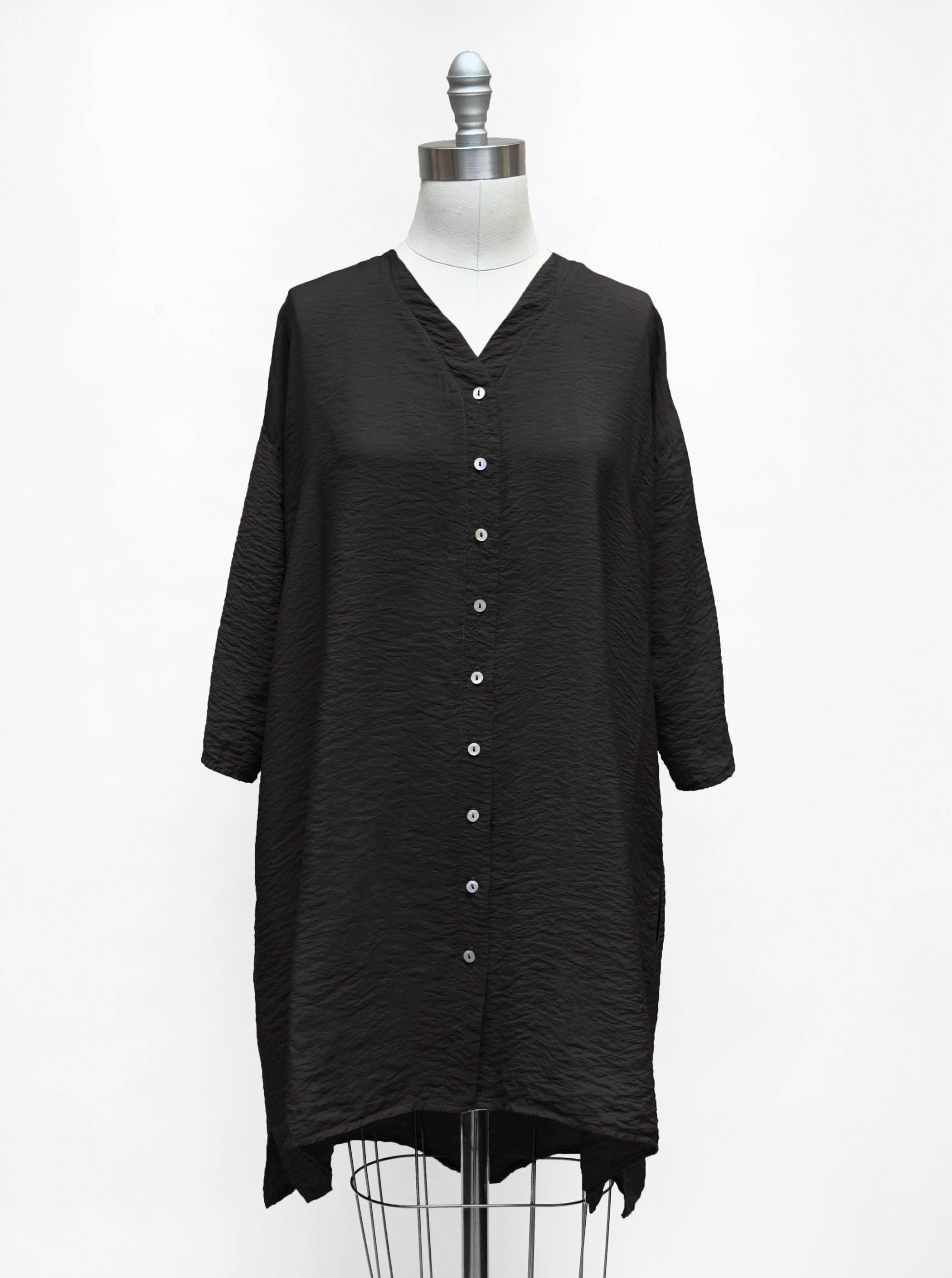 The perfect tunic for hot weather! This piece features a relaxed cut and a slight A-line silhouette. The V-neck adds a nice touch while the front button closure makes it a practical piece. It features dropped shoulders and 3/4 length sleeves that are slim fitting below the elbow. It has side seam pockets and is naturally crinkled and easy-care.