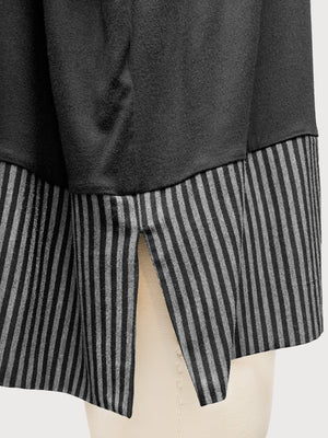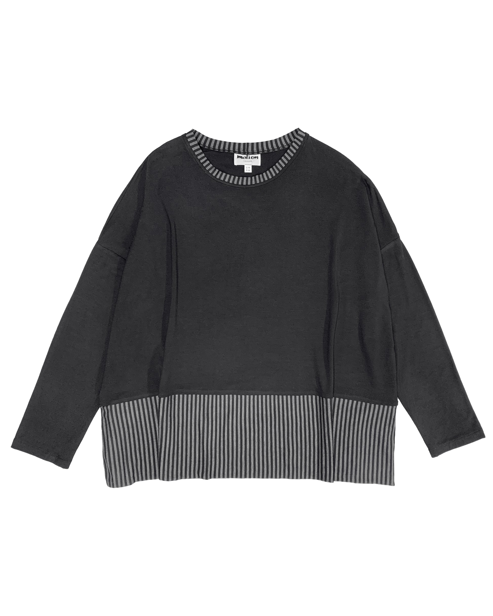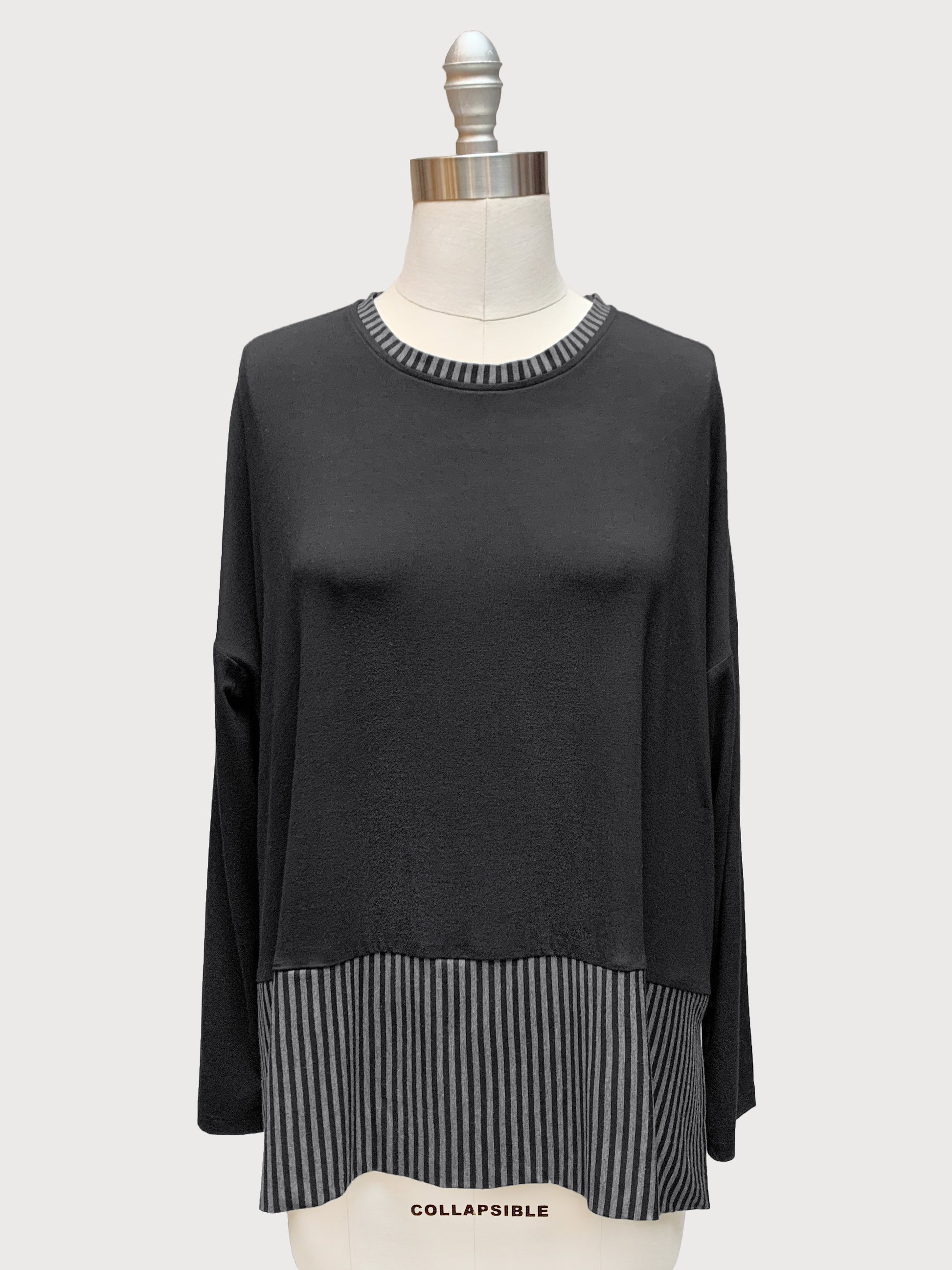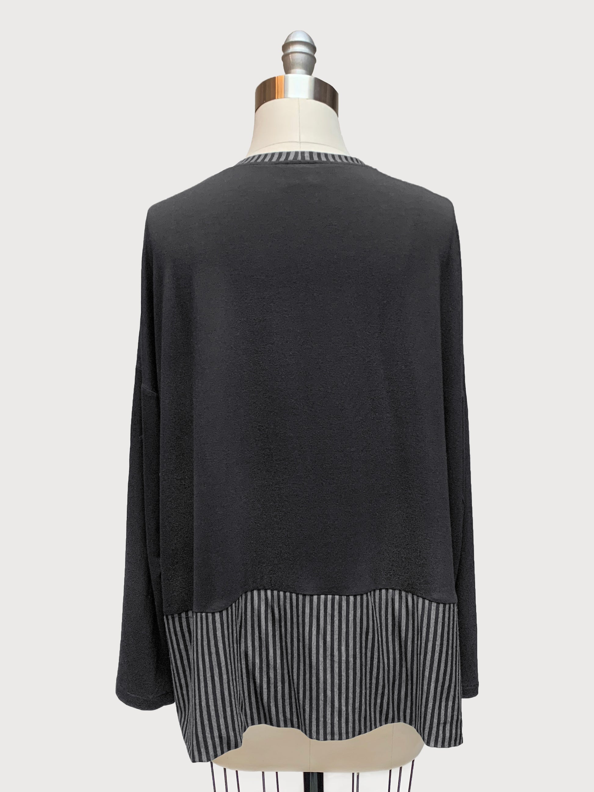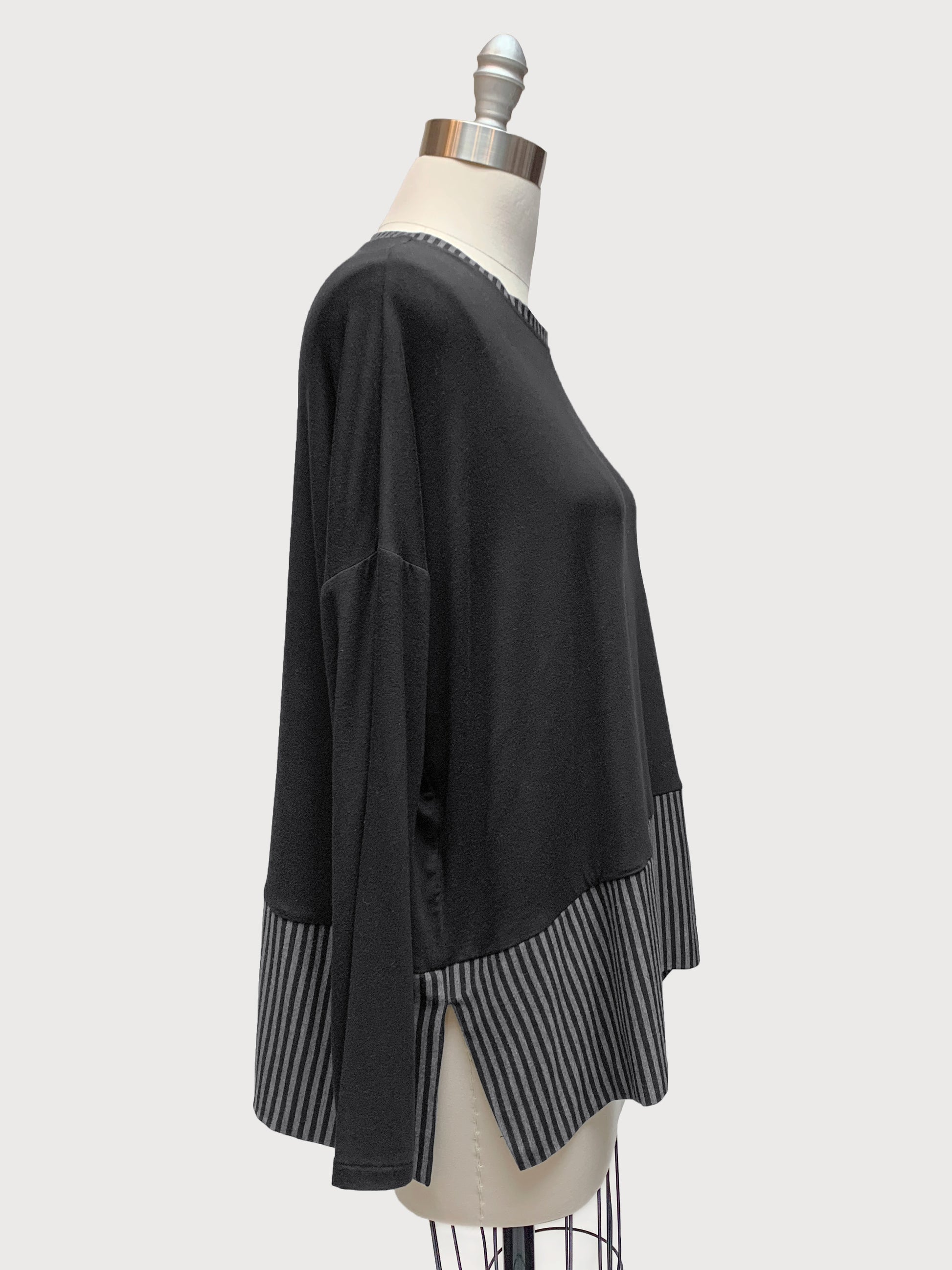 Boxy stripe combo top. This top has a black and grey stripe trim rounded neckline, drop shoulders with straight long sleeves, and 5.5" slits in the side seams up from the hem. There is a striped panel on the bottom 1/4 of the top on the front and back.