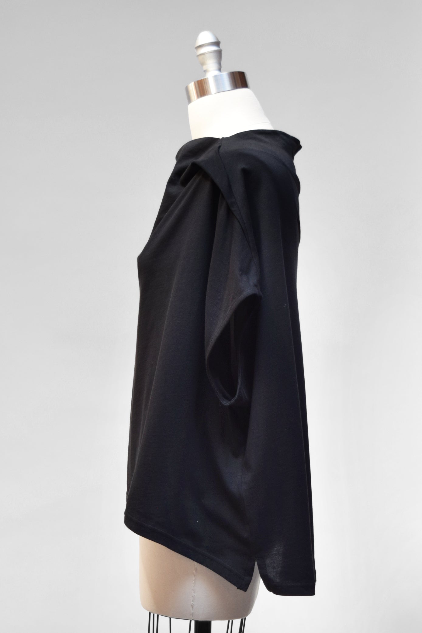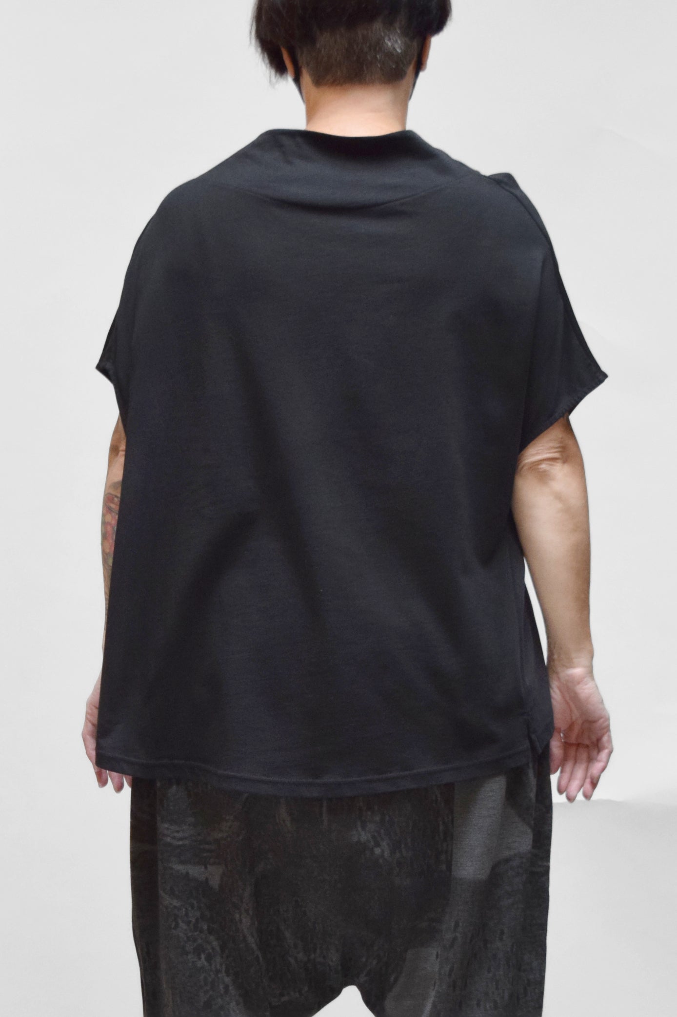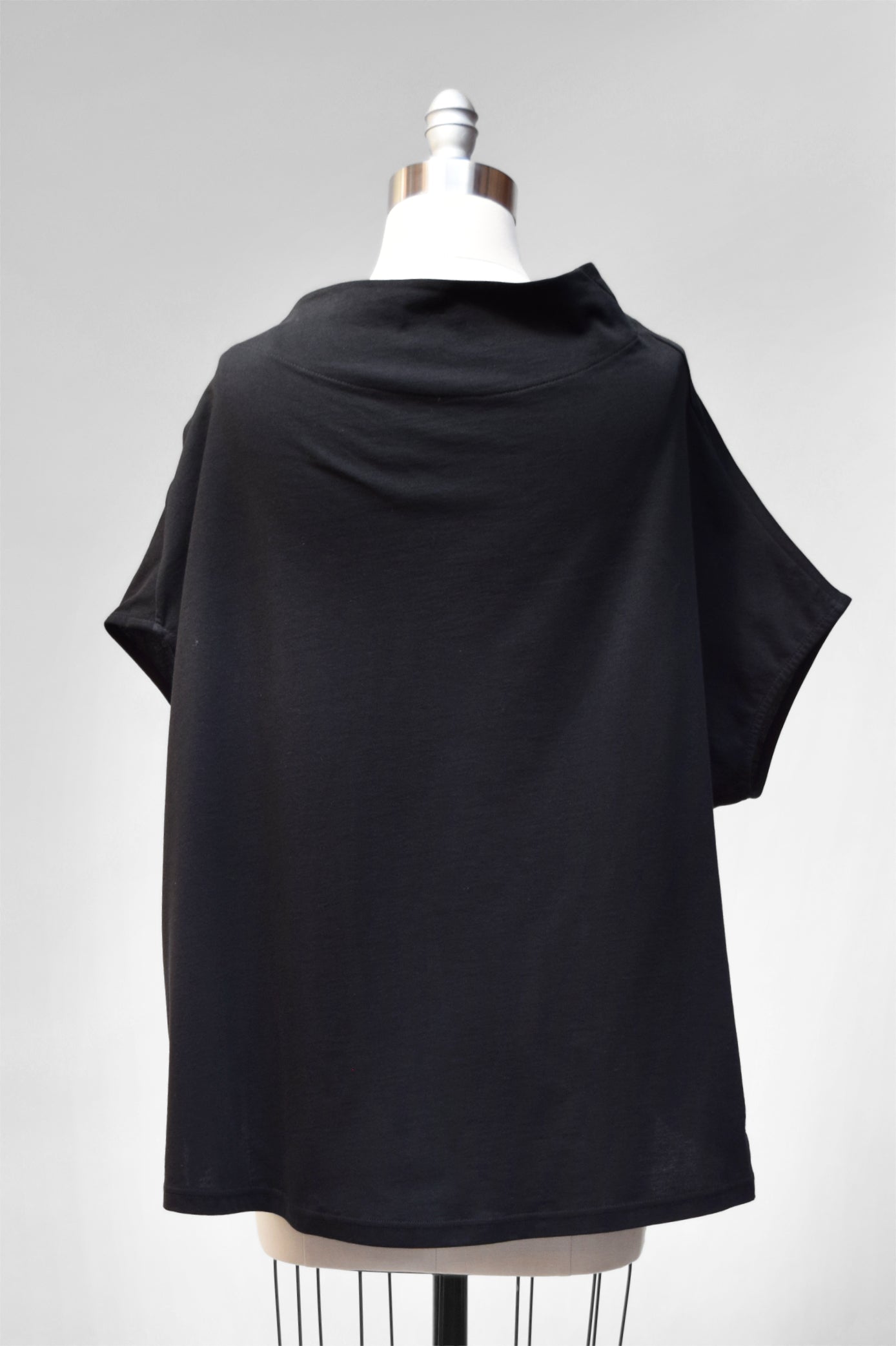 A generous, straight-cut pullover with a sculpted, draped collar. It has dropped cap sleeves and generous armholes. This top falls hip length, with extra length through the back. A wonderful piece for layering.