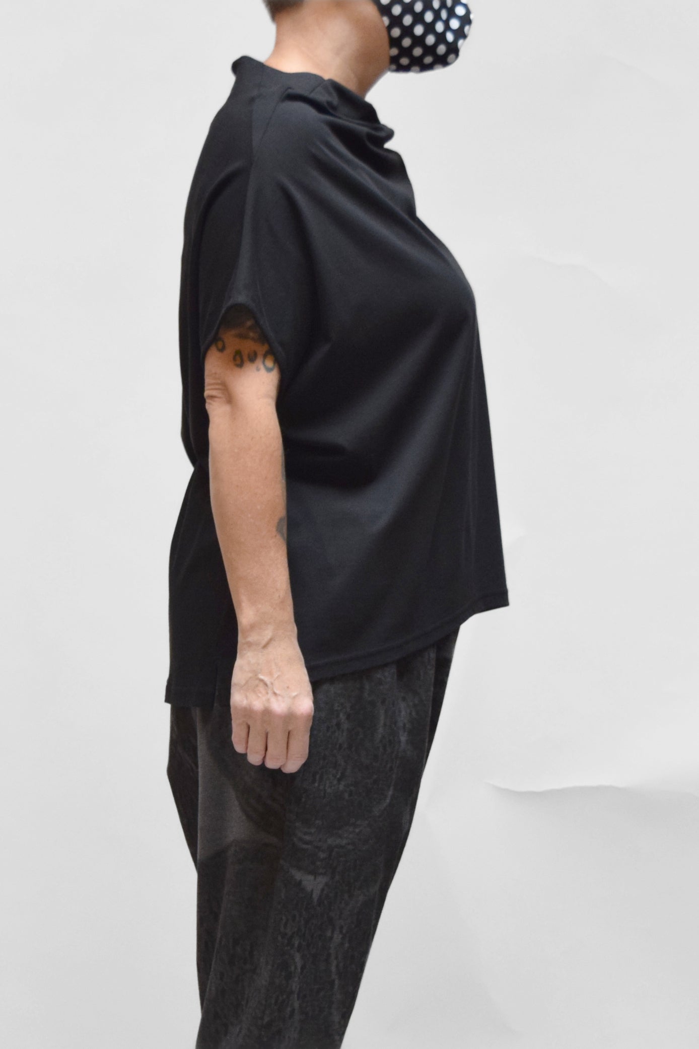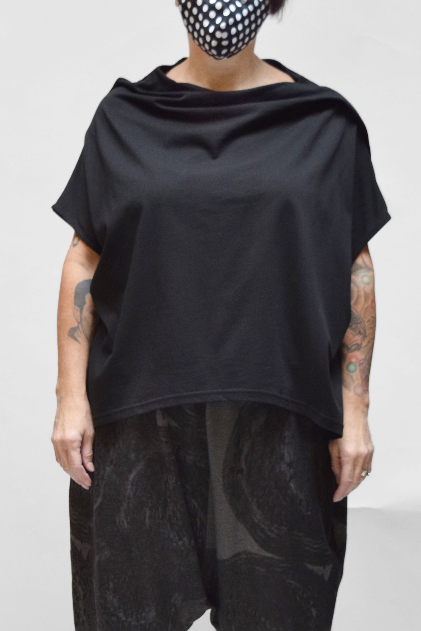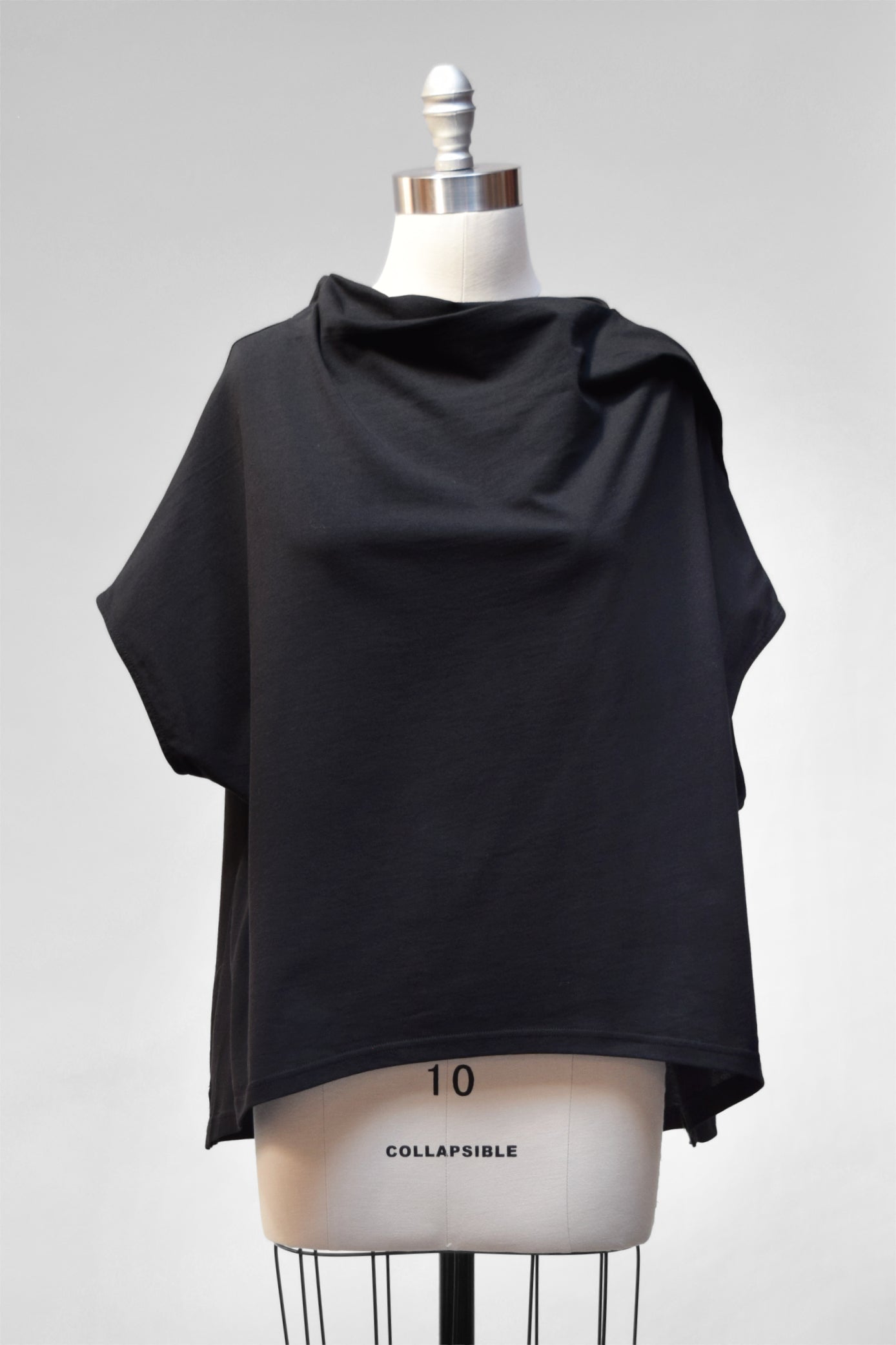 A generous, straight-cut pullover with a sculpted, draped collar. It has dropped cap sleeves and generous armholes. This top falls hip length, with extra length through the back. A wonderful piece for layering.
