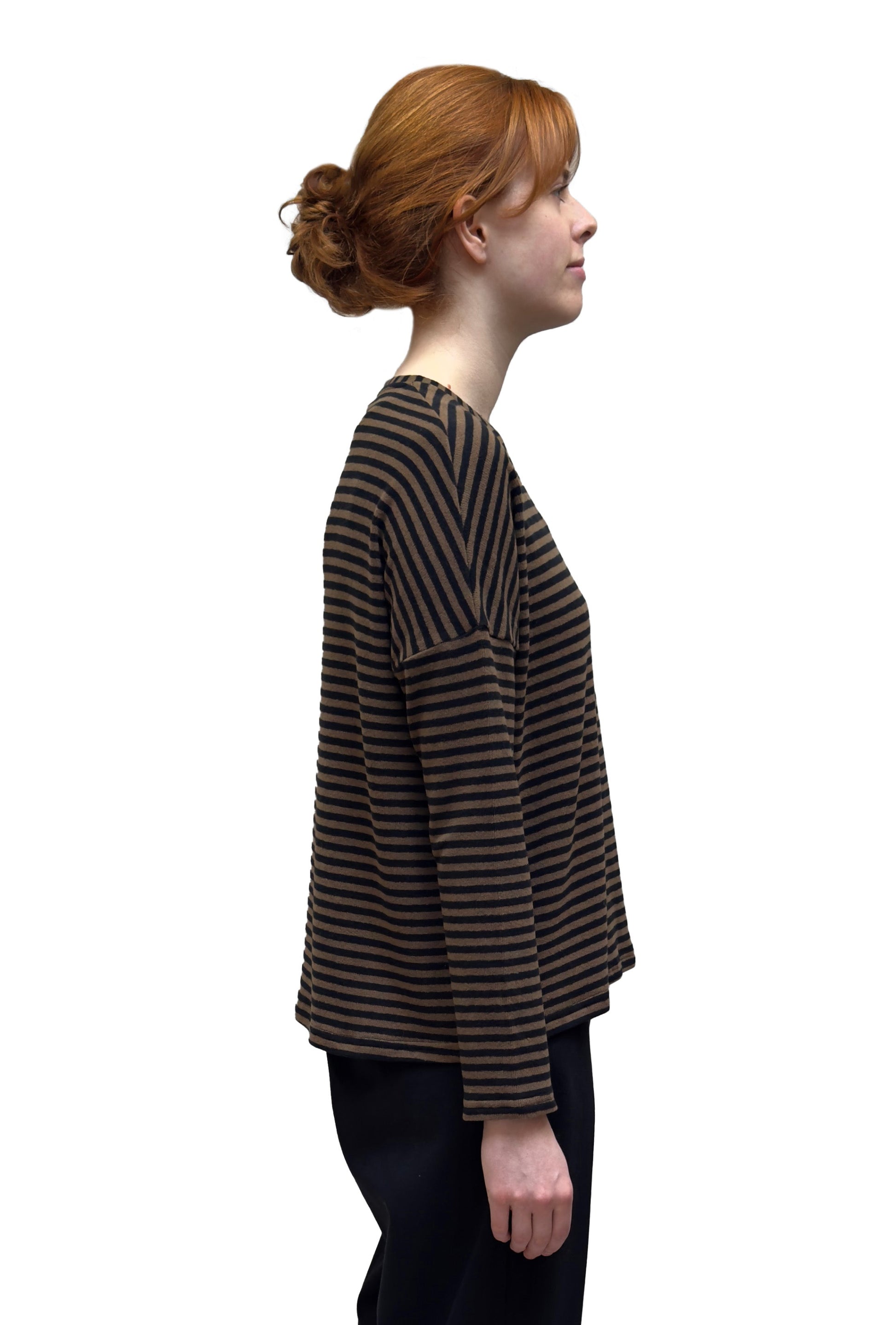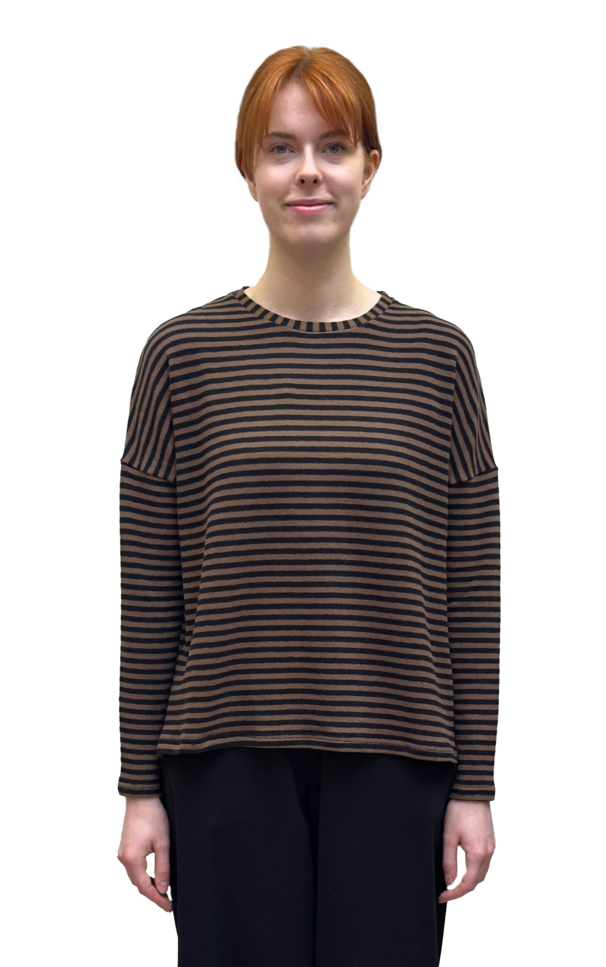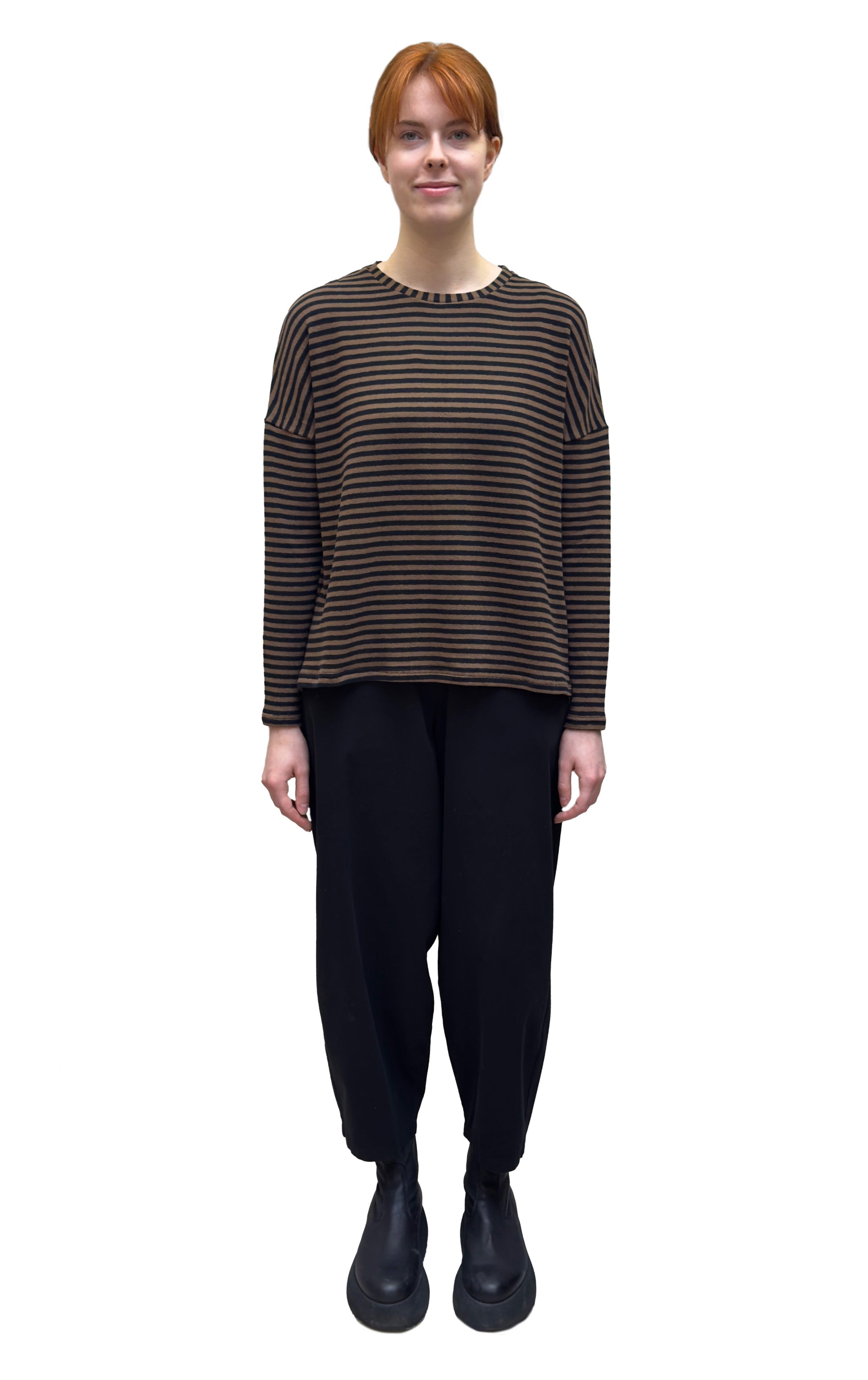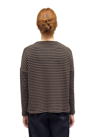 NEIRAMI Crew Neck Sweater in Black and Tobacco Mini Stripes