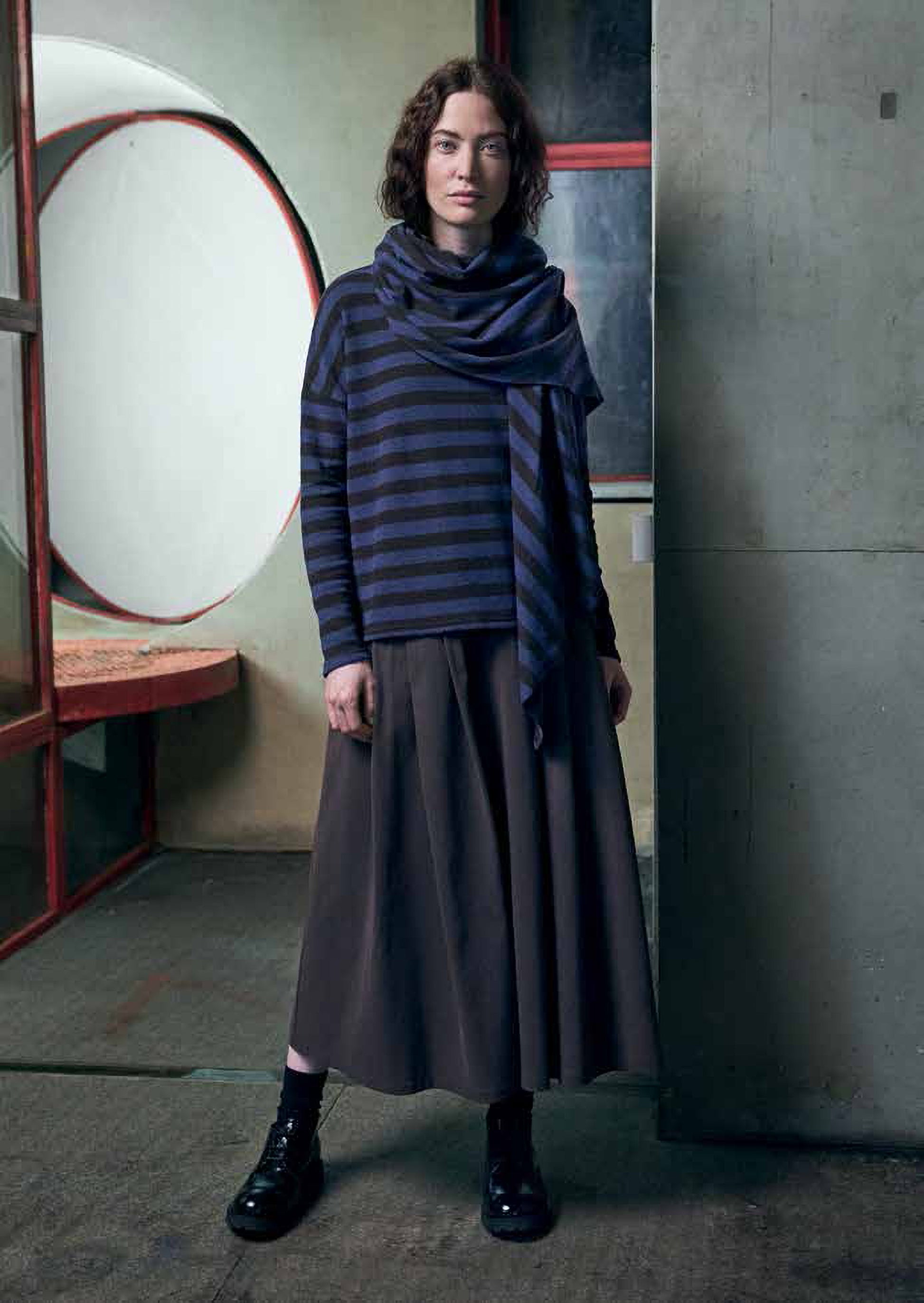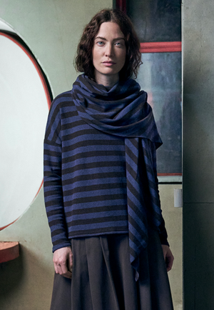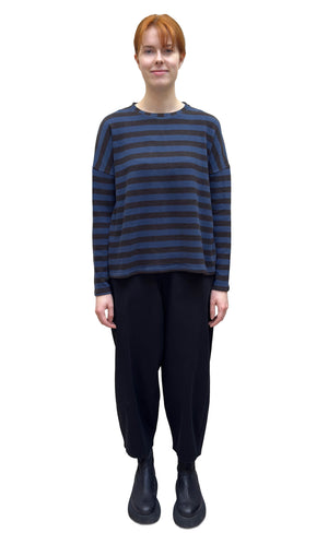 A crew neck pullover by Neirami in a light cozy knit featuring medium horizontal stripes. This pullover has a relaxed straight cut, dropped shoulders and long, slim fitting sleeves. A stylish and comfortable piece.