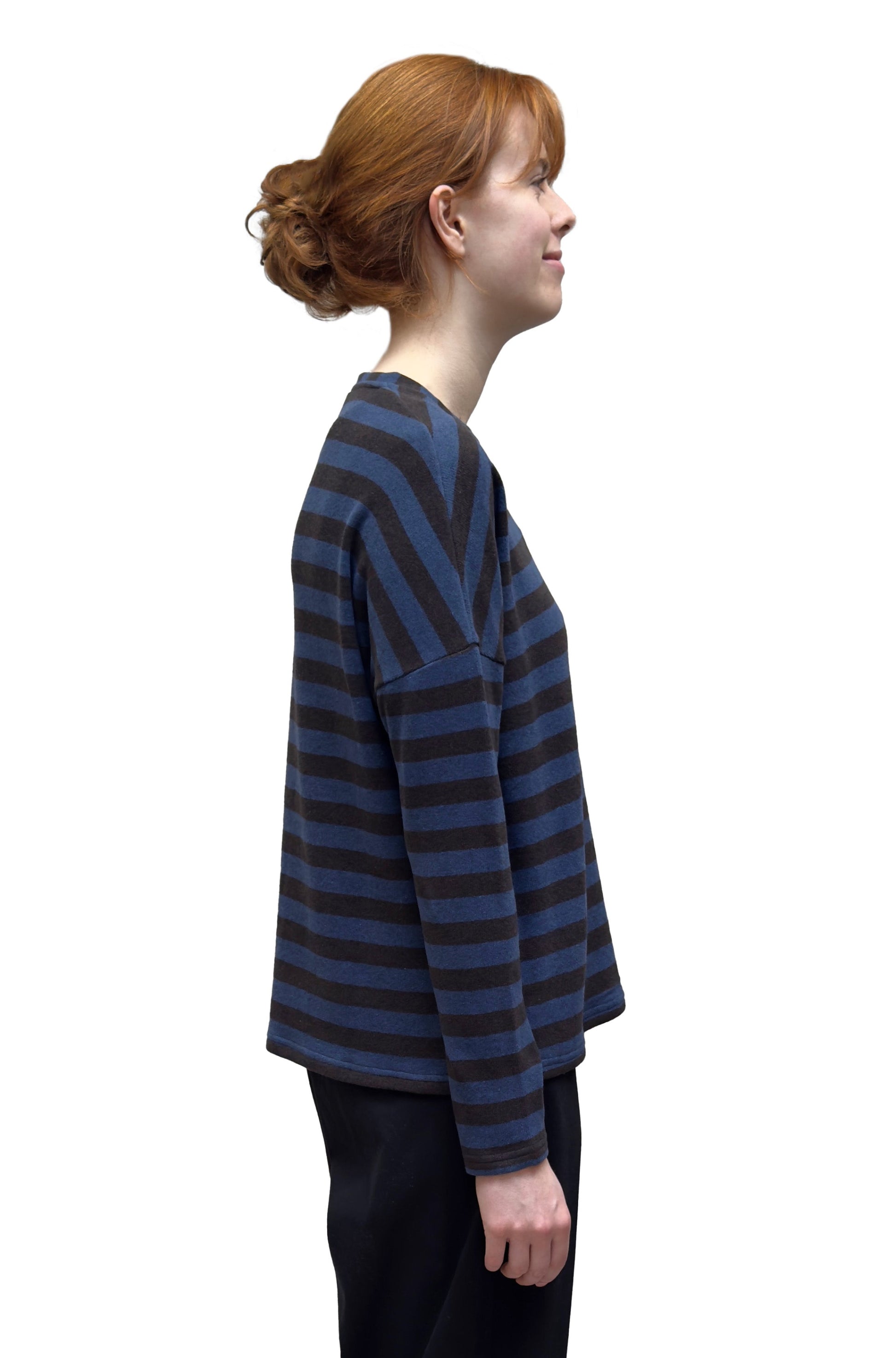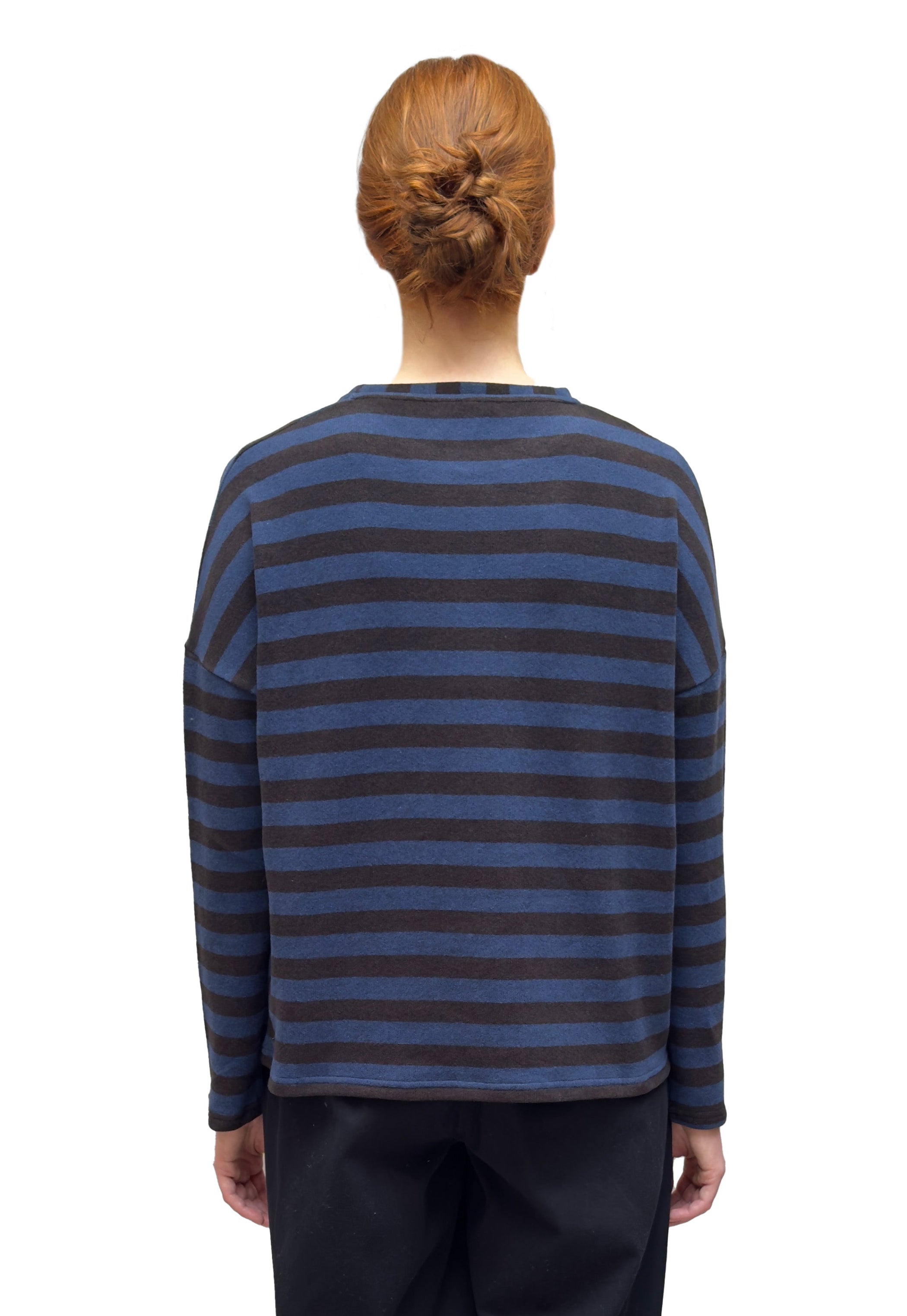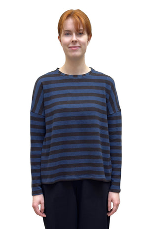 NEIRAMI Crew Neck Sweater in Blue and Brown Wide Stripes