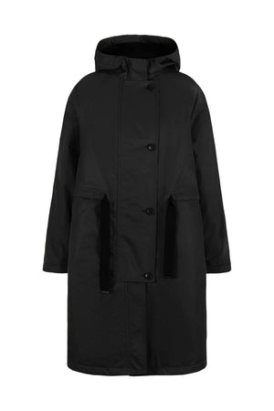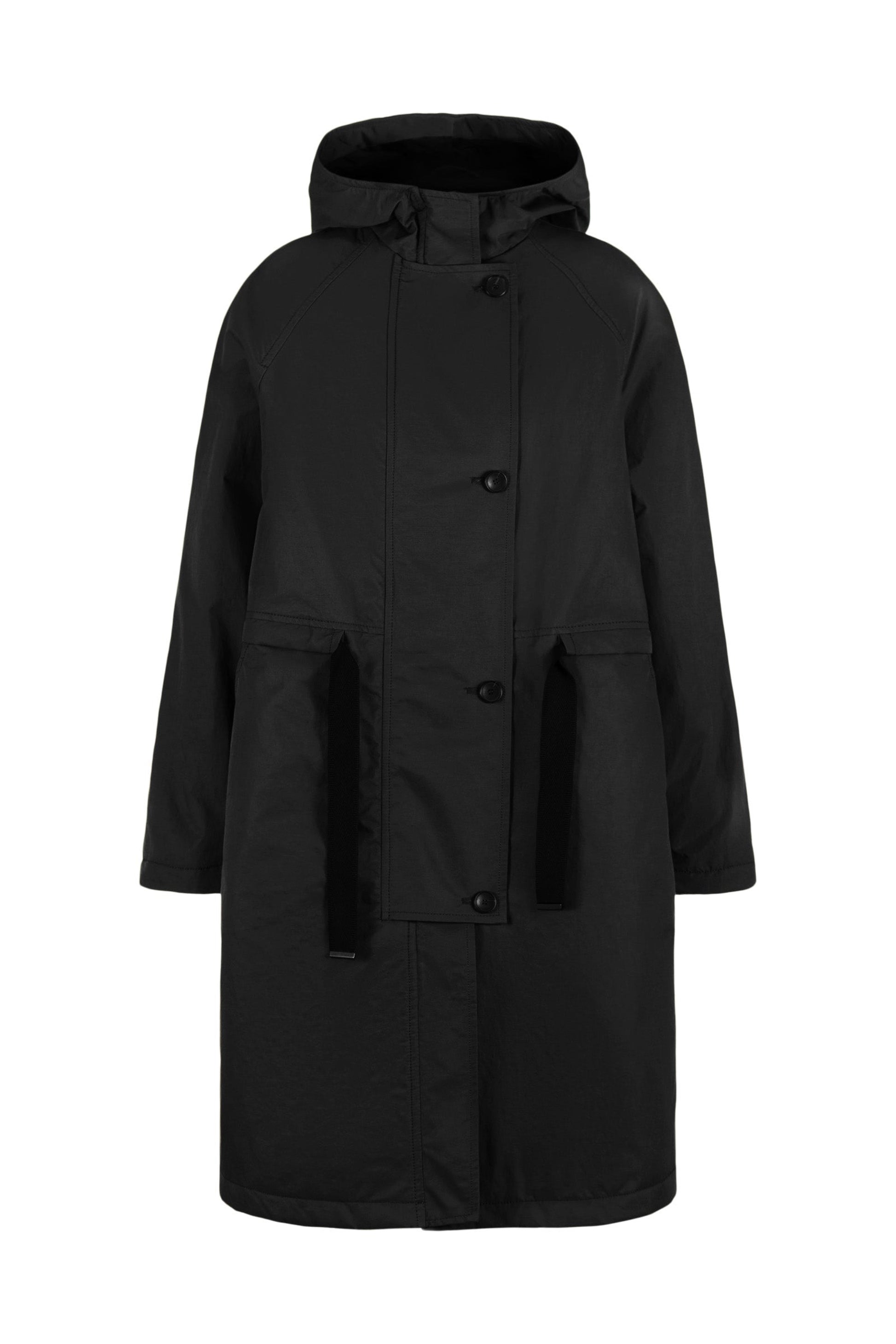 This Oska coat is the perfect transitional piece that keeps you warm and dry with its water-repellent fabric and padded lining. It is spacious throughout the body with enough room to add another layer underneath in breezy days and falls below the knee in length. It offers an A-line silhouette with long raglan sleeves, a front button closure with an enclosed zipper and a drawstring at the waist to cinch it.
