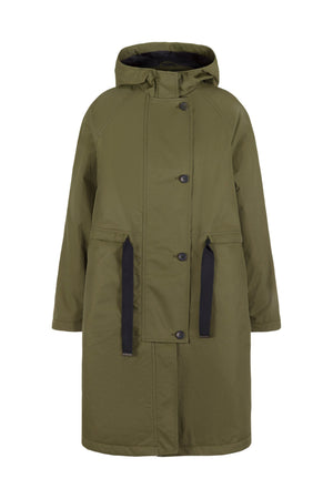 This Oska coat is the perfect transitional piece that keeps you warm and dry with its water-repellent fabric and padded lining. It is spacious throughout the body with enough room to add another layer underneath in breezy days and falls below the knee in length. It offers an A-line silhouette with long raglan sleeves, a front button closure with an enclosed zipper and a drawstring at the waist to cinch it.