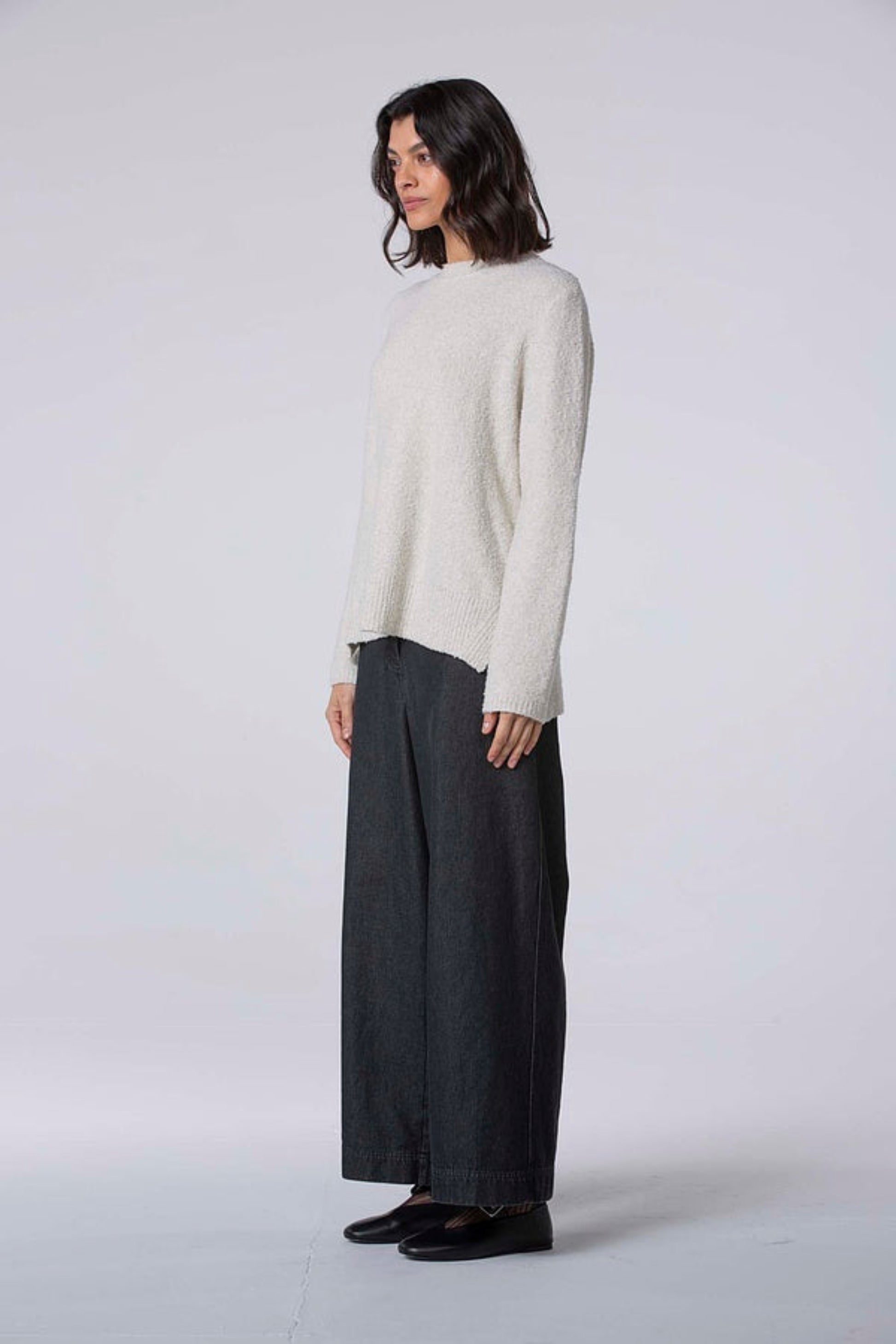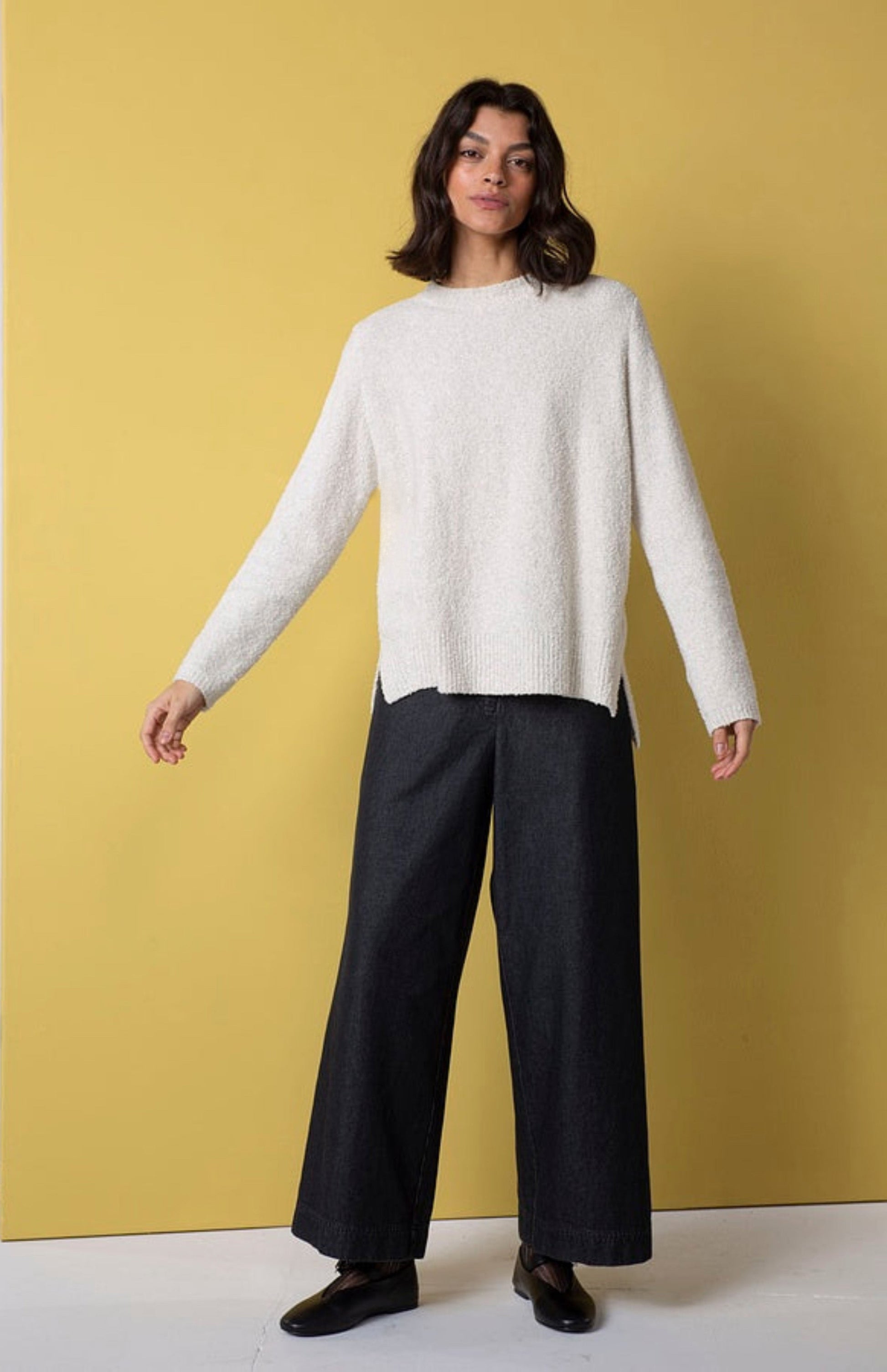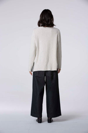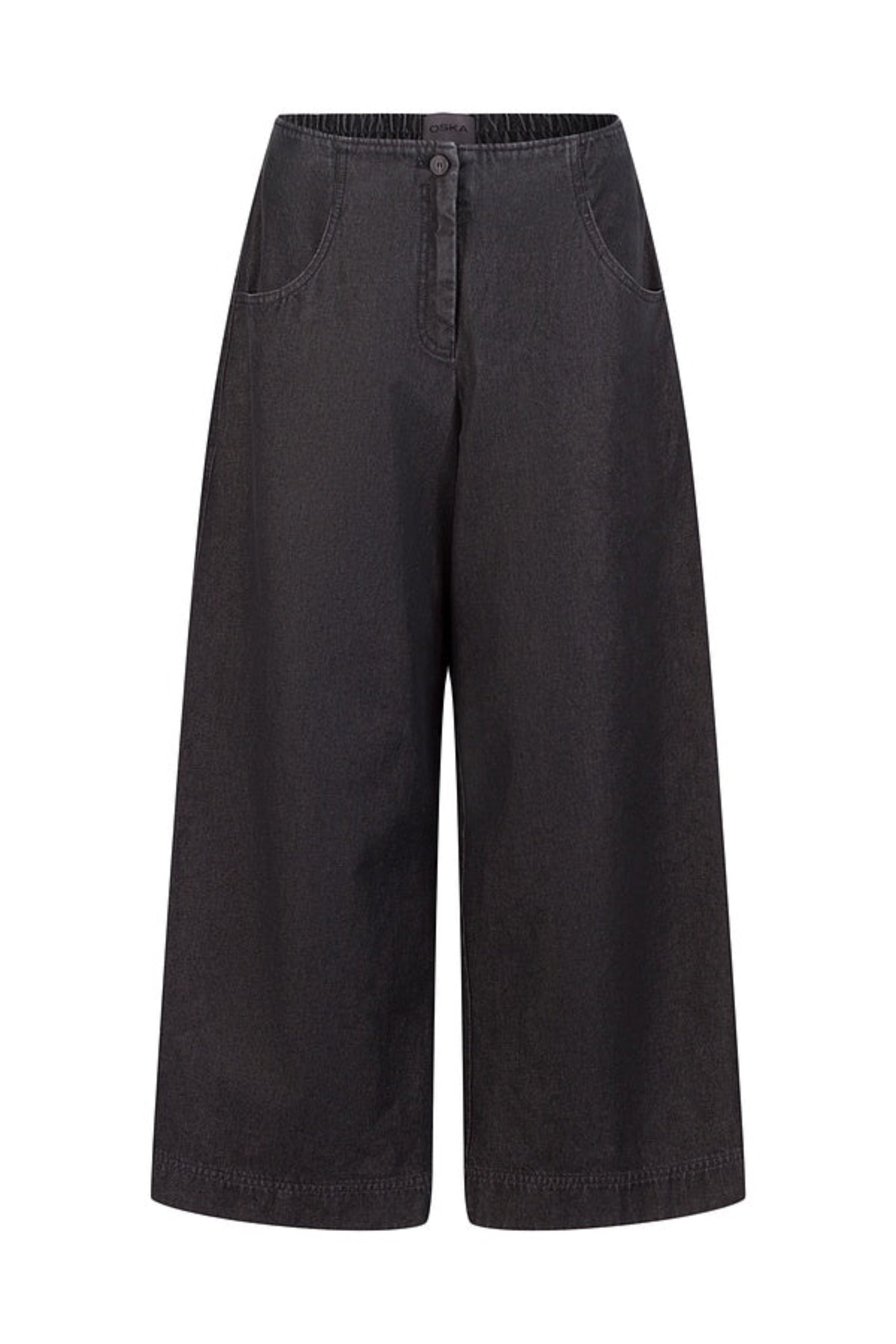 Wide leg Oska jeans in the perfect culotte style. They feature round front pockets, and patch pockets with a V-shaped yoke at the back. The flat buttoned front and elastic back waistband create comfort and ease without sacrificing the look and feel of denim. These are the perfect jeans to dress up or down for the cooler months.
