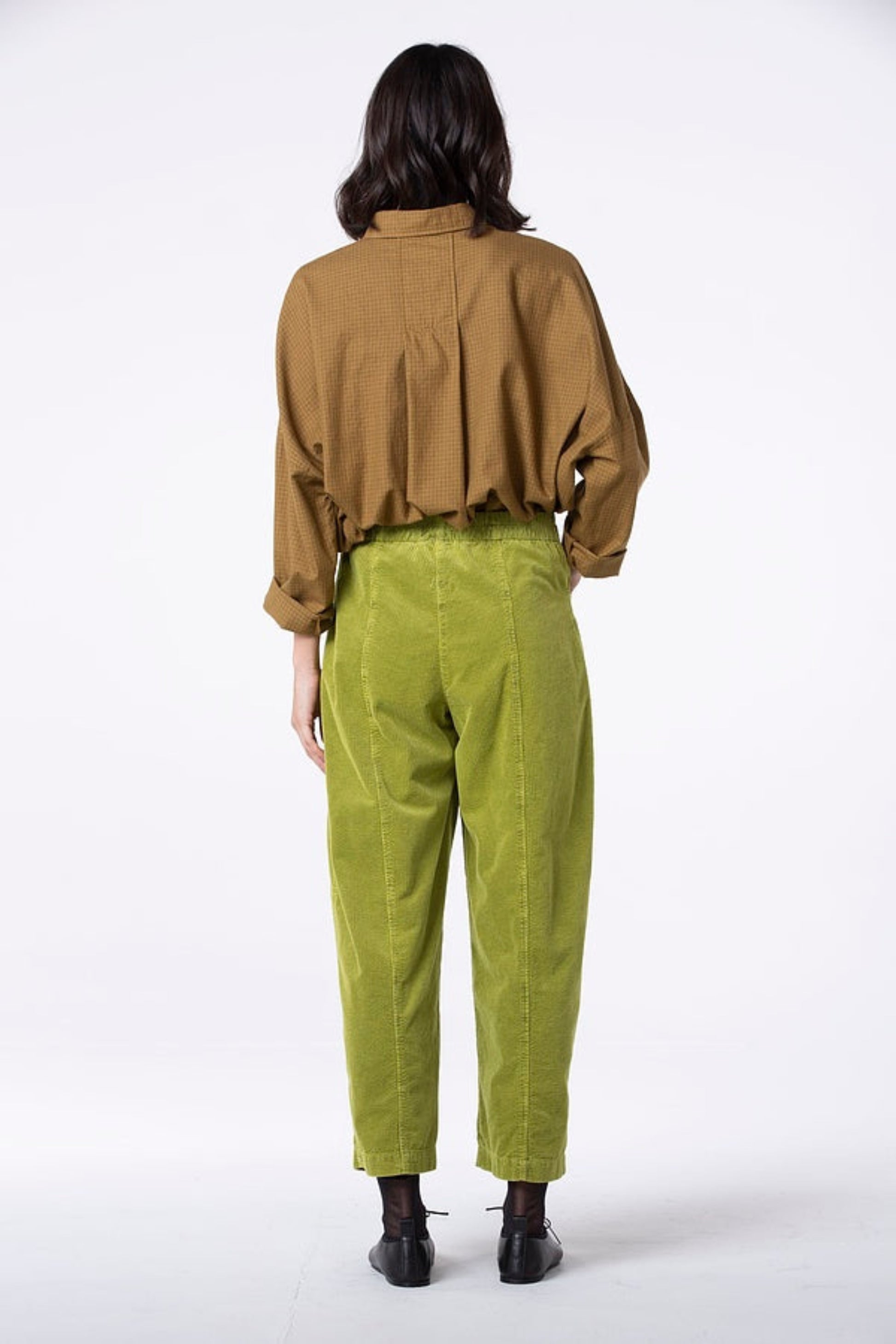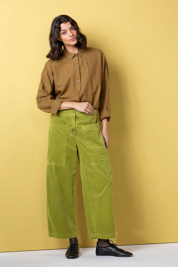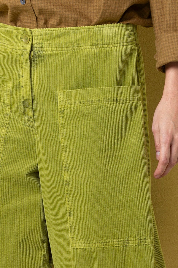 This Oska relaxed wide leg pant comes in a gorgeous vibrant corduroy. Featuring 2 large front pockets and centre seams at the front and back. The button front and elastic waistband at the back create a comfortable fit with ease and style.