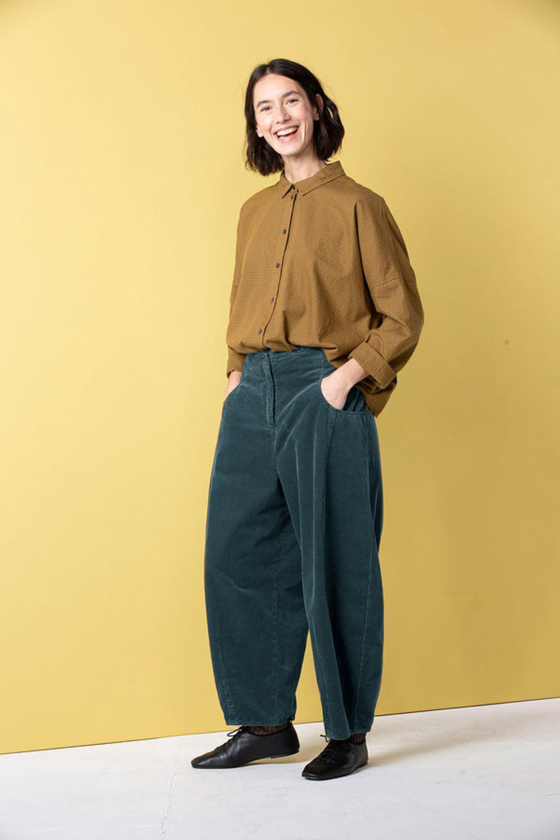 These Oska trousers are fashioned in a soft cotton corduroy fabric with a curved barrel leg design for a flattering silhouette that falls below ankle-length. It features rounded pockets, centre seams at the front and back, and has a flat front and an elasticized waistband at the back for a comfortable fit. You can roll them up or down for a change in look.