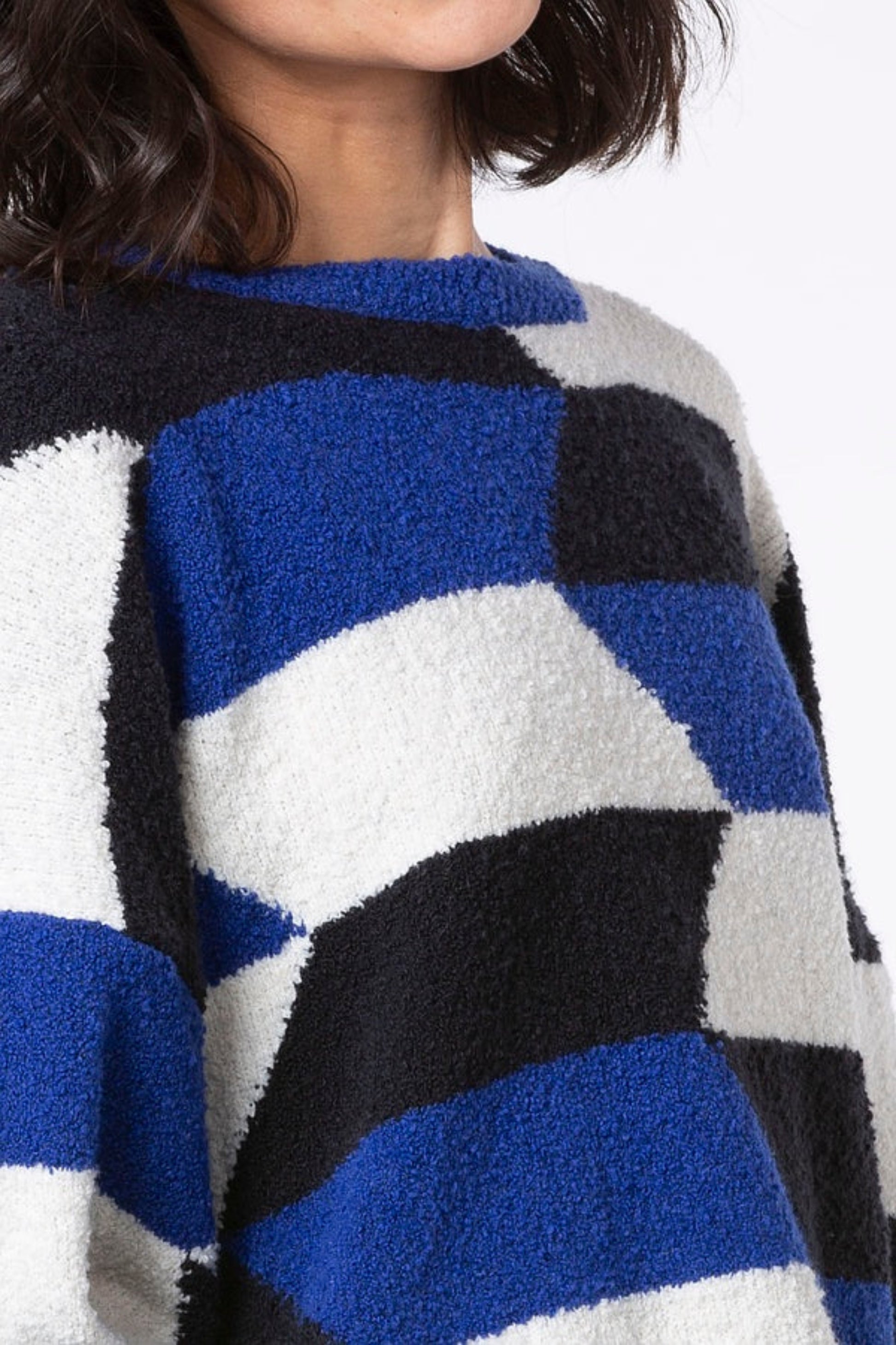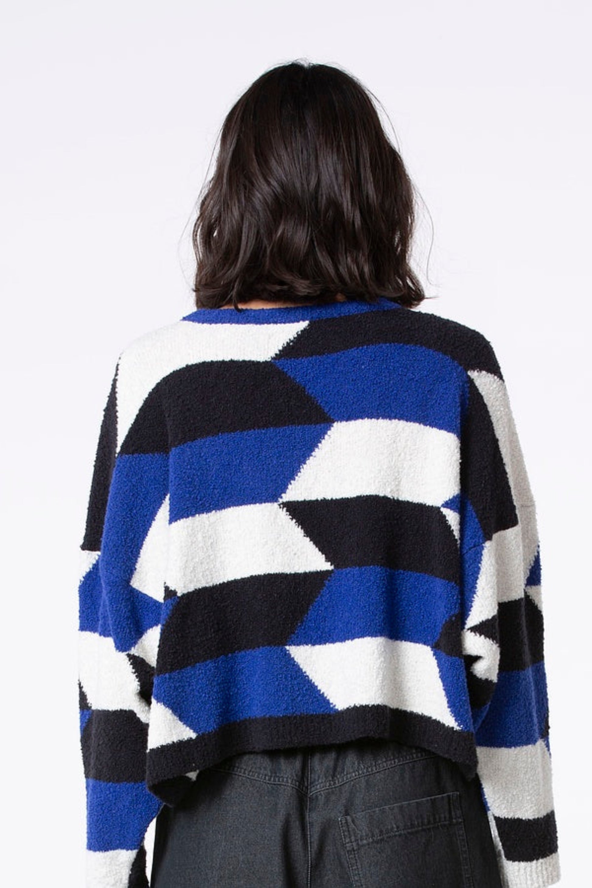 A super cozy cropped sweater knit from boucle yarn, featuring an abstract multicoloured pattern and boxy relaxed fit. The ultra soft material, dropped shoulders and long sleeves make this the perfect layering piece for colder weather.