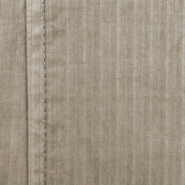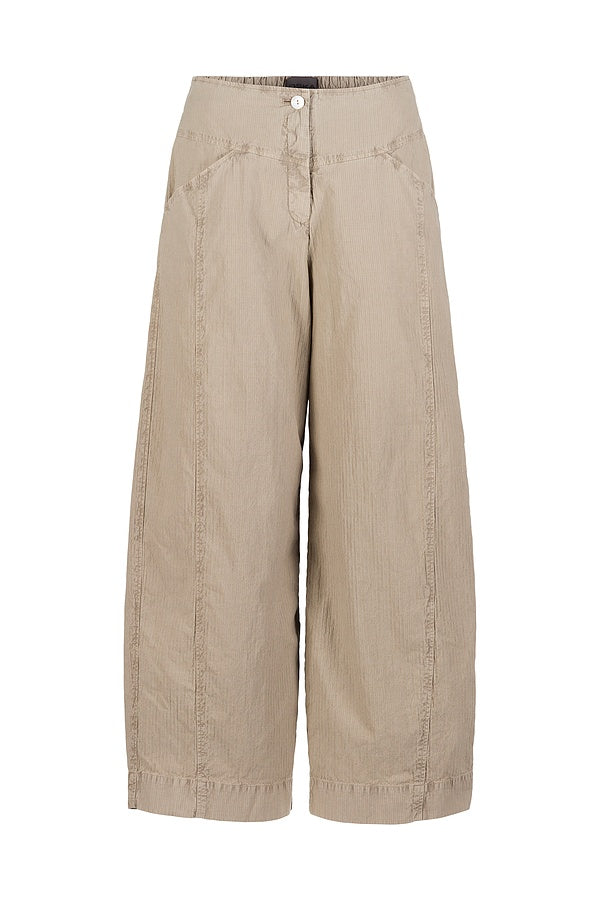 A light cotton pant by Oska featuring a subtle stripe. This pant has a flat front with an elasticized waist at the back and features a wide barrel leg shape that falls to the ankle. It has a V shaped yoke and slanted pockets at the front.