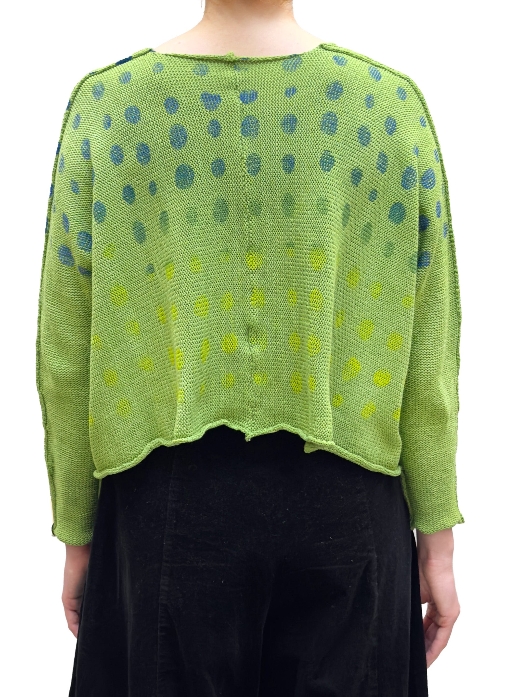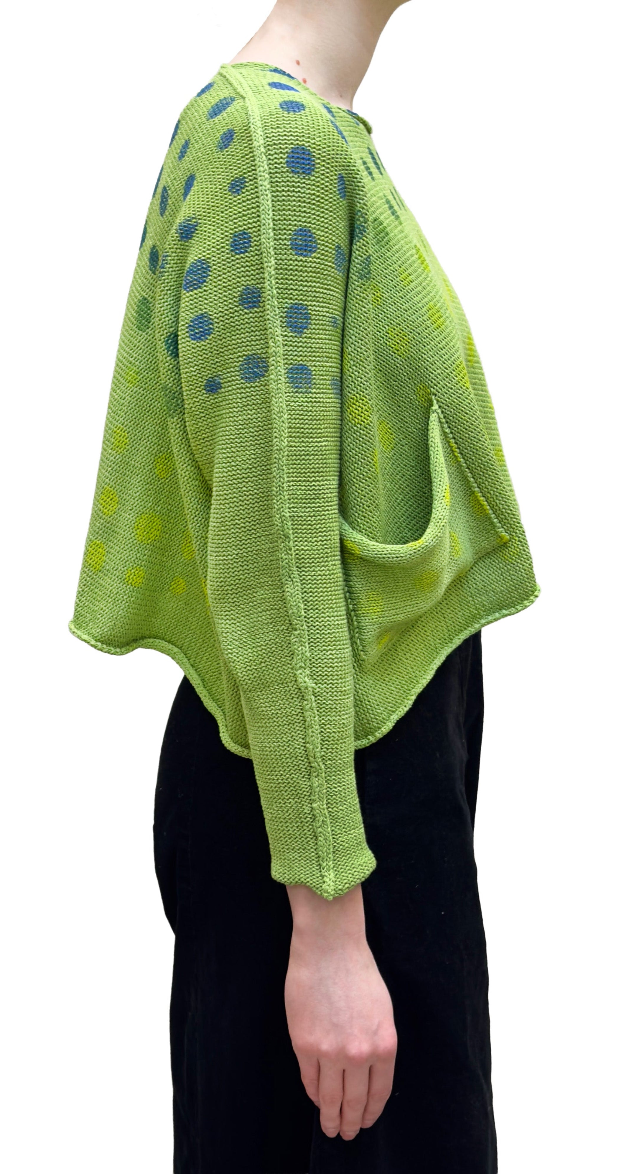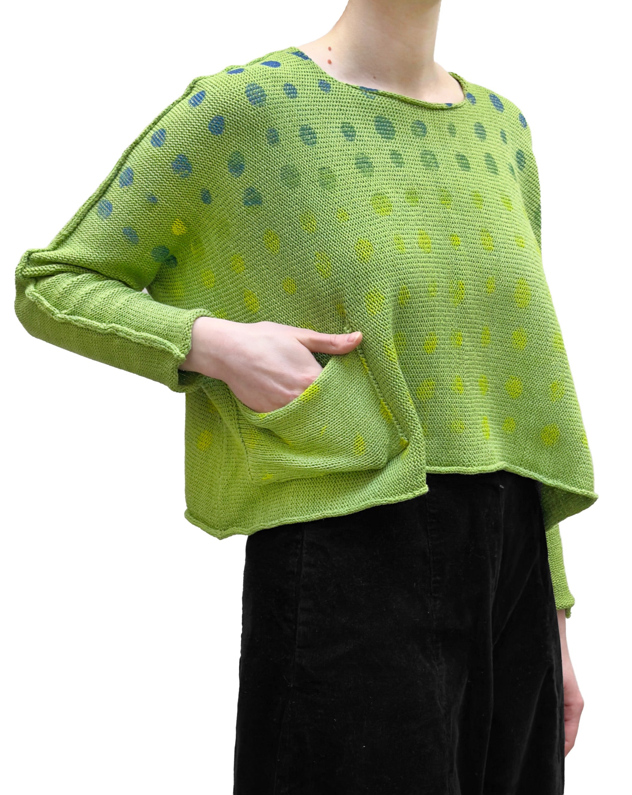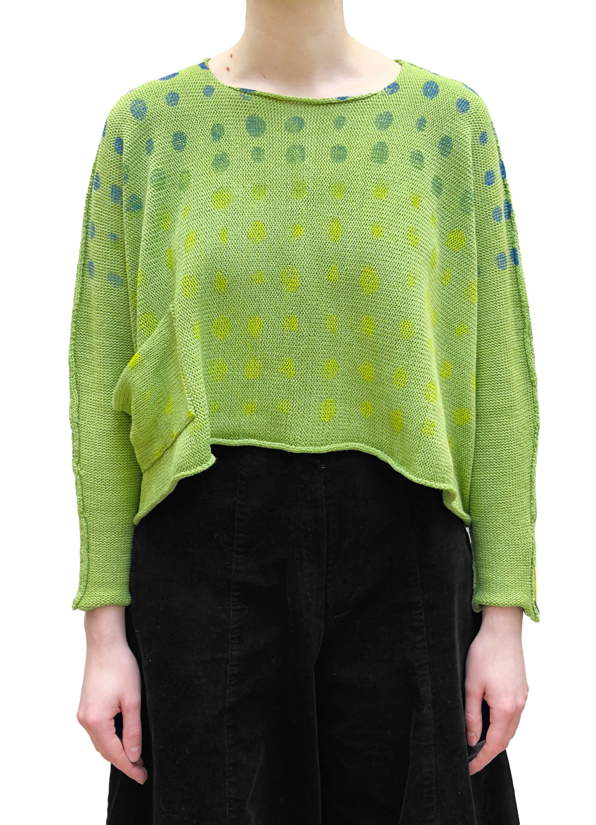 A boxy and long sleeve, medium weight round neck pullover knit sweater. This bright lime green sweater features a dark green, cobalt blue and yellow mixed circle print. It has dropped shoulders for a comfortable fit, and features a single front pocket on the right side. The edges naturally roll inwards and falls to the hip in length.
