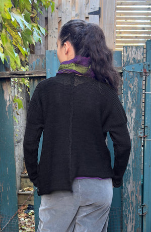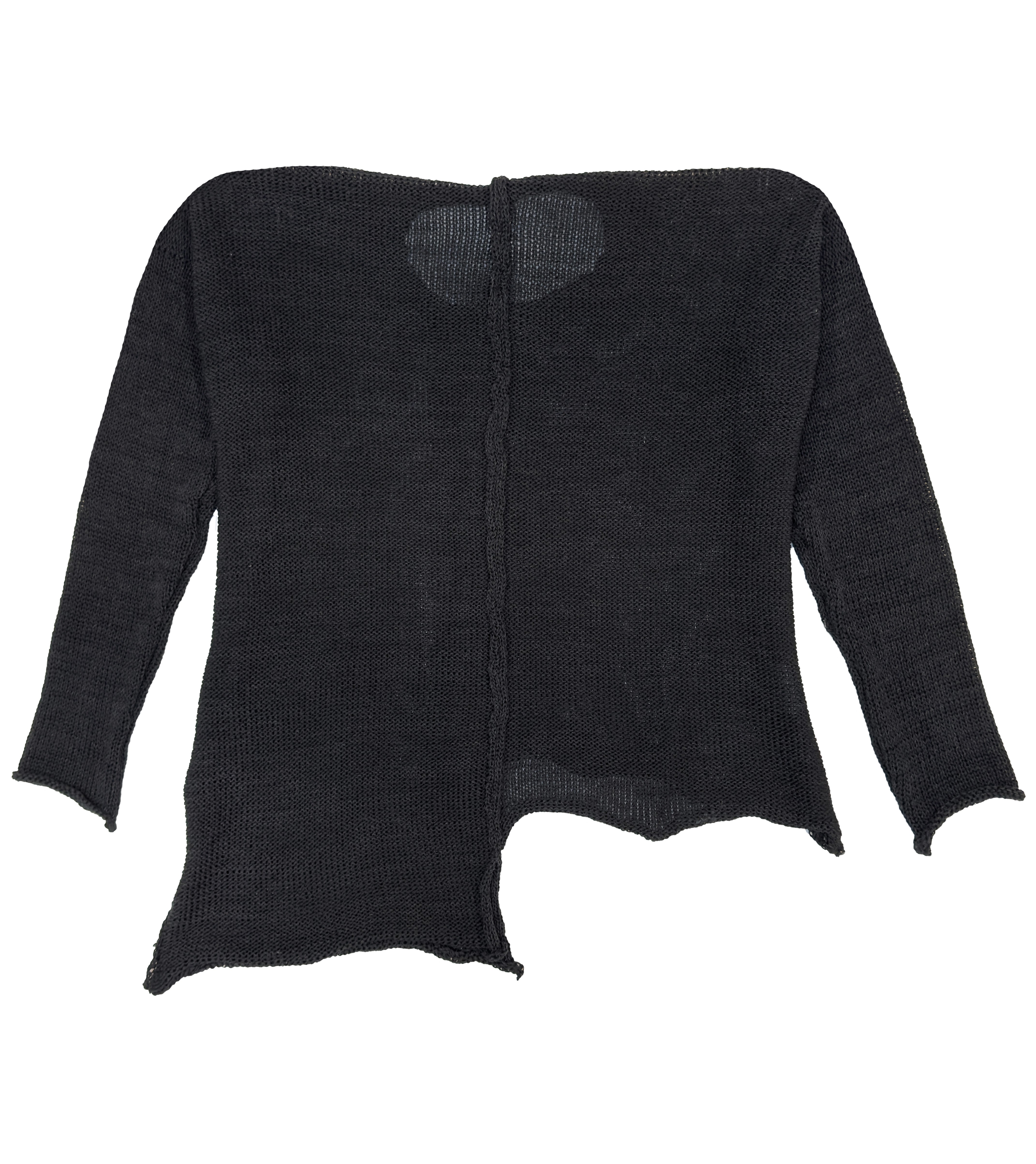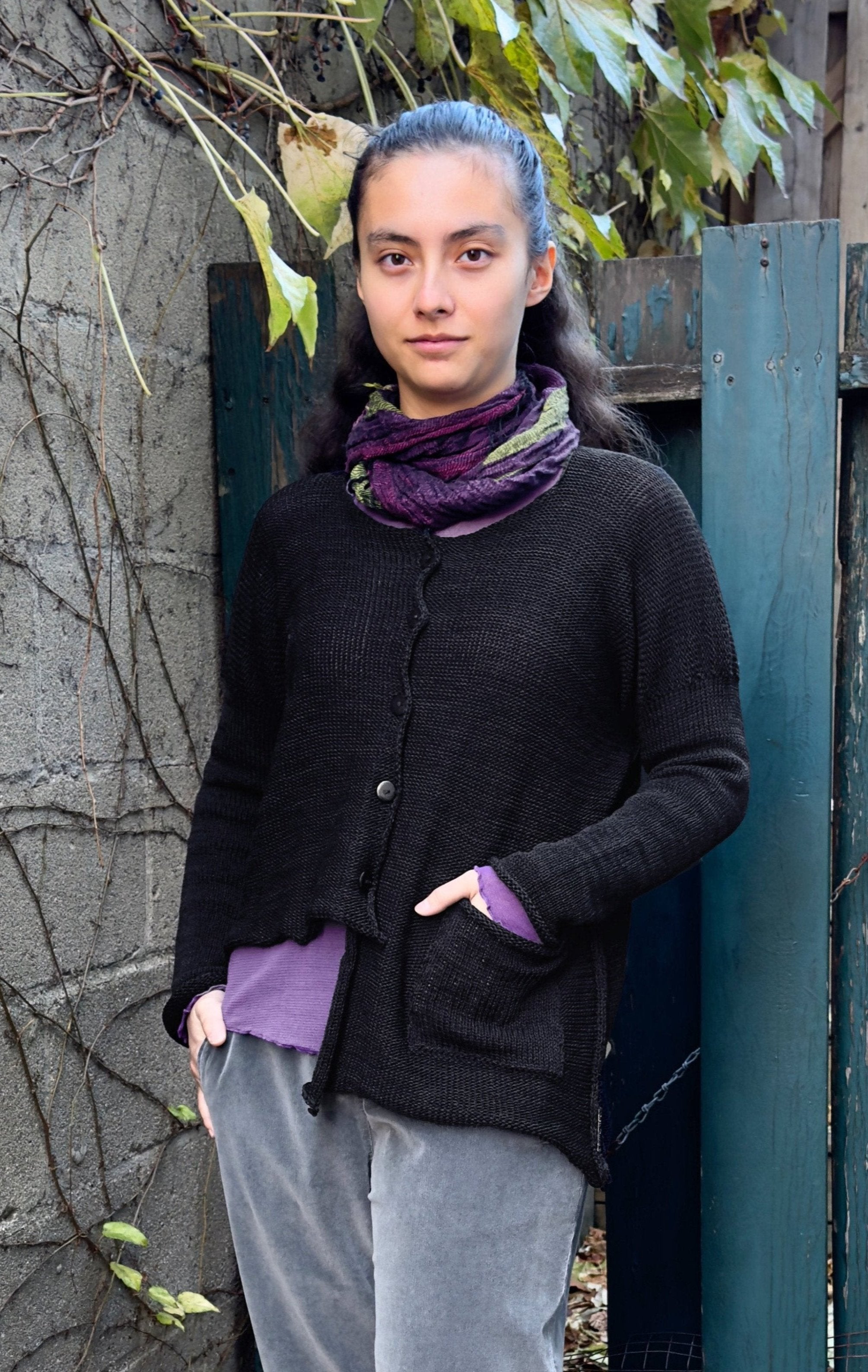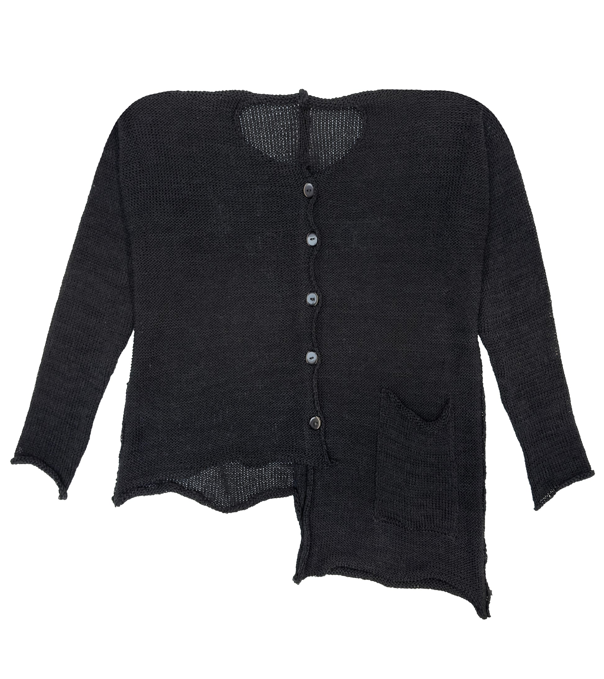 This cardigan has a five button closure at centre front with one small pocket and a seam down centre back. The left half of the front and back is 6" longer than the right side making it asymmetrical. It has dropped shoulders and long sleeves. The yarn is solid black with the knit having some give.