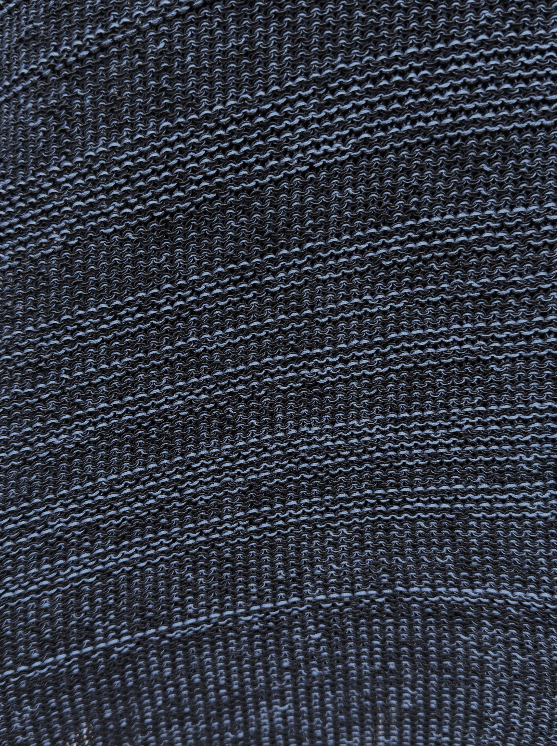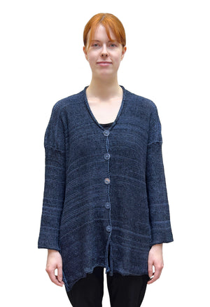 This long boxy cardigan has a button closure at centre front with a relaxed v-neck and a seam down centre back. It features dropped shoulders and long sleeves. The yarn is a mix of muted periwinkle blue and black with the knit having some give.