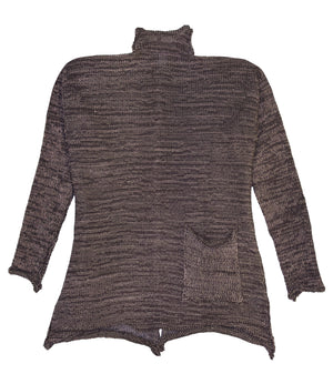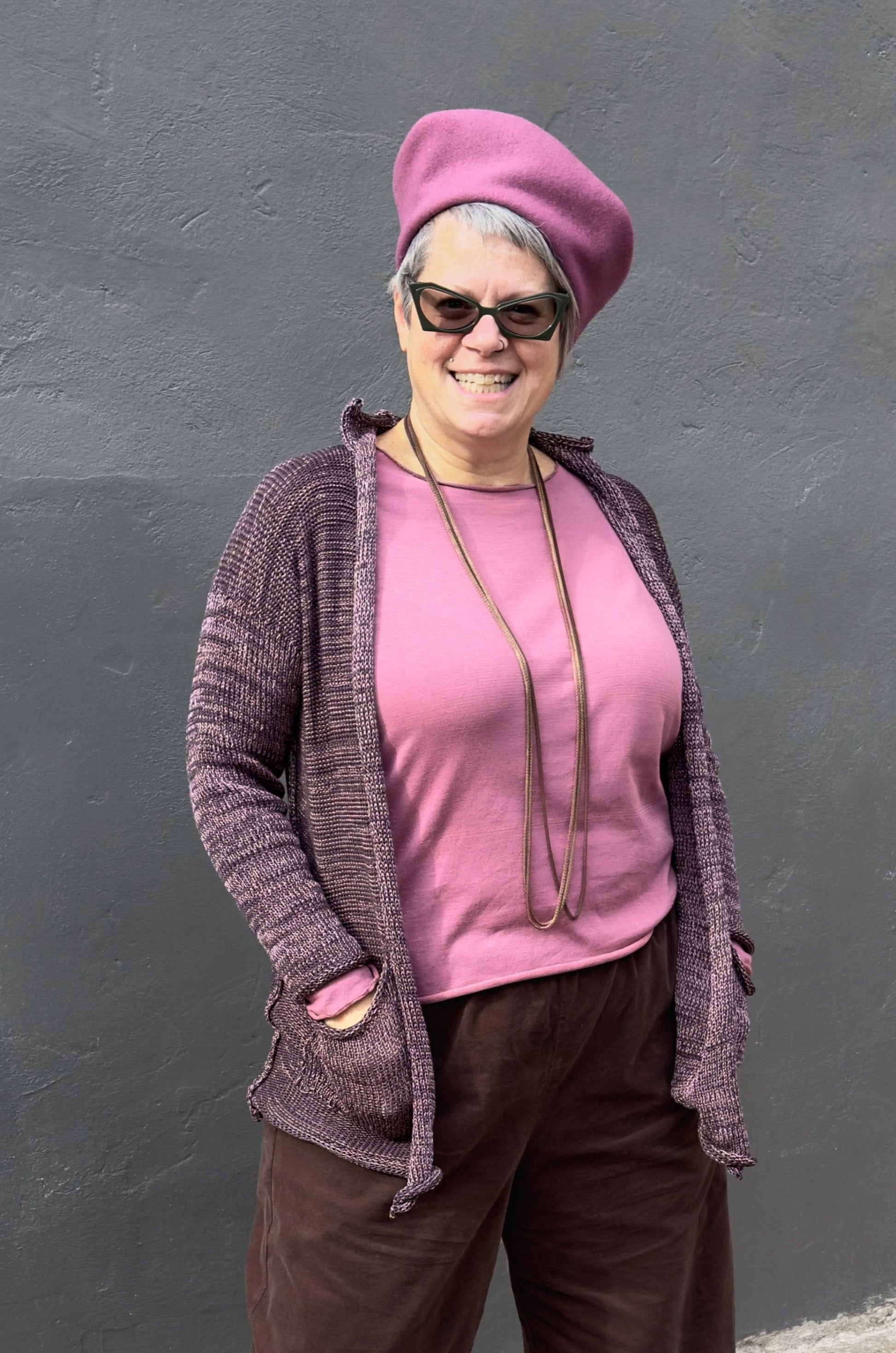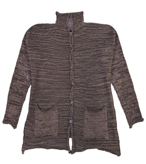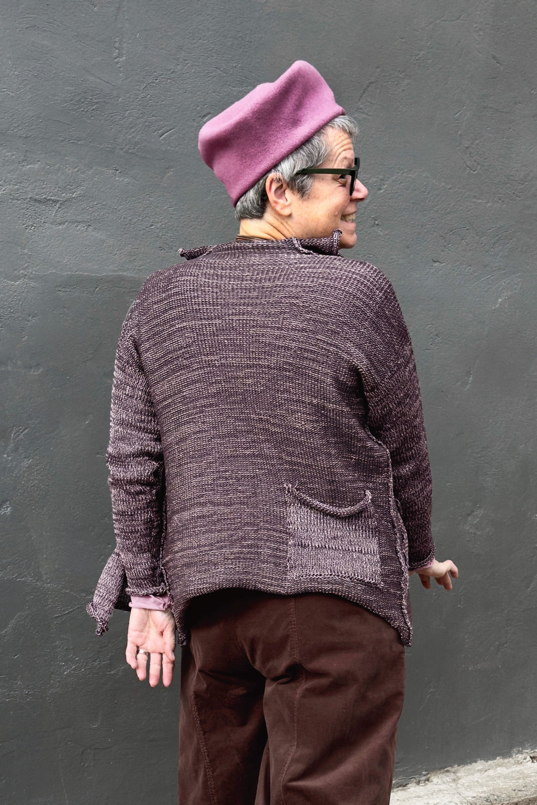 This boxy and long cardigan is made from a deep plum and mauve yarn. It has two pockets on the front and one on the back, and a relaxed high neck. It has dropped shoulders and long sleeves. The front buttons down all the way.