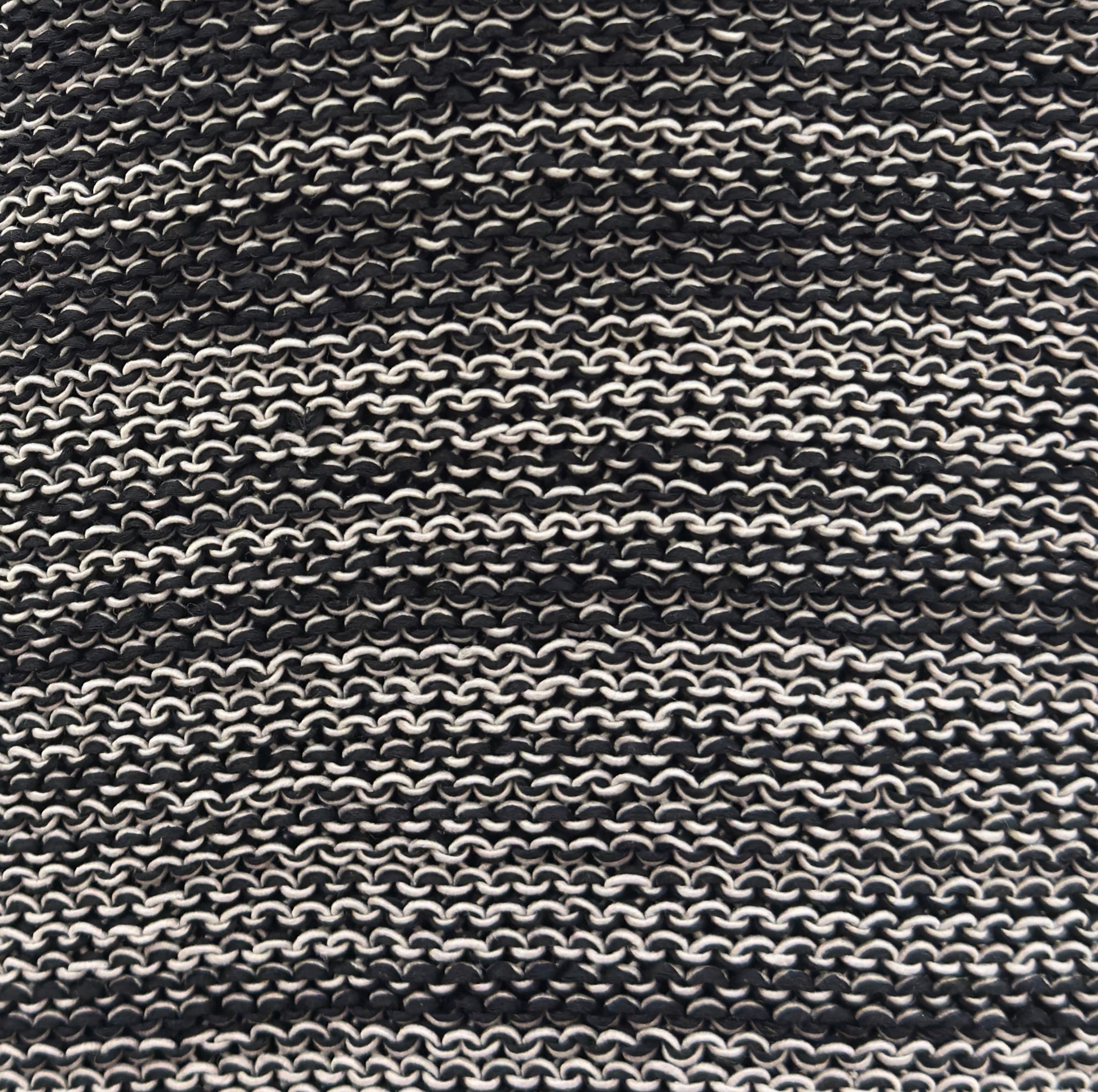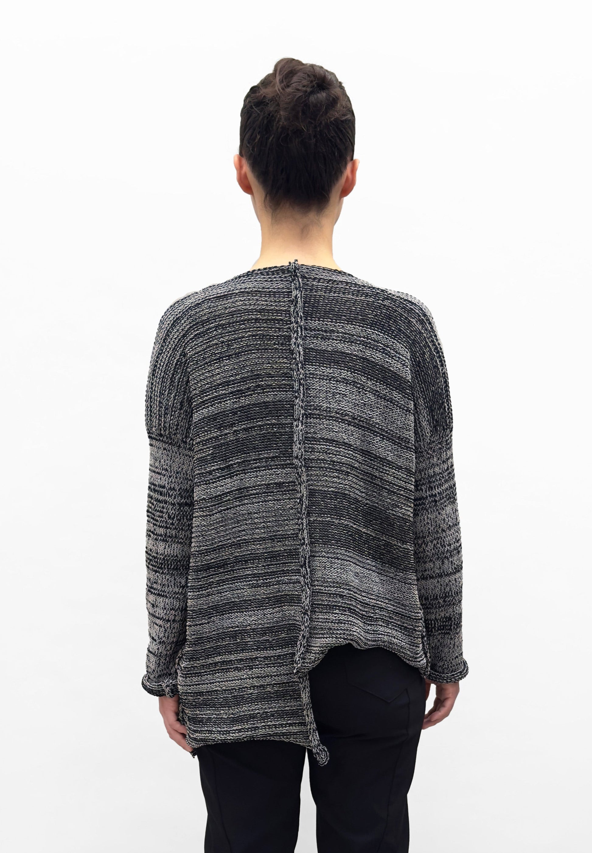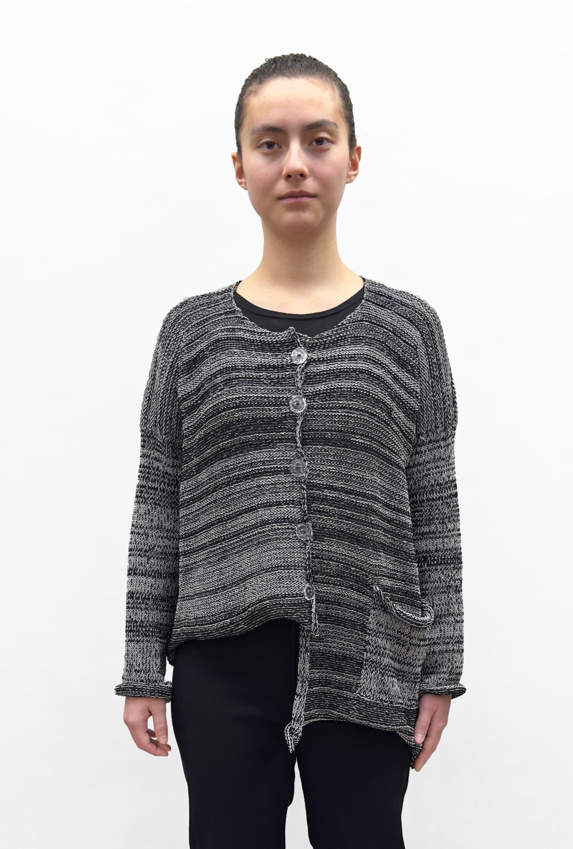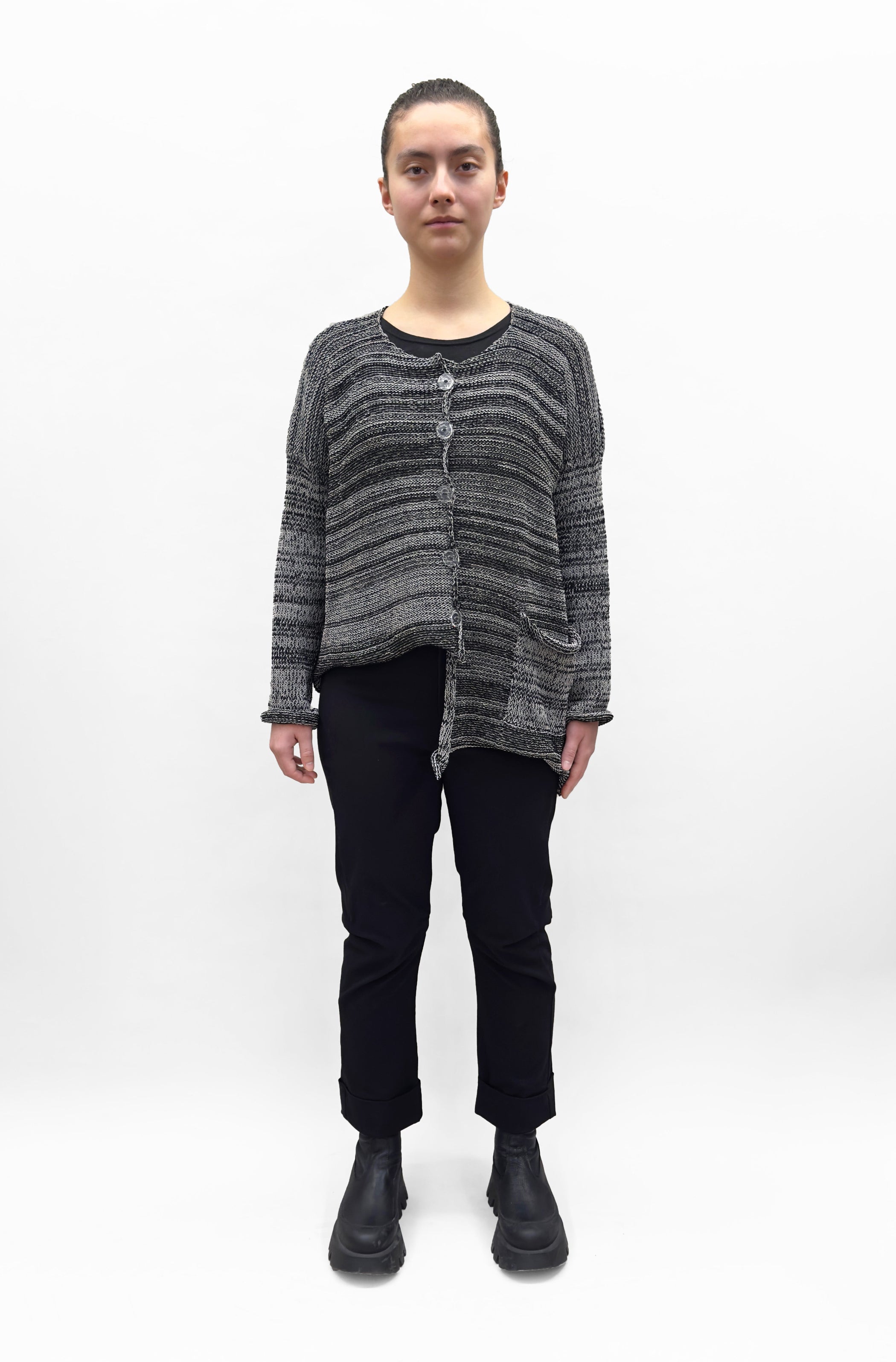 This cardigan has a five button closure at centre front with one small pocket and a seam down centre back. The left half of the front and back is 6" longer than the right side making it asymmetrical. It has dropped shoulders and long sleeves. The yarn is a mix of black and off-white with the knit having some give.