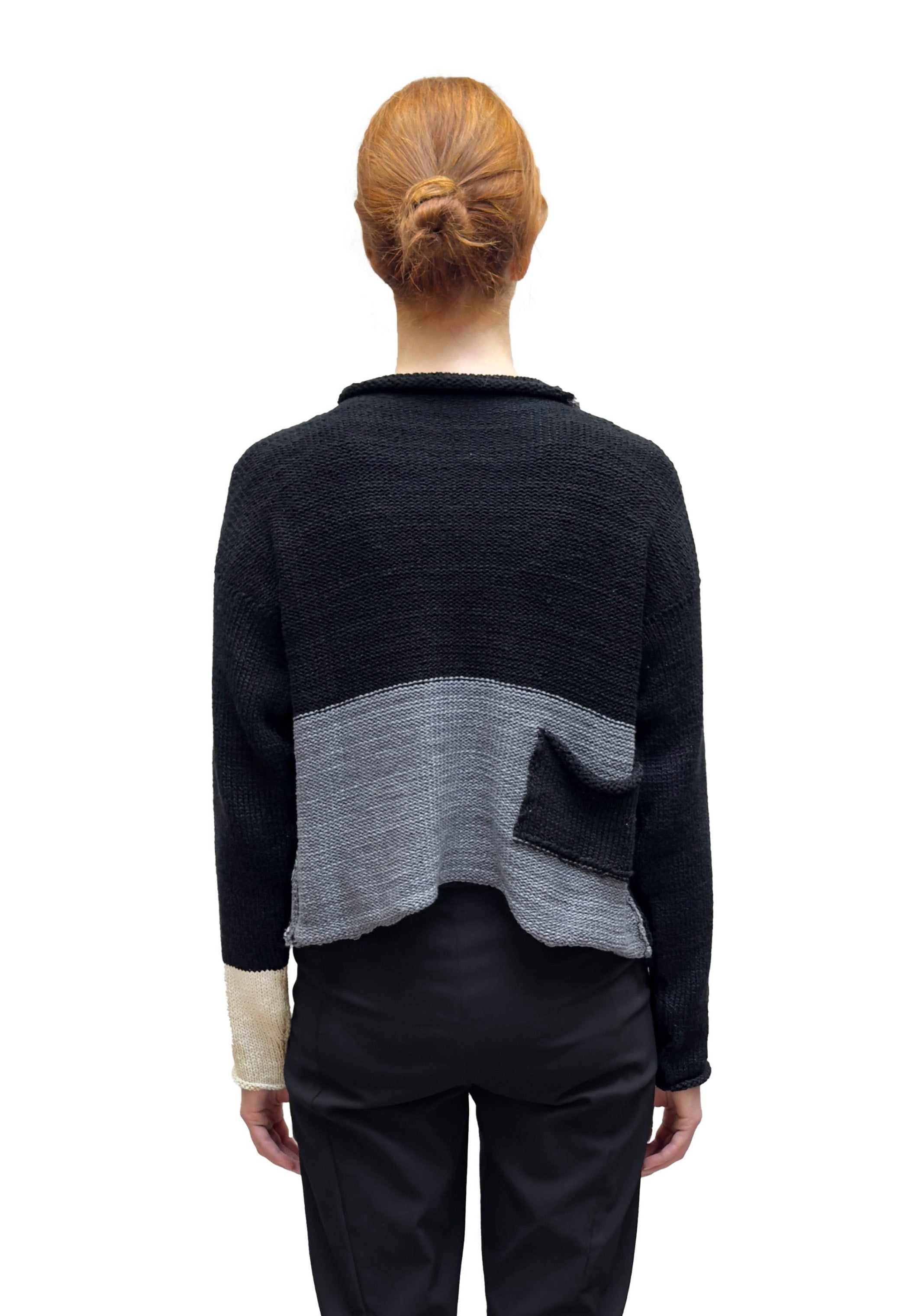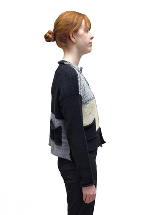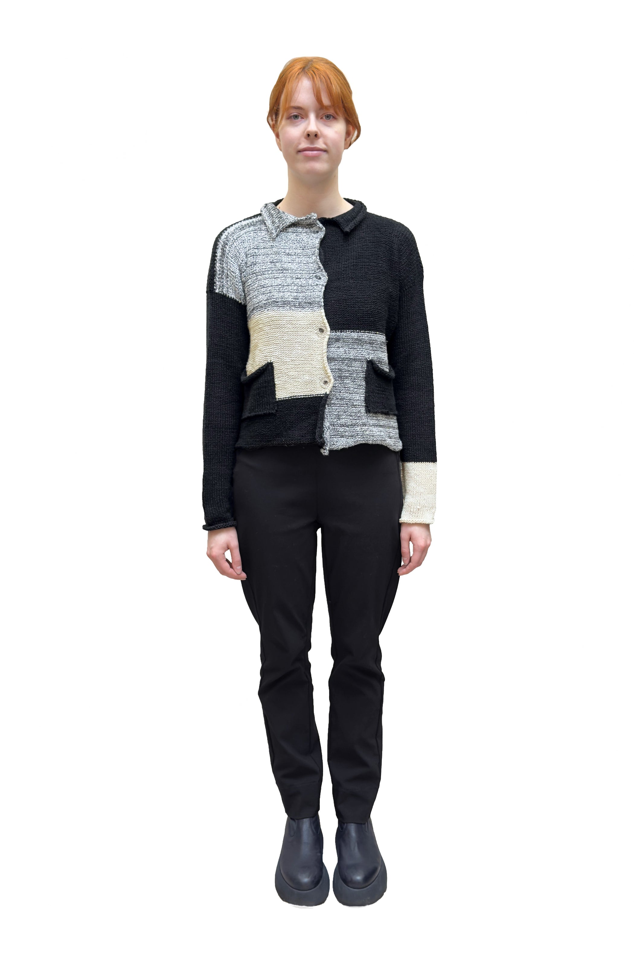 This boxy, slightly cropped, cardigan is made from a multi-tone yarn featuring stone grey, black, white and creme tones. It has two pockets on the front and one on the back, and a relaxed high neck. The front buttons down all the way.
