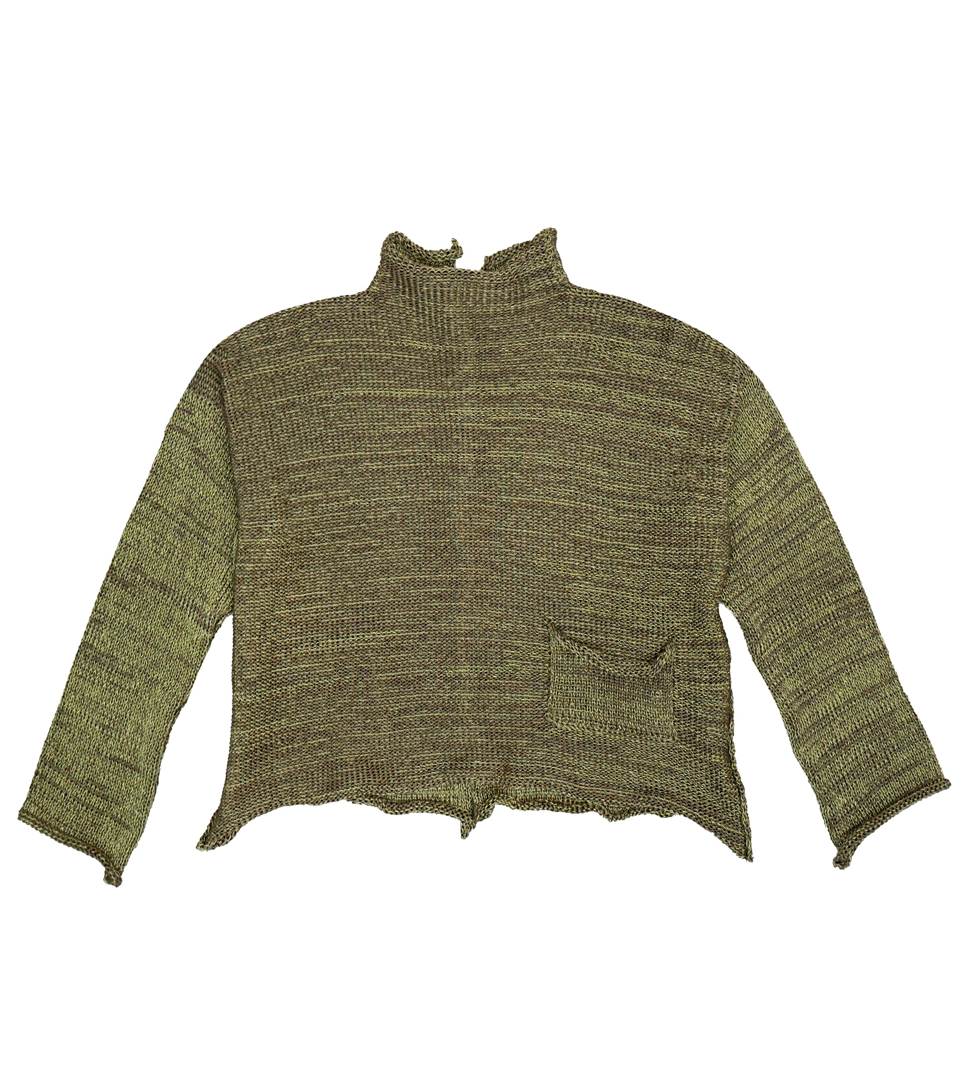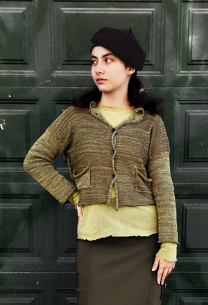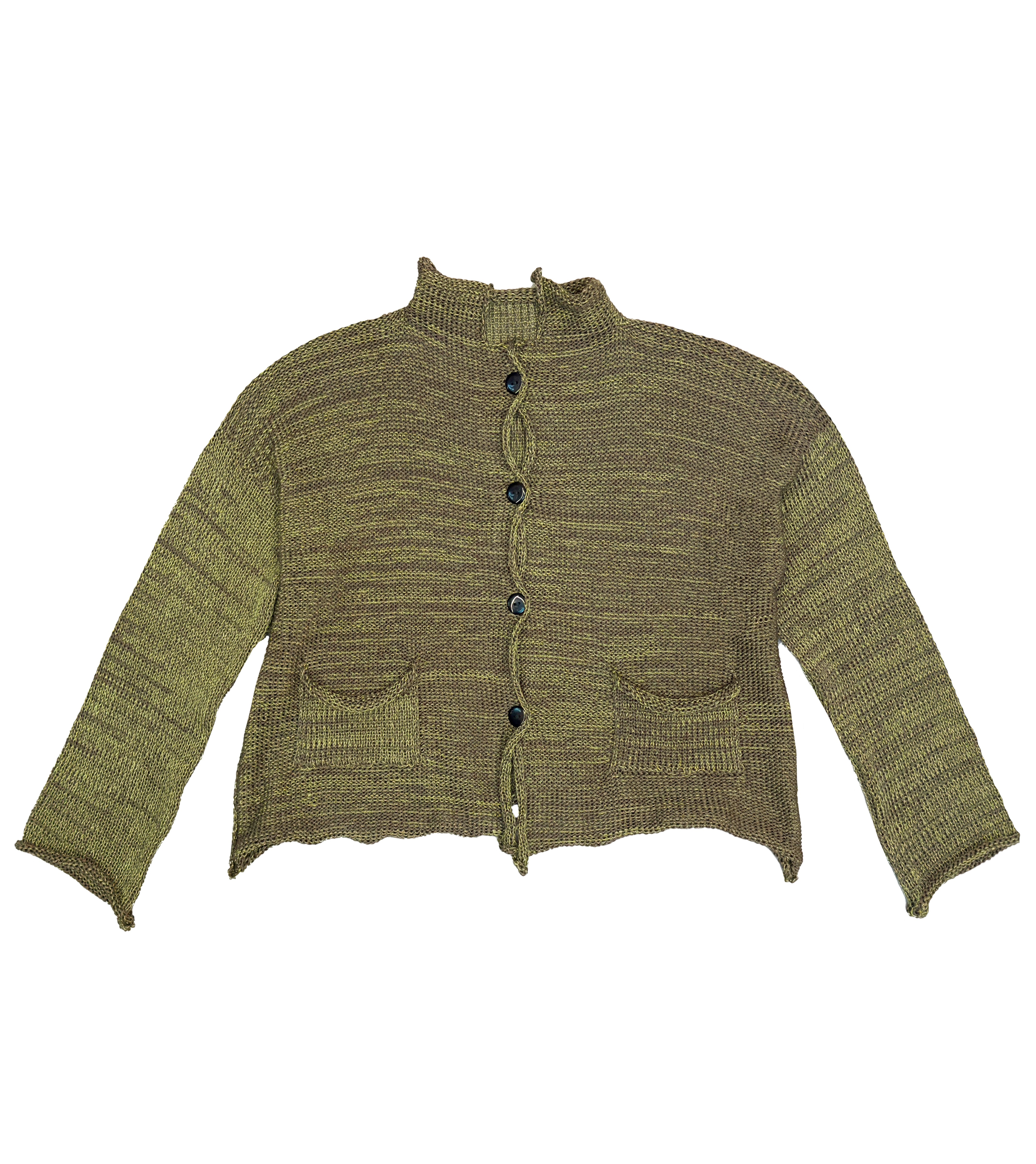 This boxy, slightly cropped, cardigan is made from a deep olive and lime green yarn. It has two pockets on the front and one on the back, and a relaxed high neck. The front buttons down all the way.