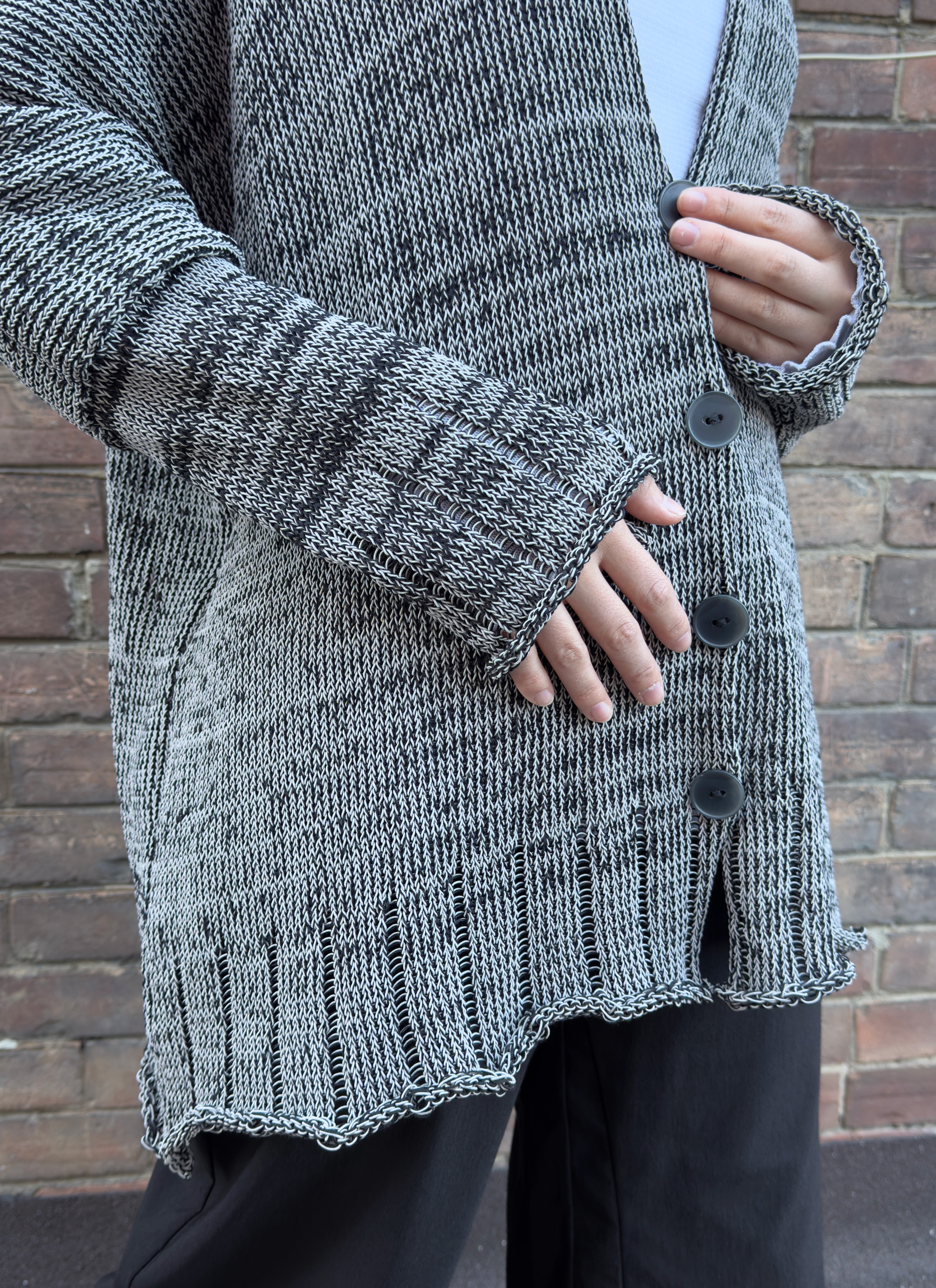 This cardigan has a relaxed knit with lots of give, and a generous fit. It buttons in front and has a V-neck with a slight roll. It has dropped shoulders and long sleeves for comfort. It features ribbing along the hem and cuffs.