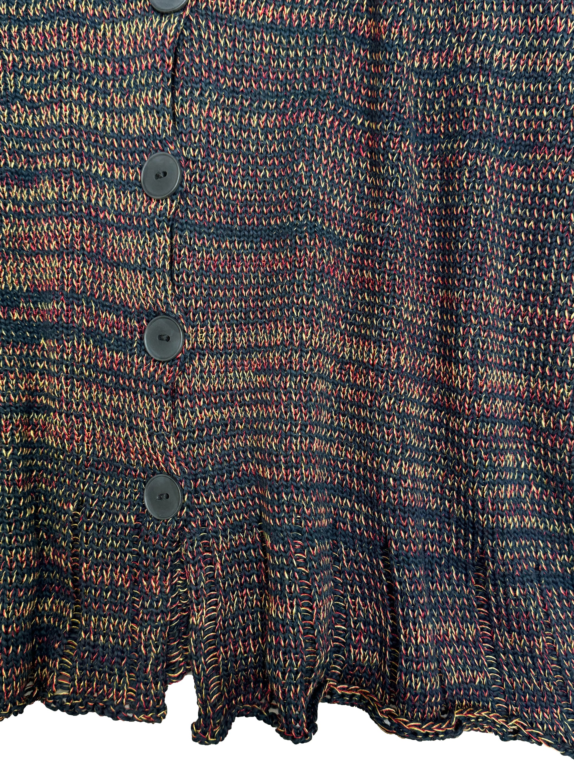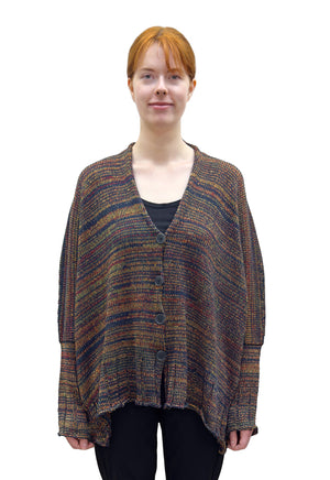 This cardigan has a relaxed knit with lots of give, and a generous fit. It buttons in front and has a V-neck with a slight roll. It has dropped shoulders and long sleeves for comfort. It features ribbing along the hem and cuffs.