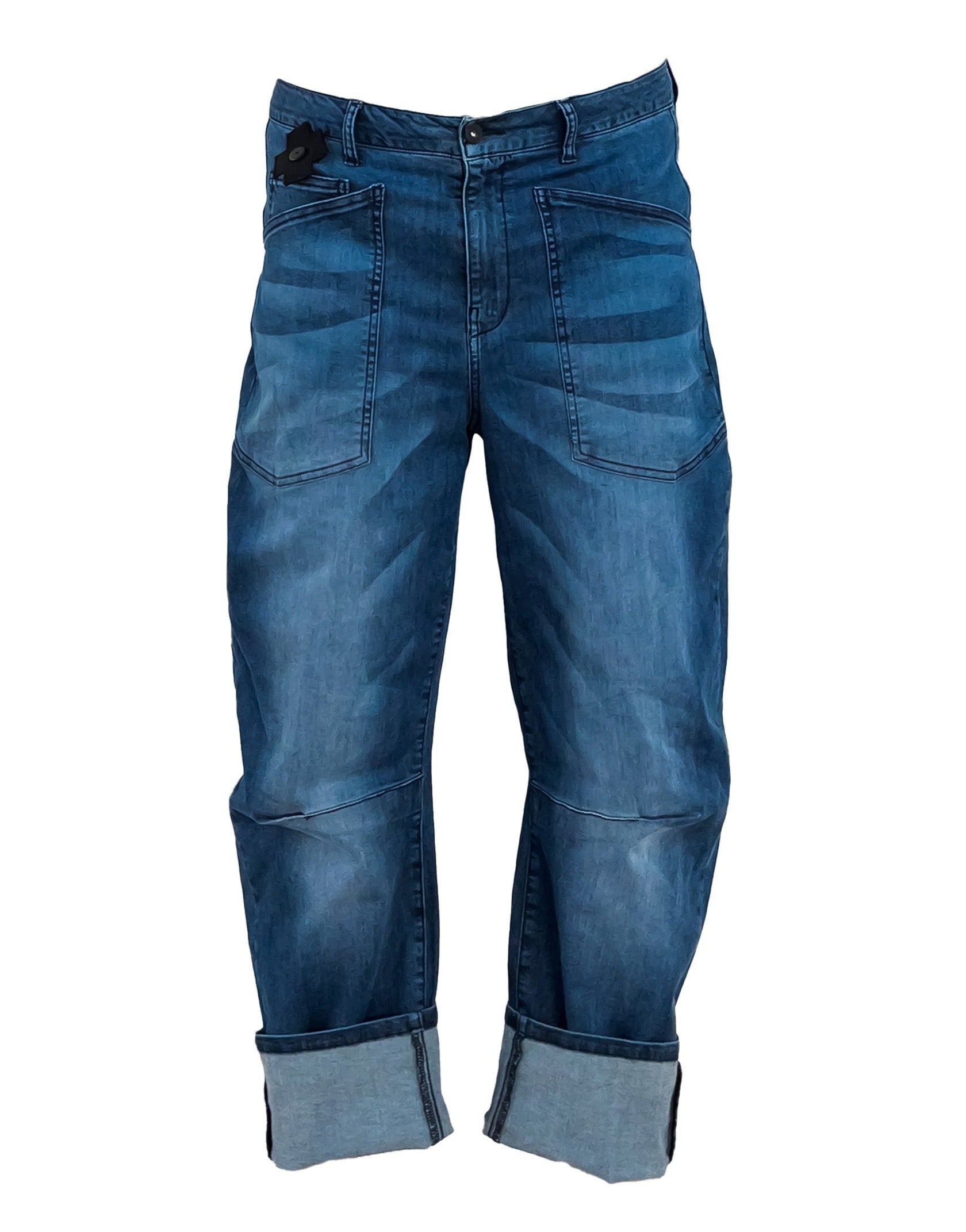 A stretchy blue denim with a zipper fly closure, belt loops, two long front pockets and two back patch pockets. It has a slight dropped rise with curved legs due to dart seams at the knees, it also features a yoke seam at the back. There is a detachable patch on the front right waist.