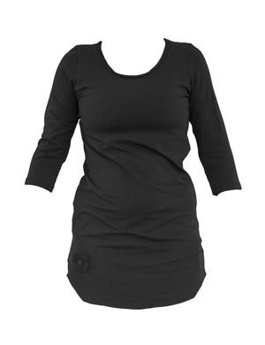 A close fitting shirt in cotton jersey, it features unfinished seams around the neck, hem and centre back seam, so that they will naturally roll. It has slim fitting 3/4 length sleeves.