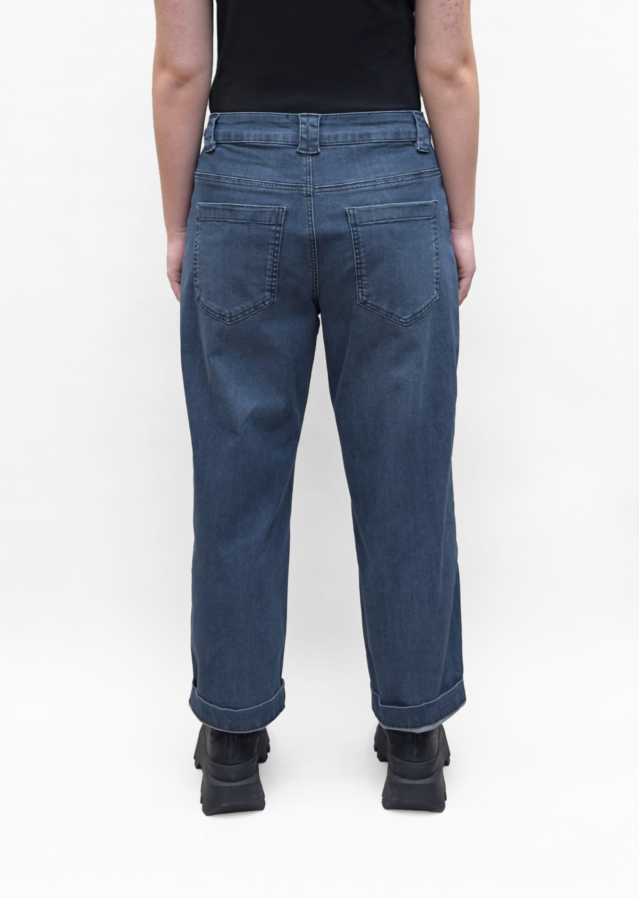 A stretchy blue denim pant with a zipper fly closure, belt loops, two front curved pockets and two back patch pockets. It features a curved leg silhouette with slanted darts at the knees and a detachable button charm below the front right waist. The cuffs can be rolled up and down for versatility.