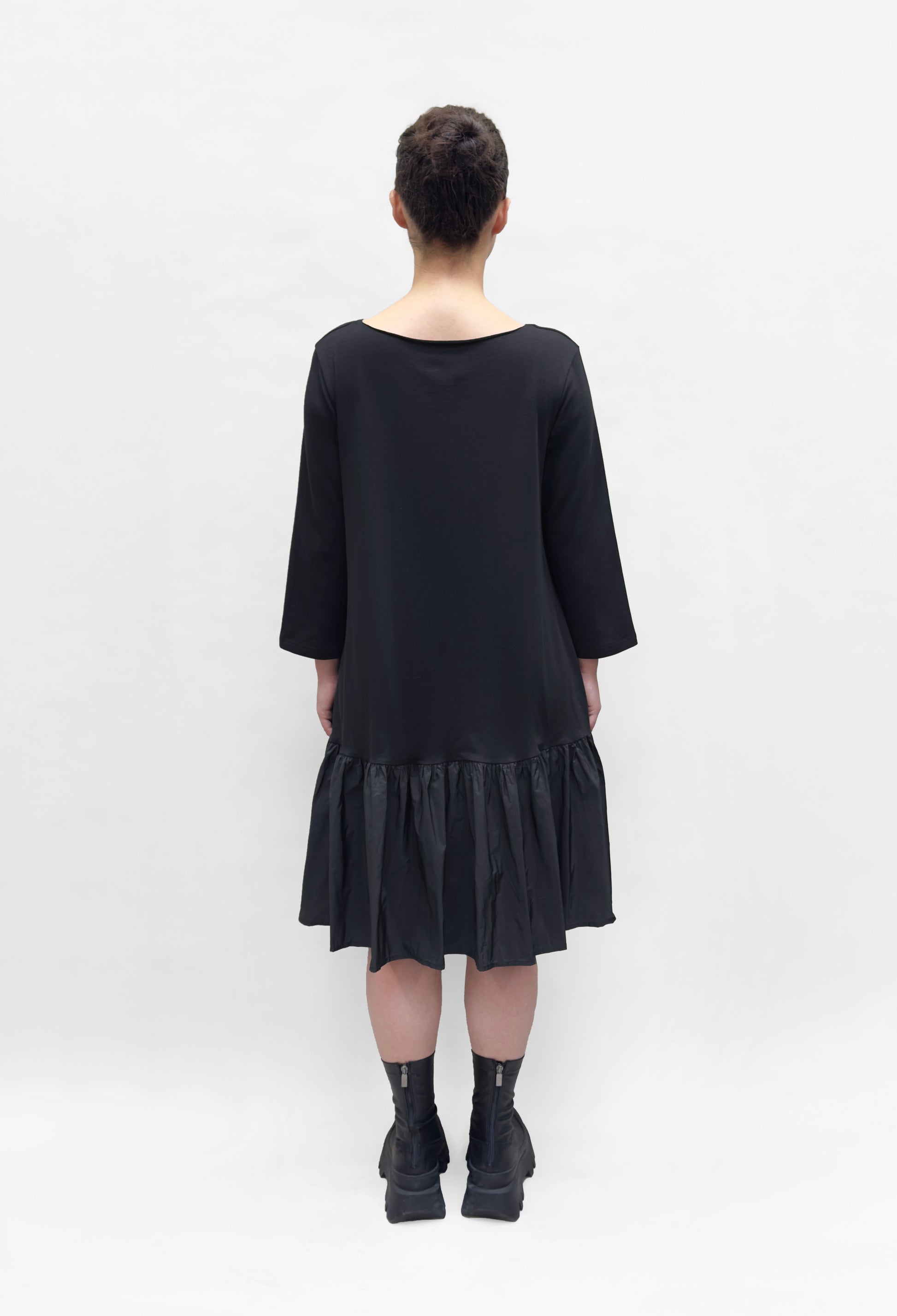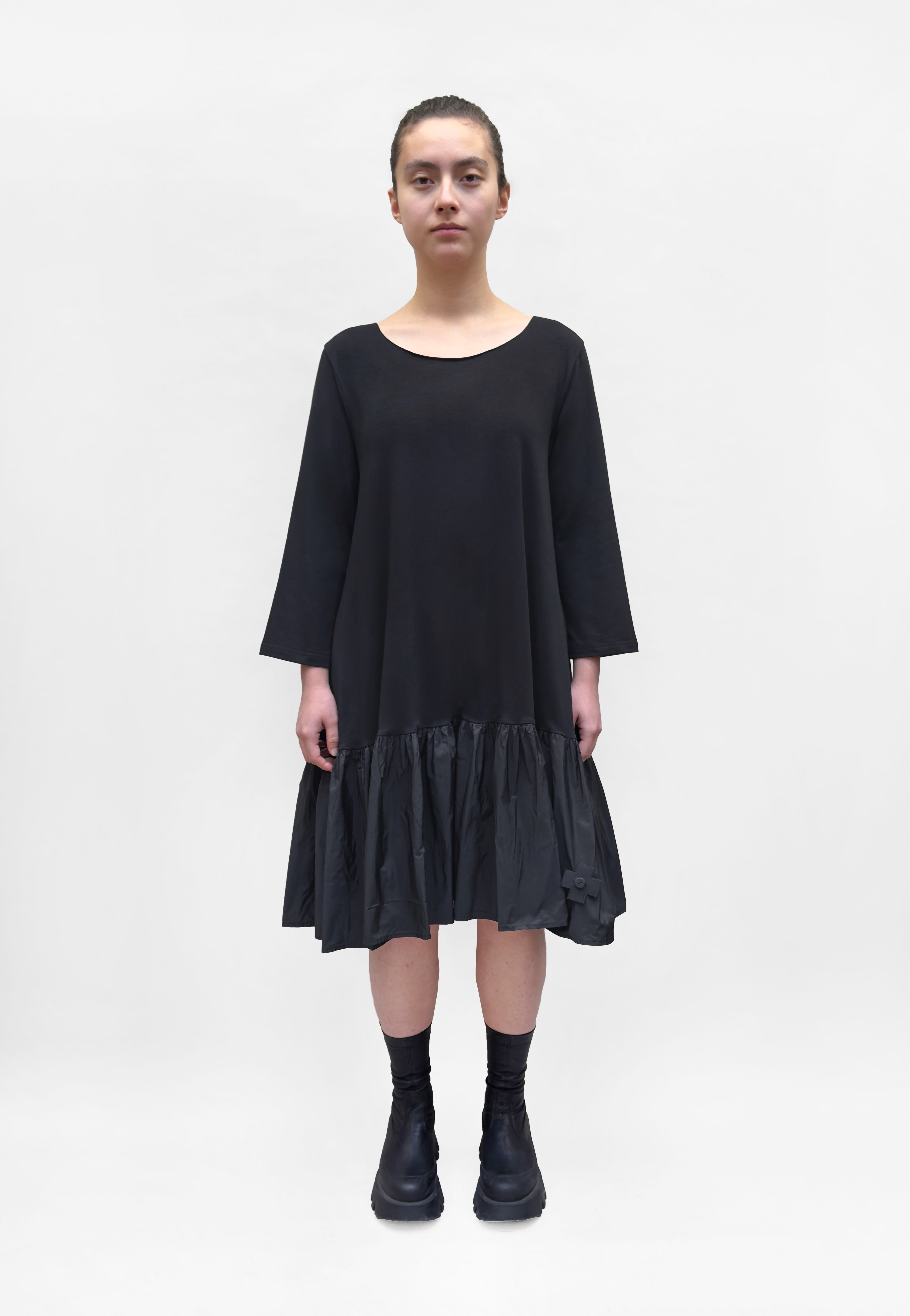 This PLU dress is crafted from a light cotton knit and features a relaxed A-line silhouette with a gathered taffeta panel at the bottom that adds flare to it. It has side seam pockets for a touch of practicality and a flattering boatneck. At the bottom left corner there is a removable, decorative button charm. An easy piece that can be dressed up and down.