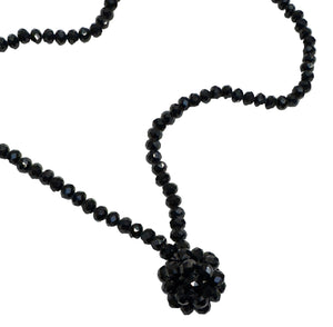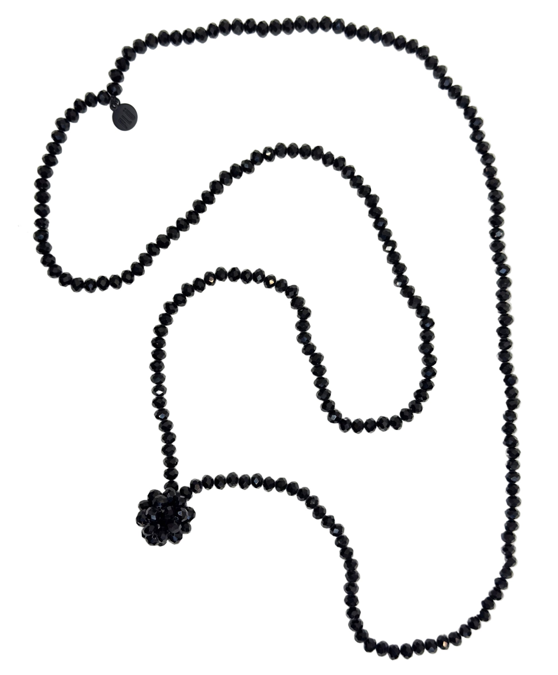 A hand beaded medium long necklace featuring a beaded marble pendant. Can be worn across the body, around the neck long, or short when doubled up.