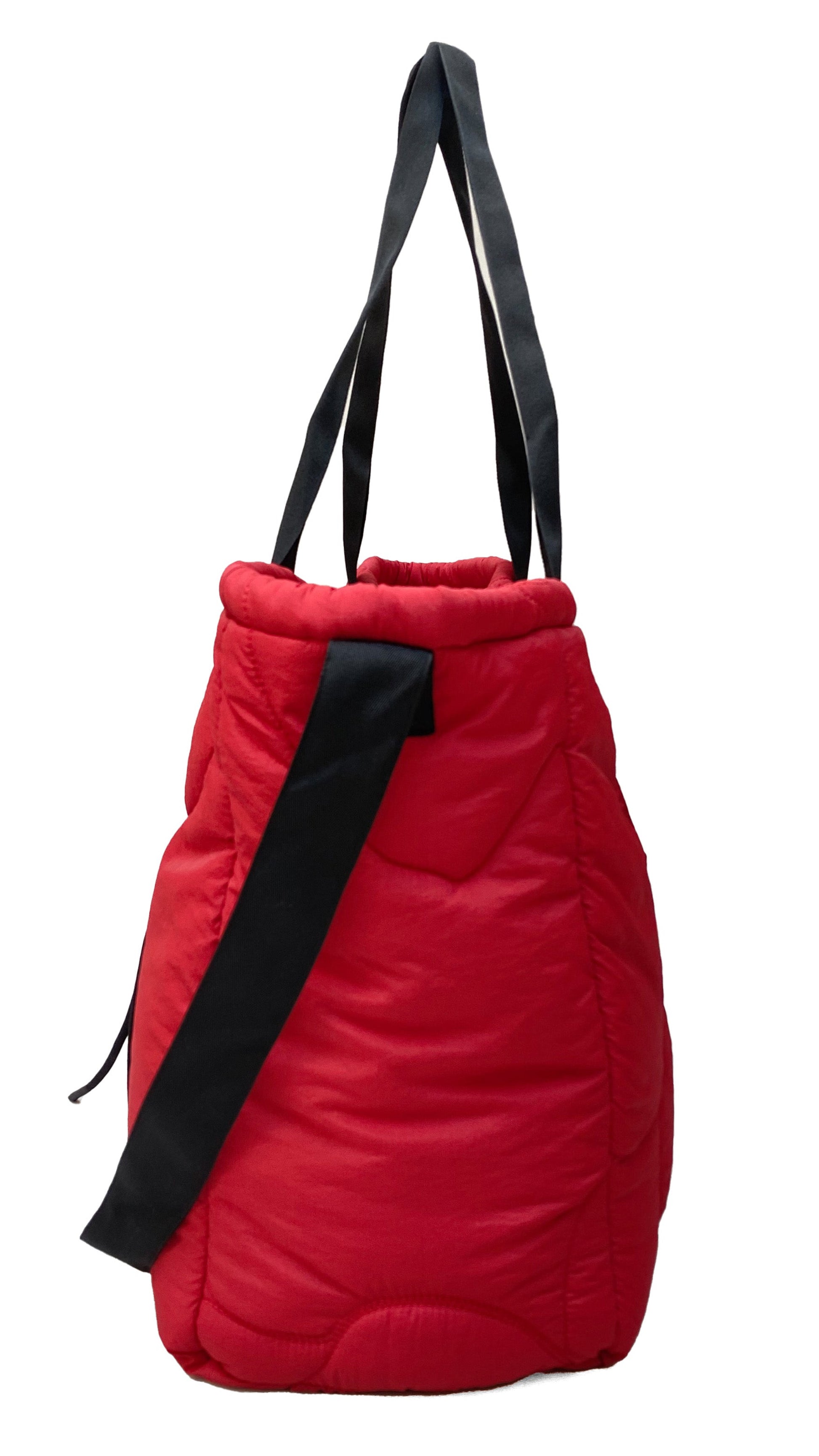 Oversized puffer tote bag with two shorter handles to be carried or worn on one shoulder, and one long strap for being worn cross-body. Featuring a quilted floral design on all sides, a zippered pocket at the centre back, and a toggled adjustable drawstring around the top hem.