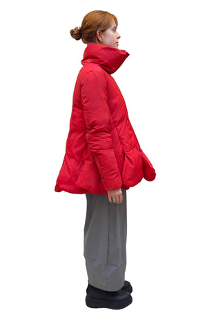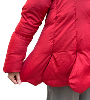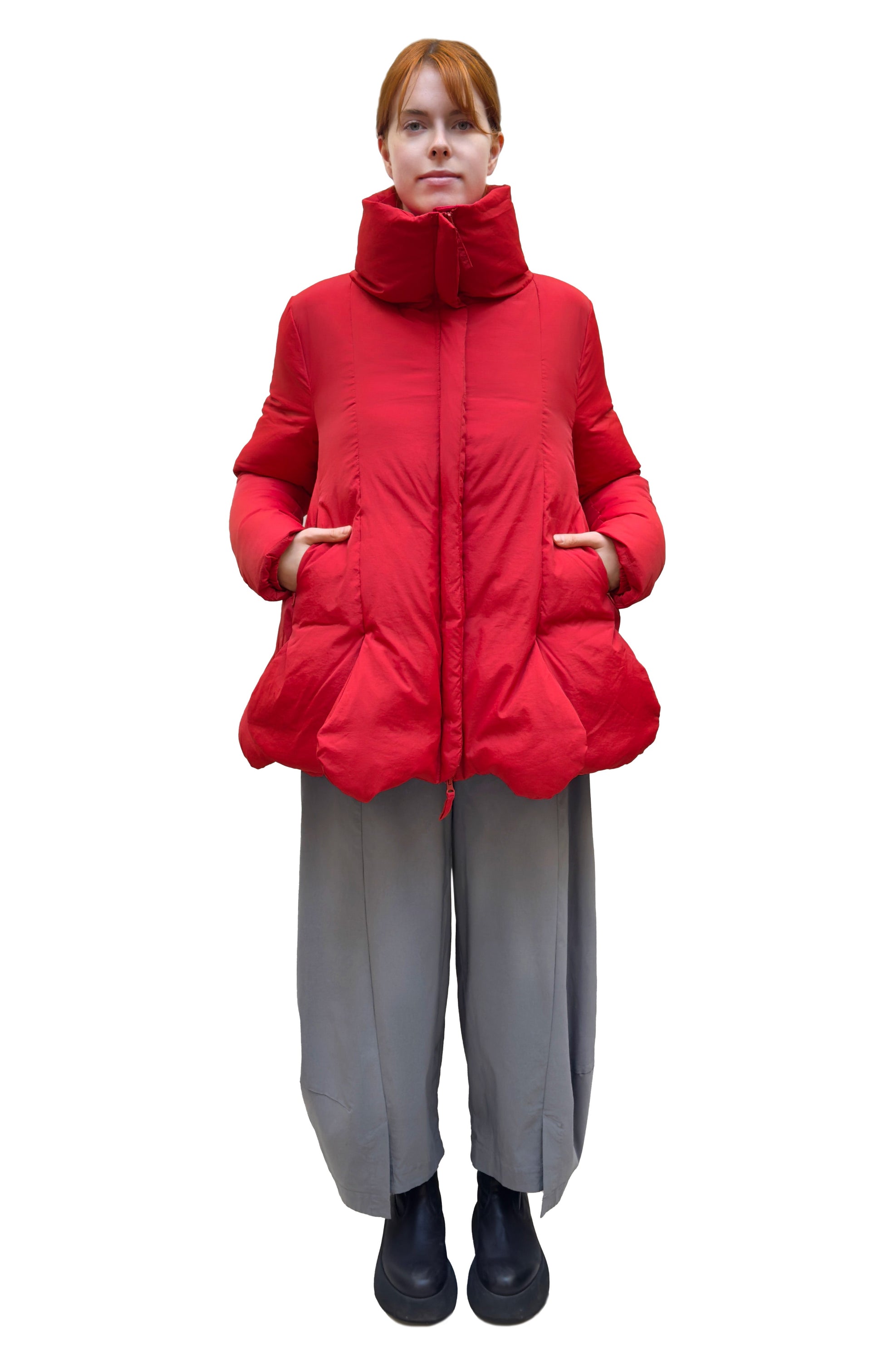 A fabulous A-line down jacket, that flares at the hip with heart-shaped petals along the bottom. Featuring a high neckline, elasticized storm cuffs, a 2-way covered zipper closure, and 2 front invisible zippered pockets in-set into the outer front seams. Also includes inner shoulder straps to be worn like a backpack indoors.