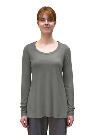 A soft knit t-shirt featuring an A-line silhouette, made from a lyocell blend for a comfortable and breathable fit. Featuring long set-in sleeves and a high round neckline. A classic versatile piece perfect for layering in all seasons.