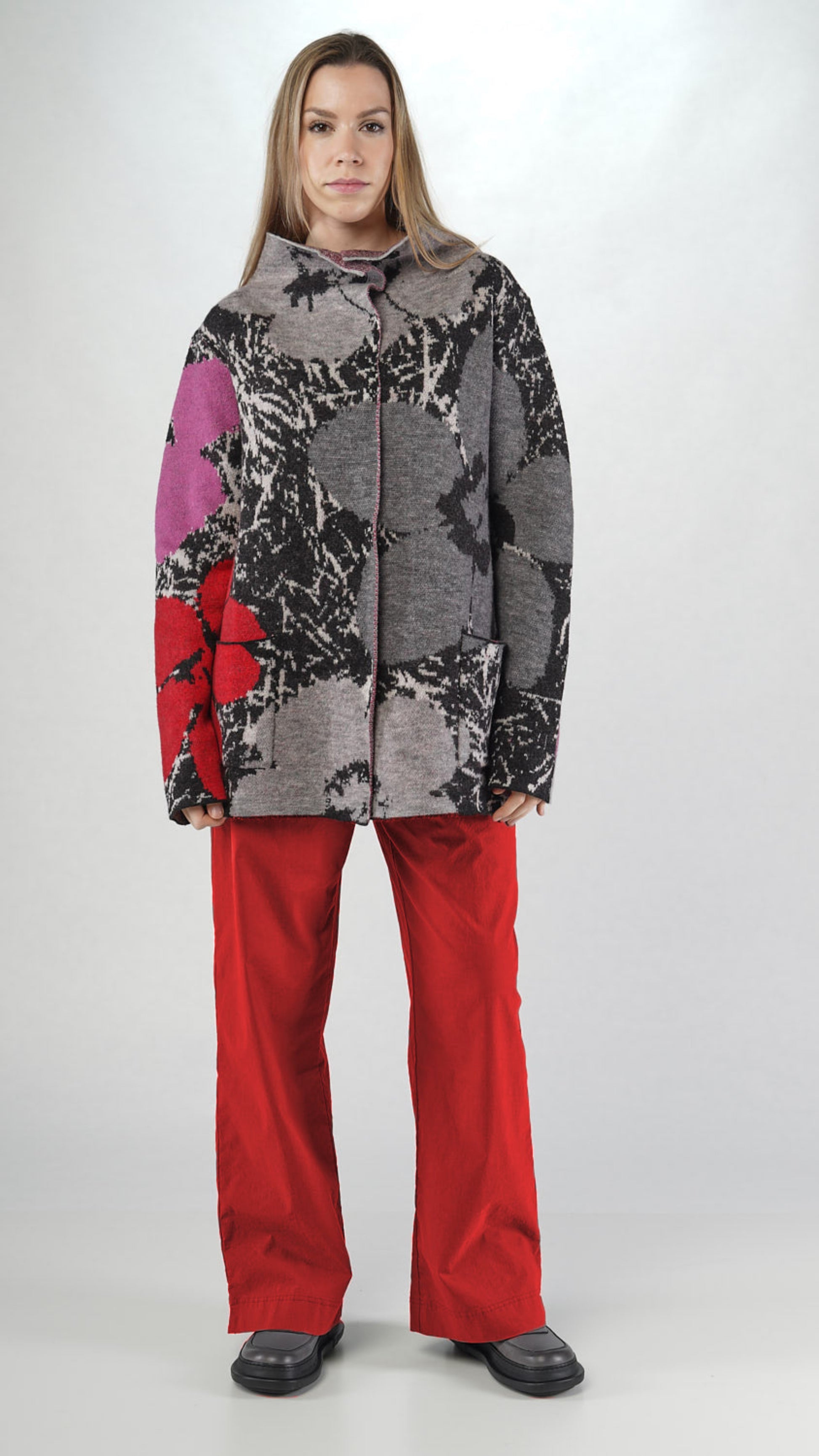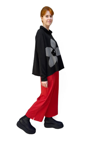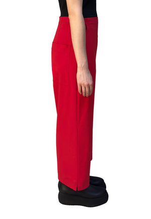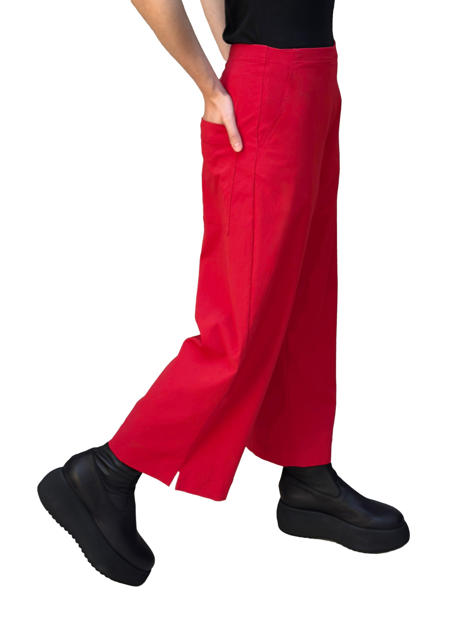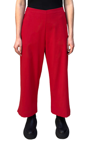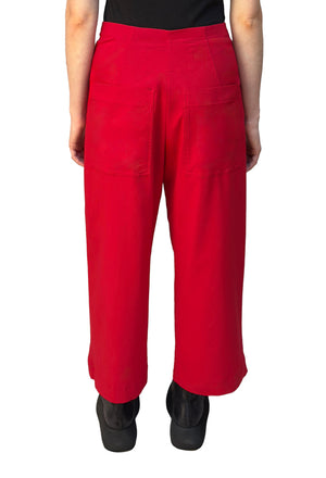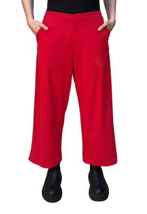A wide-leg pant in an elastic stretch blend featuring a small ribbed texture. It is a regular-rise, pull-on pant with a flat front waist and elasticized back. This pant has slash pockets at the front and two large patch pockets at the back. It falls to the ankle in length.