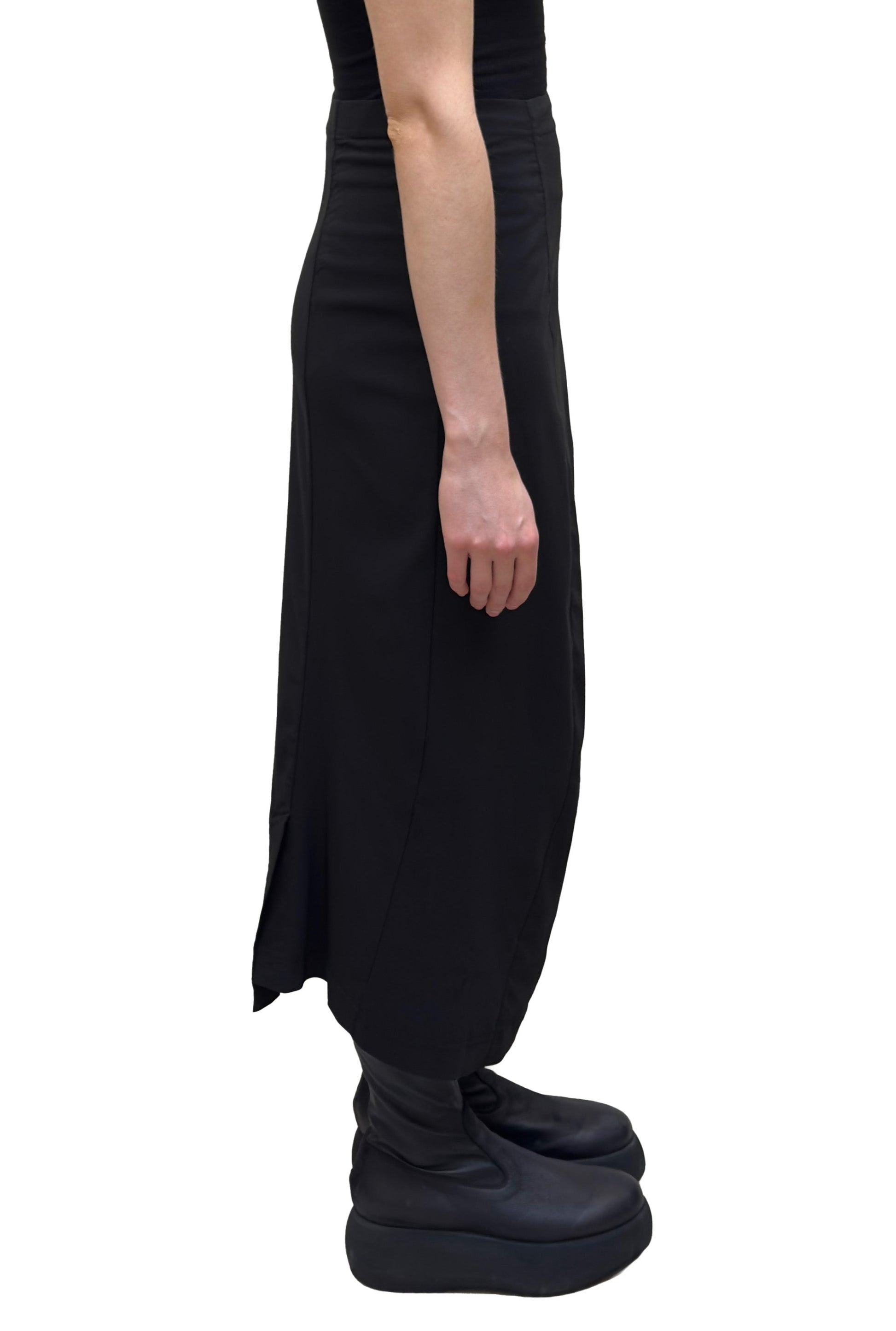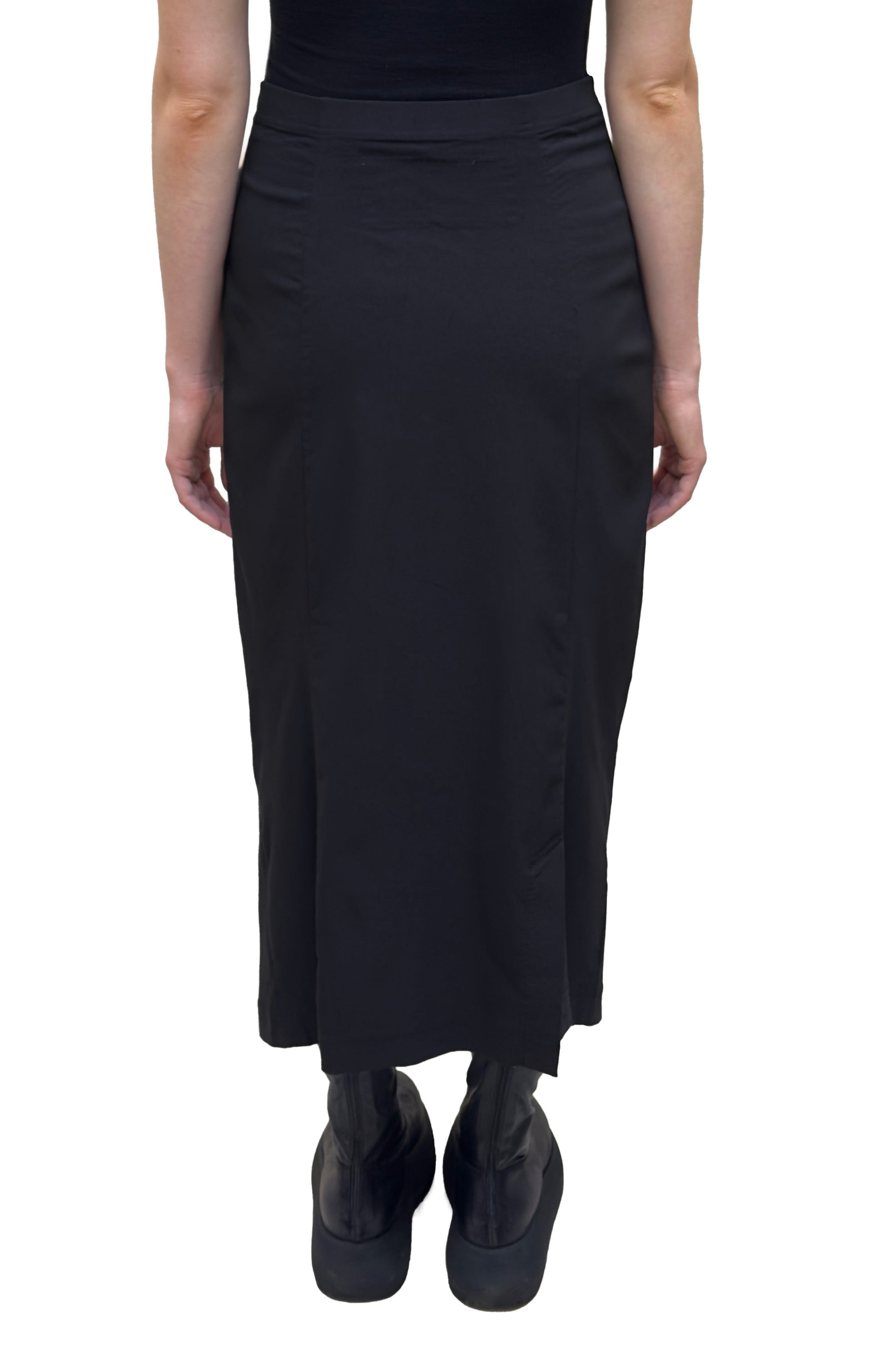 A variation on a pencil skirt, this piece has 2 front seams, a flat, pull on waistband, and sits a few inches above the ankle in length. It is made with Black Label’s technical stretch fabric.