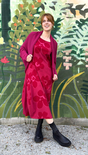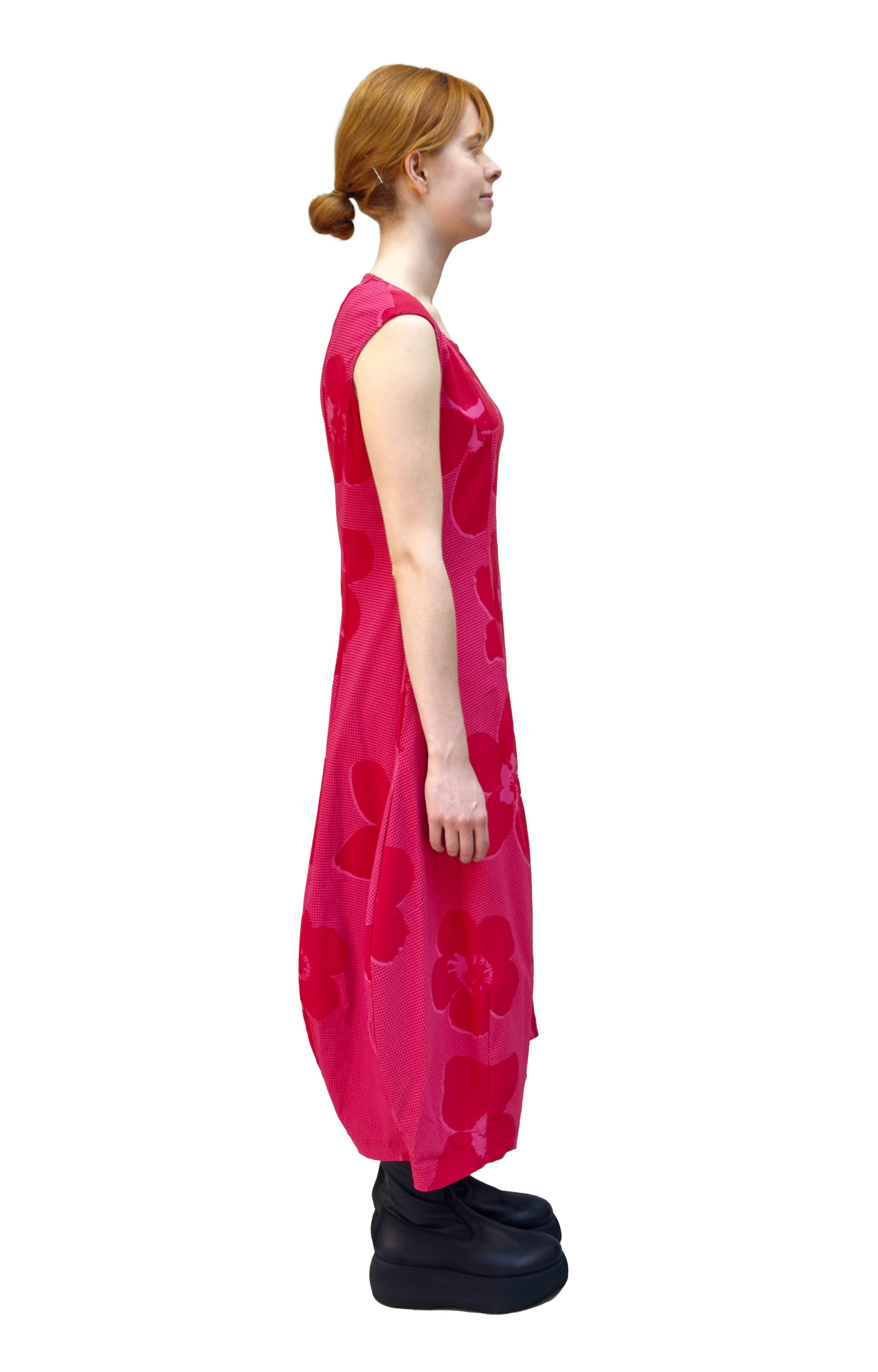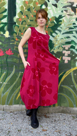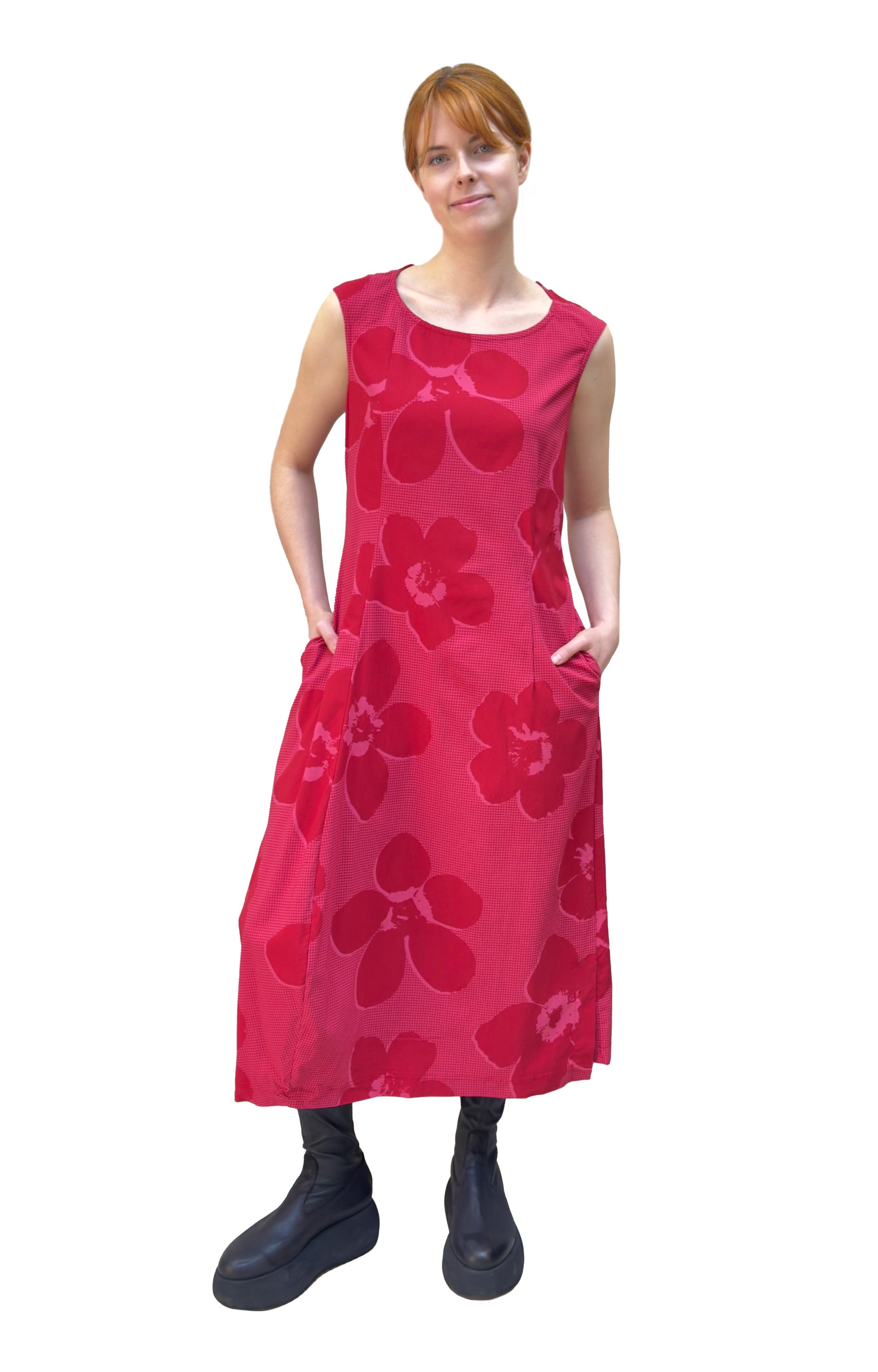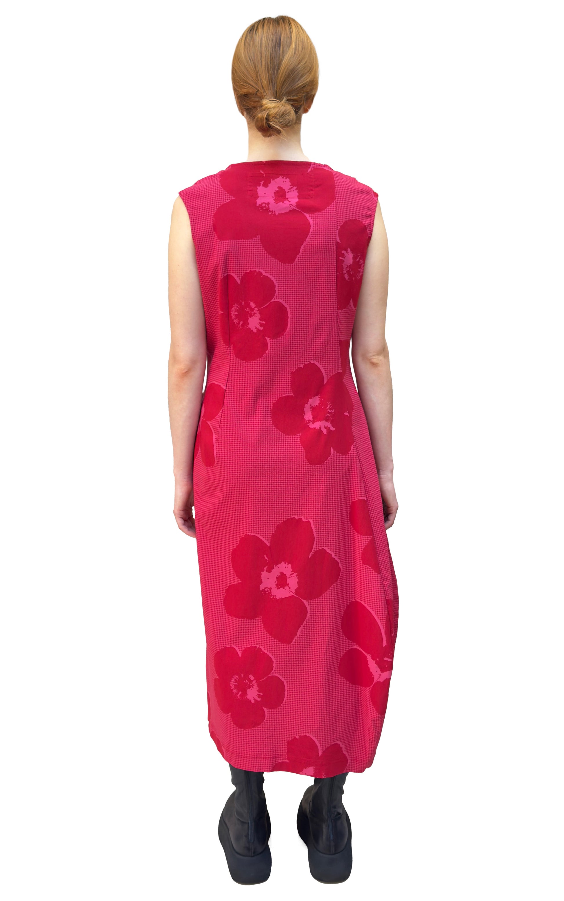 This gorgeous sleeveless full-length dress from Rundholz Black Label features a vivid floral and micro-houndstooth pattern. The in-set pockets, tailored darts and slight bubble shape make this piece both incredibly flattering and functional. A must have!